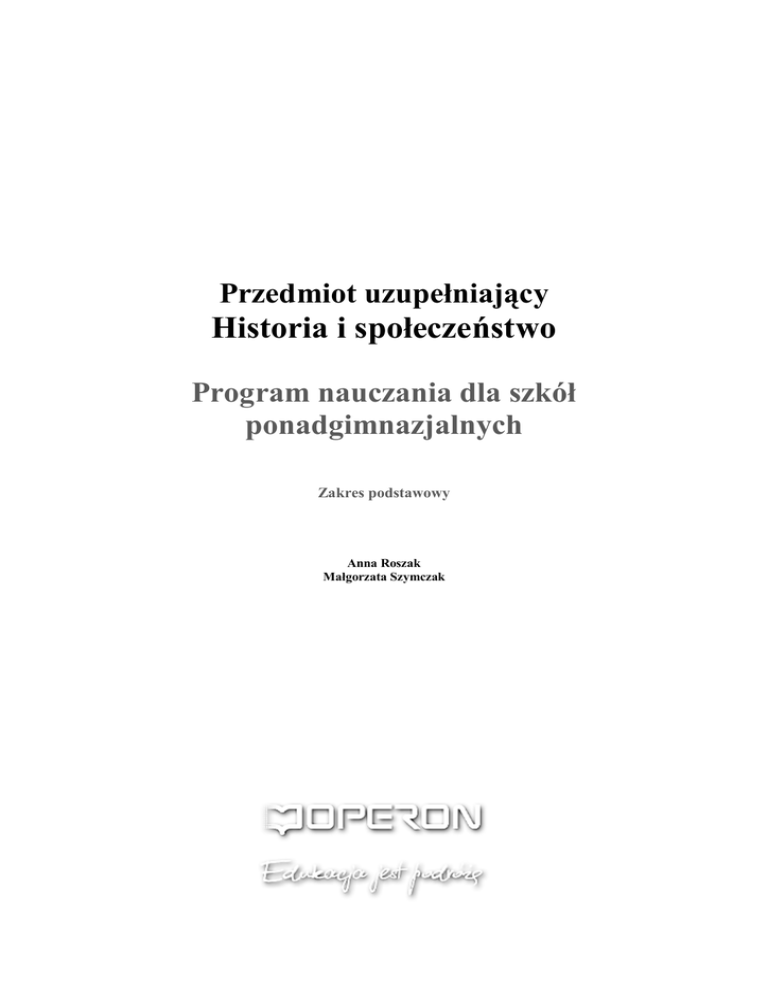 Przedmiot uzupełniający Historia i społeczeństwo Program nauczania dla szkół ponadgimnazjalnych Zakres podstawowy Anna Roszak Małgorzata Szymczak Spis treści 1. Wstęp 2. Cele kształcenia – wymagania ogólne 3. Europa i świat 3.1. Cele kształcenia i wychowania 3.2. Treści nauczania 3.3. Opis założonych osiągnięć i kompetencji ucznia 3.4. Bibliografia wybranych opracowań do wątku Europa i świat 4. Język, komunikacja i media 4.1. Cele kształcenia i wychowania 4.2. Treści nauczania 4.3. Opis założonych osiągnięć i kompetencji ucznia 4.4. Bibliografia wybranych opracowań do wątku Język, komunikacja i media 5. Kobieta i mężczyzna, rodzina 5.1. Cele kształcenia i wychowania 5.2. Treści nauczania 5.3. Opis założonych osiągnięć i kompetencji ucznia 5.4. Bibliografia wybranych opracowań do wątku Kobieta i mężczyzna, rodzina 6. Nauka 6.1. Cele kształcenia i wychowania 6.2. Treści nauczania 6.3. Opis założonych osiągnięć i kompetencji ucznia 6.4. Bibliografia wybranych opracowań do wątku Nauka 7. Swojskość i obcość 7.1. Cele kształcenia i wychowania 7.2. Treści nauczania 7.3. Opis założonych osiągnięć i kompetencji ucznia 7.4. Bibliografia wybranych opracowań do wątku Swojskość i obcość 8. Gospodarka 8.1. Cele kształcenia i wychowania 8.2. Treści nauczania 8.3. Opis założonych osiągnięć i kompetencji ucznia 8.4. Bibliografia wybranych opracowań do wątku Gospodarka 9. Rządzący i rządzeni 9.1. Cele kształcenia i wychowania 9.2. Treści nauczania 9.3. Opis założonych osiągnięć i kompetencji ucznia 9.4. Bibliografia wybranych opracowań do wątku Rządzący i rządzeni 10. Wojna i wojskowość 10.1. Cele kształcenia i wychowania 10.2. Treści nauczania 10.3. Opis założonych osiągnięć i kompetencji ucznia 10.4. Bibliografia wybranych opracowań do wątku Wojna i wojskowość 11. Ojczysty Panteon i ojczyste spory 11.1. Cele kształcenia i wychowania 11.2. Treści nauczania 11.3. Opis założonych osiągnięć i kompetencji ucznia 11.4. Bibliografia wybranych opracowań do wątku Ojczysty Panteon i ojczyste spory 12. Sposoby osiągania celów kształcenia i wychowania 12.1. Proponowane metody pracy 12.2. Dostosowanie wymagań edukacyjnych 12.3. Praca z uczniem szczególnie uzdolnionym 13. Metody sprawdzania osiągnięć ucznia 14. Propozycje kryteriów oceny 15. Bibliografia wybranych opracowań i artykułów dydaktycznych i metodycznych 15.1. Literatura i źródła podstawowe 15.2. Literatura i źródła uzupełniające 3 5 6 6 6 10 11 13 13 13 17 18 20 20 20 23 25 28 28 28 31 32 34 34 34 37 39 41 41 42 45 47 48 48 49 52 54 55 55 55 58 60 63 63 64 68 71 73 73 79 81 83 84 88 88 88 2 1. Wstęp Program nauczania obowiązkowego przedmiotu uzupełniającego Historia i społeczeństwo. Dziedzictwo epok jest propozycją przeznaczoną dla uczniów na IV etapie edukacyjnym. Został przygotowany zgodnie z celami i treściami kształcenia określonymi w Rozporządzeniu Ministra Edukacji Narodowej z dnia 23 grudnia 2008 roku w sprawie podstawy programowej wychowania przedszkolnego oraz kształcenia ogólnego w poszczególnych typach szkół (Dz. U. z 2009 roku, nr 4, poz. 17). Przedmiot Historia i społeczeństwo dotyczy uczniów, którzy wybierają kształcenie w zakresie rozszerzonym z przedmiotów ścisłych i przyrodniczych. Twórcy podstawy zaznaczają: „Celem zajęć jest pokazanie uczniowi zainteresowanemu naukami matematycznymi i przyrodoznawstwem, że wiedza humanistyczna może stanowić klucz do rozumienia świata współczesnego i pomaga w autoidentyfikacji w świecie (…)”1. Problemy przedstawione uczniom do analizy zostały pogrupowane w zestawy tematyczne: Epoka Tematy zajęć 1. Europa i świat 2. Język, komunikacja i media 3. Kobieta i mężczyzna, rodzina 4. Nauka 5. Swojskość i obcość 6. Gospodarka 7. Rządzący i rządzeni 8. Wojna i wojskowość 9. Ojczysty Panteon i ojczyste spory 10. Propozycja własna nauczyciela Starożytno ść A1 A2 A3 A4 A5 A6 A7 A8 A9 Średniowiec ze B1 B2 B3 B4 B5 B6 B7 B8 B9 Nowożytn ość C1 C2 C3 C4 C5 C6 C7 C8 C9 XIX wiek XX wiek D1 D2 D3 D4 D5 D6 D7 D8 D9 E1 E2 E3 E4 E5 E6 E7 E8 E9 Zestawy te, zgodnie z intencją ustawodawcy, mogą być realizowane bądź jako wątki tematyczne (wybrany temat będzie omawiany we wszystkich epokach historycznych) bądź jako wątki epokowe (wszystkie tematy będą omawiane w zakresie wybranej epoki historycznej). Oczywiście istnieje możliwość tradycyjnego nauczania chronologicznego. Nauczyciel jest obowiązany do realizacji co najmniej czterech wątków. W wyborze wątków powinien uwzględnić tematykę działu Ojczysty Panteon i ojczyste spory. Wybór wątków powinien być przedyskutowany z uczniami, rodzicami oraz nauczycielami przedmiotów humanistycznych – ma on być wynikiem rzeczywistych zainteresowań i potrzeb uczniów, a przedmiot musi zachować interdyscyplinarny charakter. Niniejszy program jest propozycją realizacji zagadnień dziewięciu wątków tematycznych. Porządek poszczególnych zagadnień w ramach każdego wątku tematycznego jest opisany w dziesięciu działach, odpowiadających poszczególnym punktom podstawy programowej i ma układ chronologiczny. Do nauczyciela należy decyzja o tym, czy zachowa układ chronologiczny, czy też zastosuje inny klucz omawiania zestawu tematycznego. Zapisy podstawy programowej używają języka wymagań, a więc formułują cele, które uczeń ma osiągnąć po przerobieniu pewnej partii materiału. Materiał zestawu tematycznego w ramach każdego wątku został umieszczony na szerszym tle dotyczącym związków historii powszechnej z historią Polski. Intencją autorek było obudowanie każdego problemu wybranymi treściami historycznymi poznanymi na wcześniejszych etapach edukacyjnych. Taka rekapitulacja wybranych treści może być przydatna nie tylko do ich utrwalenia, lecz także do osadzenia omawianego problemu w konkretnej epoce i jej problemach. Jednocześn