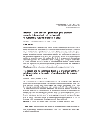 Problemy ZarzÈdzania, vol. 11, nr 4 (44): 171 – 182 ISSN 1644-9584, © Wydziaï ZarzÈdzania UW DOI 10.7172/1644-9584.44.13 Internet – stan obecny ib przyszïoĂÊ jako problem sposobu interpretacji roli technologii wb kontekĂcie rozwoju biznesu wb sieci Nadesïany: 17.06.13 | Zaakceptowany do druku: 19.10.13 Rafaï MaciÈg* Artykuï omawia najnowsze tendencje rozwoju Internetu wbkontekĂcie teoretycznych badañ dotyczÈcych ich aspektu technologicznego, bÚdÈcego klasycznym problemem badañ poĂwiÚconych mediom. Problem ten staï siÚ szczególnie waĝny ibzostaï postawiony na nowo wbwypadku tzw. nowych mediów. Jego osobny wariant pojawiï siÚ takĝe wb obrÚbie bardziej szczegóïowego pola badawczego dotyczÈcego zarzÈdzania mediami. Wspomniane najnowsze tendencje rozwoju przyjmujÈ dwa kluczowe kierunki: intensyfikacja ibwzbogacenie ruchu wbobecnej infrastrukturze oraz rekonstrukcja od podstaw infrastruktury sieci oparta na jej nowej koncepcji (tzw. clean slate paradigm). Oba kierujÈ siÚ jasnÈ pragmatykÈ, jakiej dostarcza aspekt komercyjny sieci, choÊ fundamentalnie róĝnie rozumiejÈ jej status (obiektywna rzeczywistoĂÊ v.b„usïuga” pañstwowa). RealizujÈ takĝe klasycznÈ ambiwalencje badawczÈ mediów, która przeciwstawia stanowisko deterministyczne (determinizm technologiczny) rozumieniu technologii jako odpowiedzi na zapotrzebowanie spoïeczne gïównie ob charakterze ekonomicznym. Sïowa kluczowe: Internet, web, biznes, media, zarzÈdzanie, technologia, determinizm, teoria. The Internet and its present and future as ab problem of technology role interpretation in the context of development of the business in the web Submitted: 17.06.13 | Accepted: 19.10.13 The article describes the newest tendencies in the development of the Internet in the context of theoretical investigations considering its technological aspect which is abclassical problem in the media studies. This issue has become especially urgent with the arrival of new media and made theory to rethink it from the beginning. Its separated variant appeared also in ab more specific field of the media management. The newest tendencies in the development of the Internet take now two key directions: acceleration and enrichment of the traffic incurrent infrastructure or fundamental reconstruction of current infrastructure based on new criteria (clean slate paradigm). Although both of them present clear pragmatics, which is provided by the commercial aspect of Web, they understand its status in abvery different ways (objective reality vs. state service). They also realize the classical theoretical ambivalence in media studies which holds on one side ab deterministic attitude (technological determinism) and on the second the idea that technology mainly arises as ab result of mostly economically driven social need. Keywords: the Internet, web, business, media, management, technology, determinism, theory. * Rafaï MaciÈg – dr, Instytut Kultury, Wydziaï ZarzÈdzania i Komunikacji Spoïecznej, Uniwersytet Jagielloñski. Adres do korespondencji: Uniwersytet Jagielloñski, Instytut Kultury, ul. prof. S. ojasiewicza 4, 30-348 Kraków, e-mail: [email protected]. Rafaï MaciÈg 1. WstÚpne ustalenia Niniejszy tekst ma za zadanie podjÈÊ problem technologicznego kontekstu mediów wb Ăwietle najnowszych tendencji, które pojawiïy siÚ wb obrÚbie Internetu, powodujÈc powrót do korzeni problematyki uwaĝanej za dobrze rozpoznanÈ. Technologia jako zmienna procesów ksztaïtujÈcych media jest problemem klasycznym obdïugiej juĝ historii (wystarczy przypomnieÊ postaci Harolda Innisa ibMarshala McLuhanna) ibzostaïa obszernie zinterpretowana, ab jednak nieustajÈco powraca jako osobny, deterministyczny czynnik. Ta tendencja pojawia siÚ silnie wb wypadku tzw. nowych mediów ib szczególnie Internetu, co wydaje siÚ czymĂ wiÚcej niĝ tylko jednym zb kolejnych problemów szczegóïowych, ale moĝe byÊ przesïankÈ do gruntownego przemyĂlenia sposobu, wbjaki Internet jest interpretowany. KoniecznoĂÊ podobnej rekonstrukcji nasuwa siÚ zresztÈ samoistnie wobec wzrastajÈcego tempa pojawiania siÚ innowacji technologicznych, których nie jest wb stanie opanowaÊ refleksja badawcza. Gïówne tendencje warunkujÈce rozwój mediów ib problemy zwiÈzane zbzarzÈdzaniem nimi zdefiniowali wbroku 2006 Dan Shaver ibMary Alice Shaver, podajÈc trzy podstawowe czynniki (factors), które „wydajÈ siÚ dominowaÊ wbewolucji przemysïów medialnych ibokreĂlaÊ wyzwania stojÈce przed zarzÈdzajÈcymi tymi mediami” (Shaver ibShaver, 2006, s. 639). SÈ nimi: technologie cyfrowe, wzorce przyswojenia produktu przez konsumenta (consumer adoption patterns) oraz globalne Ărodowisko regulacyjne. Po przeprowadzeniu ich analizy autorzy ci zrekonstruowali wbdalszej czÚĂci trzy gïówne zespoïy zagadnieñ stanowiÈcych gïówne zadania dla zarzÈdzania: wywoïany nimi ksztaït przemysïu medialnego (impact on industry operations), kontent medialny (media content) ib widownie (audiences) (Shaver ib Shaver, 2006, s. 644). W przywoïanym tekĂcie specyficzna kwestia technologii pojawia siÚ na pierwszym miejscu ib skojarzona zb charakterystycznÈ dziedzinÈ rozwiÈzañ tzw.b cyfrowych (czyli opartych na konwersji treĂci do postaci binarnej, ab takĝe, dziÚki temu, zastosowania narzÚdzi ib technik wïaĂciwych dla tej postaci), dziÚki czemu rozpatrywana jest przede wszystkim wb kontekĂcie Internetu. Rozwój ibekspansja dziedziny cyfrowej ibjej najwaĝniejszego kanaïu dystrybucji, jakim jest sieÊ, wytwarza róĝne, odlegïe zjawiska, które sÈ szeroko podejmowane wbobrÚbie róĝnych dziedzin badawczych. ByÊ moĝe najlepiej znana jest ta jej gaïÈě, która pojawia siÚ jako reminiscencja podobnej problematyki podejmowanej wb kontekĂcie klasycznych badañ medioznawczych ibjako jednoczeĂnie dyskusja zbnimi. Ten rodzaj namysïu reprezentujÈ badania przeprowadzane wbramach szerszego nastawienia, przekraczajÈcego g