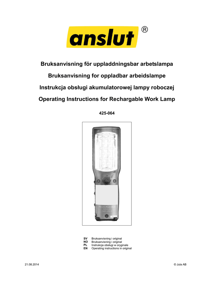 Bruksanvisning för uppladdningsbar arbetslampa Bruksanvisning for oppladbar arbeidslampe Instrukcja obsługi akumulatorowej lampy roboczej Operating Instructions for Rechargable Work Lamp 425-064 SV NO PL EN 21.08.2014 Bruksanvisning i original Bruksanvisning i original Instrukcja obsługi w oryginale Operating instructions in original © Jula AB SVENSKA SVENSK A SÄKERHETSANVISNINGAR Läs bruksanvisningen noggrant innan användning! Använd inte produkten i närheten av antändliga material eller gaser. Lamporna får inte vara övertäckta under användning. Använd endast den medföljande laddaren. Förvara produkten oåtkomligt för barn. Rikta aldrig ljuset mot ögonen på människor eller djur. Kontrollera laddarens sladd före varje användning. Byt ut laddaren om sladden är skadad. TEKNISKA DATA Eldata Uppladdningsbart NiMH-batteri LED Omgivningstemperatur Drifttid Laddningstid Skyddsklass Vikt 6 V, 300 mA 3,6 V, 1200 mAh 15 LED / 11,000 MCD -5 till 40 °C Ca 3-4 h/ laddning Ca 3-4 h III 0,54 kg BESKRIVNING Praktiskt ställ som ger fria händer. Sladdlös, kompakt konstruktion. Inbyggt bältesfäste. Stöt- och stänktålig. Hög ljusintensitet med lysdioder. Stor reflektor. Lång drifttid (cirka 4 timmar). Nätadapter 230 VAC för laddning. Adapter för 12 V fordonsuttag för laddning. HANDHAVANDE Laddning Ladda batterierna helt före första användning. Släck lampan under laddning. Laddning med nätadapter Sätt nätadaptern i ett nätuttag. Anslut laddarens sladd till motsvarande anslutning på handtaget. En röd indikeringslampa lyser. Laddning från 12 V fordonsuttag Anslut laddarens sladd till motsvarande anslutning på handtaget. Sätt i stickproppen i fordonets 12 V uttag (se handboken för bilen). En röd indikeringslampa lyser. 2 SVENSKA Rätten till ändringar förbehålles. Vid eventuella problem, kontakta vår serviceavdelning på telefon 0200-88 55 88. Jula AB, Box 363, 532 24 SKARA www.jula.se 3 NORSK NORSK SIKKERHETSANVISNINGER Les bruksanvisningen nøye før du tar produktet i bruk! Ikke bruk apparatet i nærheten av antennelige materialer eller gasser. Lampen må ikke tildekkes under bruk. Bruk kun den medfølgende laderen. Oppbevar produktet utilgjengelig for barn. Ikke rett lyset mot øynene på mennesker eller dyr. Kontroller laderens ledning før hver bruk. Bytt ut laderen hvis ledningen er skadet. TEKNISKE DATA Elektriske data Oppladbart NiMH-batteri LED Omgivelsestemperatur Driftstid Ladetid Beskyttelsesklasse Vekt 6 V, 300 mA 3,6 V, 1200 mAh 15 LED / 11 000 MCD -5 til 40 °C Ca. 3-4 t/lading Ca. 3-4 t III 0,54 kg BESKRIVELSE Praktisk holder som gir frie hender. Trådløs, kompakt konstruksjon. Innebygd beltefeste. Støt- og sprutsikker. Høy lysintensitet med lysdioder. Stor reflektor. Lang driftstid (cirka 4 timer). Nettadapter 230 V AC til lading. Adapter til 12 V billader. BRUK Lader Lad batteriene helt før første gangs bruk. Slå av lampen under lading. Lading med nettadapter Koble nettadapteren til et nettuttak. Koble laderens ledning til en egnet kontakt på håndtaket. En rød indikatorlampe lyser. Lading fra 12 V biluttak Koble laderens ledning til en egnet kontakt på håndtaket. Sett støpselet inn i bilens 12 V uttak (se bilens instruksjonsbok). En rød indikatorlampe lyser. 4 NORSK Med forbehold om endringer. Ved eventuelle problemer kan du kontakte vår serviceavdeling på telefon 67 90 01 34. Jula Norge AS, Solheimsveien 6-8, 1471 LØRENSKOG www.jula.no 5 POLSKI POL SKI ZASADY BEZPIECZEŃSTWA Przed użyciem uważnie przeczytaj instrukcję obsługi! Nie używaj produktu w pobliżu łatwopalnych materiałów lub gazów. Diody nie mogą być zakryte w czasie używania produktu. Używaj wyłącznie załączonej ładowarki. Przechowuj produkt w miejscu niedostępnym dla dzieci. Nigdy nie zwracaj światła lampy w kierunku oczu ludzi i zwierząt. Przed każdym użyciem sprawdzaj kabel ładowarki. Wymień ładowarkę, jeśli kabel jest uszkodzony. DANE TECHNICZNE Parametry elektryczne Akumulatorek NiMH LED Temperatura otoczenia Czas pracy Czas ładowania Klasa ochrony Masa 6 V, 300 mA 3,6 V / 1200 mAh 15 diod LED / 11 000 MCD od -5 do 40°C Ok. 3–4 h / ładowanie Ok. 3–4 h III 0,54 kg OPIS Praktyczny stojak, który daje możliwość manewrowania obiema rękami. Bezprzewodowa, kompaktowa konstrukcja. Wbudowany zaczep do paska. Odporność na wstrząsy i zachlapanie. Wysoka intensywność świecenia diod LED. Duży odbłyśnik. Długi czas pracy (około 4 godziny). Zasilacz sieciowy 230 VAC do ładowania. Zasilacz do ładowania poprzez gniazdo samochodowe 12 V. OBSŁUGA Ładowanie Przed pierwszym użyciem naładuj akumulatorki. Zgaś lampę na czas ładowania. Ładowanie zasilaczem sieciowym Włóż zasilacz do gniazdka. Podłącz kabel ładowarki do odpowiedniego złącza w uchwycie. Zaświeci się lampka kontrolna. Ładowanie poprzez gniazdo samochodowe 12 V Podłącz kabel ładowarki do odpowiedniego złącza w uchwycie. Włóż wtyczkę do gniazdka 12 V w pojeździe (zobacz książkę obsługi pojazdu). Zaświeci się lampka kontrolna. 6 POLSKI Z zastrzeżeniem prawa do zmian. W razie problemów skontaktuj się telefonicznie z działem obsługi klienta pod numerem 801 600 500. Jula Poland Sp. z o.o., ul. Malborska 49, 03-286 Warszawa, Polska www.jula.pl 7 ENGLISH ENGLISH SAFETY INSTRUCTIONS Read the User Instructions carefully before use Do not use the product near flammable materials or gases. The LEDs must not be covered during use. Only use the charger supplied. Keep this product out of the reach of children. Never shine the light in people’s or animals' eyes. Inspect the charger cord before each use. Replace the charger if the cord is damaged. TECHNICAL DATA Electrical data Rechargable NiMH battery LED Ambient temperature Operating time Charging time Safety class Weight 6 V, 300 mA 3.6 V, 1200 mAh 15 LED/11,000 MCD -5°C to 40°C approx. 3-4 hrs/charge approx. 3-4 hrs III 0.54 kg DESCRIPTION Practical hands-free stand. Cordless, co