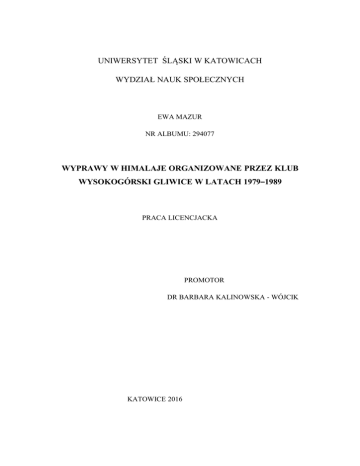 UNIWERSYTET ŚLĄSKI W KATOWICACH WYDZIAŁ NAUK SPOŁECZNYCH EWA MAZUR NR ALBUMU: 294077 WYPRAWY W HIMALAJE ORGANIZOWANE PRZEZ KLUB WYSOKOGÓRSKI GLIWICE W LATACH 1979–1989 PRACA LICENCJACKA PROMOTOR DR BARBARA KALINOWSKA - WÓJCIK KATOWICE 2016 Słowa kluczowe: Himalaje, alpinizm, góry, wspinaczka, Gliwice Oświadczenie autora pracy Ja, niżej podpisana: imię (imiona) i nazwisko: Ewa Mazur autor pracy dyplomowej pt. Wyprawy w Himalaje organizowane przez Klub Wysokogórski Gliwice w latach 1979–1989. Numer albumu: 294077 Studentka Wydziału Nauk Społecznych Uniwersytetu Śląskiego w Katowicach kierunku studiów: Historia Specjalności: nauczycielskiej Oświadczam, że ww. praca dyplomowa: • została przygotowana przeze mnie samodzielnie1, • nie narusza praw autorskich w rozumieniu ustawy z dnia 4 lutego 1994 r. o prawie autorskim i prawach pokrewnych (tekst jednolity Dz. U. z 2006 r. Nr 90, poz. 631, z późn. zm.) oraz dóbr osobistych chronionych prawem cywilnym, • nie zawiera danych i informacji, które uzyskałam w sposób niedozwolony, • nie była podstawą nadania dyplomu uczelni wyższej lub tytułu zawodowego ani mnie, ani innej osobie. Oświadczam również, że treść pracy dyplomowej zamieszczonej przeze mnie w Archiwum Prac Dyplomowych jest identyczna z treścią zawartą w wydrukowanej wersji pracy. Jestem świadomy/-a odpowiedzialności karnej za złożenie fałszywego oświadczenia. …………………………………… Data 1 …………………………………. Podpis autora pracy uwzględniając merytoryczny wkład promotora (w ramach prowadzonego seminarium dyplomowego) Spis treści Wstęp...................................................................................................................................3 Rozdział I Ludzie i góry do 1979 roku........….................................................................10 1.1 Człowiek i góry....................................................................................................11 1.2 Kluby wysokogórskie ..........................................................................................12 1.2.1 The Alpine Club..........................................................................................13 1.2.2 Alpenverein.................................................................................................14 1.3 Kluby wysokogórskie w Polsce............................................................................14 1.4 Klub Wysokogórski Gliwice.................................................................................18 1.5 Zdzisław Dziędzielewicz-Kirkin...........................................................................20 1.6 Polacy w „Krainie Śniegu”...................................................................................19 1.7 Droga w Himalaje.................................................................................................26 Rozdział II Organizacja wypraw........................................................................................33 2.1 Wyzwania stojące przed organizatorami...............................................................34 2.2 Pomysł...................................................................................................................36 2.3 Dobór składu wyprawy.........................................................................................37 2.4 Żywność................................................................................................................38 2.5 Leki.......................................................................................................................41 2.6 Sprzęt....................................................................................................................42 2.7 Fundusze...............................................................................................................46 2.8 Inne.................................................................................................................. ….49 Rozdział III Wyprawy........................................................................................................51 3.1 Lhotse 1979...........................................................................................................52 3.1.1 Historia zdobywania...................................................................................52 3.1.2 Wyprawa.....................................................................................................53 3.2 Makalu 1982.........................................................................................................55 3.2.1 Historia zdobywania...................................................................................55 3.2.2 Wyprawa.....................................................................................................56 3.3 Thalay-Sagar 1983................................................................................................59 3.3.1 Historia zdobywania...................................................................................59 3.3.2 Wyprawa.....................................................................................................60 3.4 Dhaulagiri 1985....................................................................................................60 3.4.1 Historia zdobywania...................................................................................60 3.4.2 Wyprawa.....................................................................................................62 3.5 Bhagirathi II 1985.................................................................................................64 3.6 Kedar Dome 1986.................................................................................................65 3.7 Makalu - Annapurna 1987....................................................................................66 3.8 Mount Everest 1989......