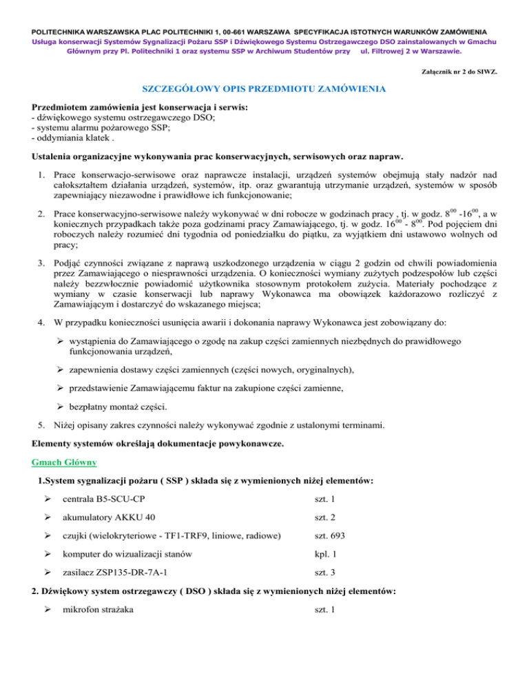 POLITECHNIKA WARSZAWSKA PLAC POLITECHNIKI 1, 00-661 WARSZAWA SPECYFIKACJA ISTOTNYCH WARUNKÓW ZAMÓWIENIA Usługa konserwacji Systemów Sygnalizacji Pożaru SSP i Dźwiękowego Systemu Ostrzegawczego DSO zainstalowanych w Gmachu Głównym przy Pl. Politechniki 1 oraz systemu SSP w Archiwum Studentów przy ul. Filtrowej 2 w Warszawie. Załącznik nr 2 do SIWZ. SZCZEGÓŁOWY OPIS PRZEDMIOTU ZAMÓWIENIA Przedmiotem zamówienia jest konserwacja i serwis: - dźwiękowego systemu ostrzegawczego DSO; - systemu alarmu pożarowego SSP; - oddymiania klatek . Ustalenia organizacyjne wykonywania prac konserwacyjnych, serwisowych oraz napraw. 1. Prace konserwacjo-serwisowe oraz naprawcze instalacji, urządzeń systemów obejmują stały nadzór nad całokształtem działania urządzeń, systemów, itp. oraz gwarantują utrzymanie urządzeń, systemów w sposób zapewniający niezawodne i prawidłowe ich funkcjonowanie; 2. Prace konserwacyjno-serwisowe należy wykonywać w dni robocze w godzinach pracy , tj. w godz. 8 00 -1600, a w koniecznych przypadkach także poza godzinami pracy Zamawiającego, tj. w godz. 16 00 - 800. Pod pojęciem dni roboczych należy rozumieć dni tygodnia od poniedziałku do piątku, za wyjątkiem dni ustawowo wolnych od pracy; 3. Podjąć czynności związane z naprawą uszkodzonego urządzenia w ciągu 2 godzin od chwili powiadomienia przez Zamawiającego o niesprawności urządzenia. O konieczności wymiany zużytych podzespołów lub części należy bezzwłocznie powiadomić użytkownika stosownym protokołem zużycia. Materiały pochodzące z wymiany w czasie konserwacji lub naprawy Wykonawca ma obowiązek każdorazowo rozliczyć z Zamawiającym i dostarczyć do wskazanego miejsca; 4. W przypadku konieczności usunięcia awarii i dokonania naprawy Wykonawca jest zobowiązany do: wystąpienia do Zamawiającego o zgodę na zakup części zamiennych niezbędnych do prawidłowego funkcjonowania urządzeń, zapewnienia dostawy części zamiennych (części nowych, oryginalnych), przedstawienie Zamawiającemu faktur na zakupione części zamienne, bezpłatny montaż części. 5. Niżej opisany zakres czynności należy wykonywać zgodnie z ustalonymi terminami. Elementy systemów określają dokumentacje powykonawcze. Gmach Główny 1.System sygnalizacji pożaru ( SSP ) składa się z wymienionych niżej elementów: centrala B5-SCU-CP szt. 1 akumulatory AKKU 40 szt. 2 czujki (wielokryteriowe - TF1-TRF9, liniowe, radiowe) szt. 693 komputer do wizualizacji stanów kpl. 1 zasilacz ZSP135-DR-7A-1 szt. 3 2. Dźwiękowy system ostrzegawczy ( DSO ) składa się z wymienionych niżej elementów: mikrofon strażaka szt. 1 POLITECHNIKA WARSZAWSKA PLAC POLITECHNIKI 1, 00-661 WARSZAWA SPECYFIKACJA ISTOTNYCH WARUNKÓW ZAMÓWIENIA Usługa konserwacji Systemów Sygnalizacji Pożaru SSP i Dźwiękowego Systemu Ostrzegawczego DSO zainstalowanych w Gmachu Głównym przy Pl. Politechniki 1 oraz systemu SSP w Archiwum Studentów przy ul. Filtrowej 2 w Warszawie. mikrofon strefowy szt. 1 jednostka centralna ABT-V2000 3 szafy jednostka kontroli ABT-V2000JK szt. 3 jednostki kontroli linii głośnikowych ABT-V2000IMK2 szt. 29 BLOK zasilania DSO wzmacniacz e mocy ABT-V2xxxWM szt. 24 głośniki (sufitowe, na stropowe, naścienne) szt. 729 3.Instalacja oddymiająca klatki schodowe. 3.1. W skład instalacji wchodzą wymienione niżej elementy: okno PCV 150 X 150 uchylne szt. 2 siłownik s ZA81/ 800/TM szt. 2 centrale sterujące typu MCR- 9705A MERCOR szt. 2 system zasilania - baterie akumulatorów szt. 4 przyciski alarmowy oddymiania (ROP-33 POLON) szt. 10 czujki dymu DIO 37 szt. 4 3.2. Drzwi przeciwpożarowe EI60 podłączone do systemu SSP kpl. 4 Budynek Stołówki Centralnej 1. System sygnalizacji pożaru (SSP) składający się wymienionych niżej elementów: centrala typ. Aritech FP1216 C szt. 1 czujka optyczna dymu typ. Aritech DP 206 IN szt. 51 ręczny ostrzegacz pożaru (wewnętrzny) Aritech DM 2010 szt. 6 sygnalizator akustyczny wewnętrzny AS 364 szt. 2 Zakres prac związanych z przeglądami, konserwacją i naprawą: systemów alarmu pożarowego (SAP), dźwiękowych systemów ostrzegawczych (DSO), systemów oddymiających, innych urządzeń przeciwpożarowych sprzężonych z centralami sygnalizacji pożarowej, naprawą: systemów alarmu pożarowego (SAP), dźwiękowych systemów ostrzegawczych (DSO), systemów oddymiających, innych urządzeń przeciwpożarowych sprzężonych z centralą instalacji sygnalizacji pożarowej, obejmuje: 1. Prowadzenie przeglądu i konserwacji centrali instalacji sygnalizacji pożaru oraz systemów sterujących urządzeń uaktywnianych przez centralę instalacji sygnalizacji pożarowej - 1 raz w miesiącu (do ostatniego dnia miesiąca); 2. Sprawdzenie zdatności centrali do uaktywniania wszystkich funkcji pomocniczych np. sterowania klapami dymowymi, wentylatorami, drzwiami ewakuacyjnymi, itp. - 1 raz na kwartał (do ostatniego dnia miesiąca kończącego kwartał); 3. Sprawdzenie działania linii (pętli) dozorowych i sygnałowych - 1 raz w miesiącu (do ostatniego dnia miesiąca); POLITECHNIKA WARSZAWSKA PLAC POLITECHNIKI 1, 00-661 WARSZAWA SPECYFIKACJA ISTOTNYCH WARUNKÓW ZAMÓWIENIA Usługa konserwacji Systemów Sygnalizacji Pożaru SSP i Dźwiękowego Systemu Ostrzegawczego DSO zainstalowanych w Gmachu Głównym przy Pl. Politechniki 1 oraz systemu SSP w Archiwum Studentów przy ul. Filtrowej 2 w Warszawie. 4. Prowadzenie przeglądu i konserwacji układów zasilania (podstawowych i awaryjnych) instalacji sygnalizacji pożaru - 1 raz na kwartał (do ostatniego dnia miesiąca kończącego kwartał); 5. Prowadzenie przeglądu i konserwacji linii (pętli) dozorowych i sygnałowych, czujek pożarowych, przycisków pożarowych (ROP), sygnalizatorów zadziałania (optycznych i akustycznych) - 1 raz w roku.; zakres ww. prac konserwacyjnych obejmuje: sprawdzenie stanu i sygnałowych, technicznego oraz mocowania przewodów linii (pętli) dozorowych sprawdzenie wszystkic
