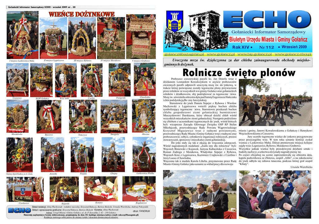 Gołaniecki Informator Samorządowy Biuletyn Urzędu Miasta i Gminy Gołańcz Rok XIV I miejsce Laskownica Mała Czeszewo Buszewo Rodzinny Ogród Działkowy im. K. Libelta III miejsce Rybowo Czerlin Krzyżanki KGW Gołańcz Morakówko Czesławice II miejsce Lęgniszewo Jeziorki Tomczyce Potulin IV miejsce Morakowo Panigródz Smogulec Chojna Wrzesień 2009 V miejsce Grabowo Chawłodno Oleszno Laskownica Wielka Konary Bogdanowo Kujawki Skład redakcji: Alina Wachowiak - redaktor naczelny, Krzysztof Rakoczy, Bartosz Bielecki, Urszula Wierzbicka, Andrzej Połczyński. Skład i opracowanie graficzne: Krzysztof Rakoczy, Bartosz Bielecki Korekta: Alina Wachowiak Adres: Urząd Miasta i Gminy Gołańcz, ul. dr. P. Kowalika 2, 62 - 130 Gołańcz Redakcja zastrzega sobie prawo do zmiany tytułu i skracania dostarczanych tekstów. 112 Proboszcz czeszewskiej parafii ks. Jan Dzierla wraz z dziekanem Leonardem Kowalczykiem w asyście proboszczów ościennych parafii odprawili uroczystą mszę św. dożynkową, w trakcie której poświęcone zostały tegoroczne plony przywiezione przez rolników ze wszystkich wsi gminy Gołańcz oraz gołanieckich rolników i działkowców, aby podziękować za tegoroczne żniwa. Mszę św. uświetniła orkiestra dęta pod batutą Eugeniusza Hańczuka i chór pod dyrekcją Bożeny Jarczyńskiej. Starostowie dożynek Danuta Szpejer z Rybowa i Wiesław Maćkowski z Lęgniszewa wnieśli piękny bochen chleba symbolizujący tegoroczne żniwa. Starostowie przekazali bochen chleba gospodarzowi ziemi gołanieckiej burmistrzowi Mieczysławowi Durskiemu, który obiecał dzielić chleb wśród wszystkich mieszkańców ziemi gołanieckiej. Następnie podzielono się chlebem z uczestnikami tegorocznych dożynek, wśród których byli: wiceprezes Zarządu Głównego Związku OSP RP Stefan Mikołajczak, przewodniczący Rady Powiatu Wągrowieckiego Krzysztof Migasiewicz wraz z radnymi powiatowymi, przewodniczący Rady Miasta i Gminy Gołańcz wraz z radnymi oraz proboszczowie, sołtysi, członkowie organizacji rolniczych, prezesi stowarzyszeń, sponsorzy i mieszkańcy ziemi gołanieckiej. Dożynki stały się także okazją do wręczenia odznaczeń. Wśród nagrodzonych medalami „Zasłużony dla rolnictwa” byli: Wojciech Biniewski z Kujawek, Justyna Kabacińska z Czeszewa, Roman Zadroga z Morakowa, Władysław Szpejer z Rybowa, Wojciech Kruś z Lęgniszewa, Kazimierz Czajkowski z Czerlina i Jerzy Loose z Chawłodna. Wręczono także medale Karola Libelta, przyznawane przez Radę Miasta i Gminy Gołańcz jako uznanie za wkład pracy dla rozwoju miasta i gminy, Janowi Kowalewskiemu z Gołańczy i Henrykowi Wojciechowskiemu z Czeszewa. Jury oceniło tegoroczne wieńce dożynkowe przygotowane przez poszczególne wsie. W tym roku uznanie komisji zyskał wieniec z Laskownicy Małej. Dalsze premiowane miejsca kolejno zajęły wsie: Legniszewo, Rybowo, Morakowo i Grabowo. Wszystkie jednak wieńce były prawdziwymi dziełami sztuki i budziły zachwyt, a sołectwa otrzymały nagrody pieniężne. Po części oficjalnej na scenie zaprezentowała się orkiestra dęta, kapela podwórkowa ze Złotowa, zespół „Alibi”, a na zakończenie dożynek odbyła się zabawa taneczna, podczas której grał zespół "Kfiaty”. Urszula Wierzbicka 29 sierpnia Rada Sołecka z Morakowa w składzie: Józef Loose (przewodniczący), Paweł Ślężak, Józef Baranienko, Roman Zadroga, Józef Skotowski z sołtysem, Bolesławem Skętnym i radnym Tomaszem Rożkiem postanowiła we współpracy ze wszystkimi organizacjami: Kołem Gospodyń Wiejskich (przewodnicząca Gertruda Pawlaczyk), Kółkiem Rolniczym (prezes Andrzej Ślężak), Ochotniczą Strażą Pożarną (prezes Roman Zadroga, naczelnik Dariusz Kamiński) zorganizować dożynki wiejskie. Przy organizacji dożynek niezbędnej pomocy udzielili również: dyrektor Zespołu Szkół w Morakowie pan Krzysztof Łukaszewski, przedstawiciel Izby Rolniczej pan Tadeusz Chmura oraz prezes Miejsko-Gminnego Związku Rolników, Kółek i Organizacji Rolniczych pan Andrzej Skotowski. Uroczystość rozpoczęła się o godz. 1800 na terenie Zespołu Szkół w Morakowie. Wszystkich mieszkańców i zaproszonych gości powitał sołtys Bolesław Skrętny, który stwierdził, że w zależności od potrzeb wioska organizuje się do pracy, bierze udział w różnych zawodach organizowanych przez gminę, a jak trzeba - to dobrze się bawi. Starosta dożynek Józef Loose wraz ze starościną Aleksandrą Skrętną przekazali sołtysowi chleb z tegorocznych zbiorów i poczęstowali nim wszystkich uczestników. Sołtys wręczył dyplomy uznania pani Teresie Jackowskiej, Danucie Skotowskiej, Paulinie Skotowskiej, Magdalenie Bonikowskiej, Katarzynie Kaptur, Wojciechowi Kapturowi, Annie Loose, Jadwidze Zapachniało świeżym chlebem w kościele parafialnym pw. św. Małgorzaty w Chojnie 23 sierpnia 2009 roku. Proboszcz ks. Ryszard Stawiarz odprawił uroczystą mszę św. dziękczynną, w trakcie której poświęcone zostały tegoroczne plony przyniesione przez rolników ze wsi należących do parafii. Tegorocznymi gospodarzami dożynek była wieś Dobieszewko. Podczas uroczystości wręczono medale „Zasłużony dla rolnictwa” Jankiewicz, Elżbiecie Kilarskiej, Bogusławie Kaźmierczak, Elżbiecie Zmudzińskiej, Ewie Loose za pracę przy wieńcu dożynkowym. Kazimierz Musiał otrzymał dyplom za wieloletnie przygotowywanie młodzieży do zawodów strażackich, a Tomasz Rożek za 10-letni wkład pracy w przygotowanie mieszkańców do Turnieju Wsi Gminy Gołańcz. Na zabawę zdeklarowała się przyjść zdecydowana większość mieszkańców, co świadczy o jedności wioski i potrzebie organizowania takich uroczystości. Burmistrz Miasta i Gminy Gołańcz wraz z przewodniczącym Rady Miasta i Gminy Gołańcz Józefem Ryłko wręczył pani Stanisławie Smolanie zasłużonej działaczce Koła Gospodyń Wiejskich Medal Karola Libelta, który został jej przyznany przez kapitułę. Zabaw