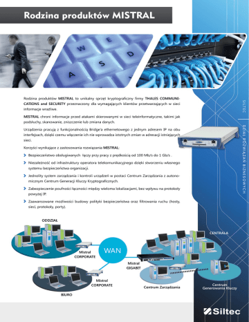 Rodzina produktów MISTRAL S I LT E C Rodzina produktów MISTRAL to unikalny sprzęt kryptograficzny firmy THALES COMMUNICATIONS and SECURITY przeznaczony dla wymagających klientów przetwarzających w sieci informacje wrażliwe. MISTRAL chroni informacje przed atakami skierowanymi w sieci teleinformatyczne, takimi jak podsłuchy, skanowanie, zniszczenie lub zmiana danych. DZIAŁ ROZWIĄZAŃ BIZNESOWYCH Urządzenia pracują z funkcjonalnością Bridge’a ethernetowego z jednym adresem IP na obu interfejsach, dzięki czemu włączenie ich nie wprowadza istotnych zmian w adresacji istniejących sieci. Korzyści wynikające z zastosowania rozwiązania MISTRAL: Bezpieczeństwo obsługiwanych łączy przy pracy z prędkością od 100 Mb/s do 1 Gb/s . Niezależność od infrastruktury operatora telekomunikacyjnego dzięki stworzeniu własnego systemu bezpieczeństwa organizacji. Jednolity system zarządzania i kontroli urządzeń w postaci Centrum Zarządzania z autonomicznym Centrum Generacji Kluczy Kryptograficznych. Zabezpieczenie poufności łączności między wieloma lokalizacjami, bez wpływu na protokoły powyżej IP. Zaawansowane możliwości budowy polityki bezpieczeństwa oraz filtrowania ruchu (hosty, sieci, protokoły, porty). ODDZIAŁ CENTRALA Mistral CORPORATE WAN Mistral GIGABIT Mistral CORPORATE BIURO Centrum Zarządzania Centrum Generowania Kluczy Mistral Corporate Szyfrowanie Cechy kluczy Bezpieczeństwo Filtrowanie Zarządzanie Kluczami Charakterystyki działania Protokoły X X Klucze 128 lub 256 bitów (pochodzące z wysokiej jakości ciągu losowego). X X Tryb pracy tunelowy IPSec (RFC 2401 / RFC 2406). X X Tryb pracy Fast Forward (szyfrowanie tylko zawartości ramki IP lub TCP). X X Uwierzytelnienie, kontrola dostępu, poufność, integralność, ochrona przed powtórzeniami. X X Filtrowanie adresów IP źródła i przeznaczenia. X X Filtrowanie Protokołu TCP/IP i portów. X X Sygnalizowanie zdarzeń związanych z bezpieczeństwem. X X Kontrola czasu ważności klucza i przydatności do użycia. X X Odnawianie klucza bez przerywania transmisji. X X Transparentny dla protokołów TCP/IP wyższego rzędu. X X Odpowiada normie VLAN 802.1Q. X X Obsługa redundancji (HSRP, VRRP) bez przelączania w tryb offline. X X 4000 6000 Ilość równoczesnych tuneli VPN. Szybkość Mbps full duplex Monitorowanie Administracja Konfiguracja Port Konsoli Strona jawna Interfejsy Blokowy algorytm szyfrowy AES. Tunele Zarządzanie 10/100 1000 Lokalne – poprzez port konsoli (RS 232C) X X Monitorowanie sieci poprzez protokół SNMP (MIB II Standard RFC1213). X X Bezpieczne i zcentralizowane zarządzanie poprzez Centrum Zarządzania Mistral. X X Monitorowanie statusu urządzeń i działania tuneli VPN. X X 2 tryby: lokalnie poprzez podłączoną konsolę lub zdalnie poprzez Centrum Zarządzania Mistral. X X Audyt i sygnalizacja alarmów, związanych z zagrożeniem bezpieczeństwa. X X Bezpieczna aktualizacja oprogramowania systemowego poprzez Centrum Zarządzania Mistral. X X Procesy zarządzania dopasowywane są do małych lub dużych struktur sieciowych. X X Kasowanie lokalne: w czasie transportu lub obsługi kasowane są wrażliwe parametry urządzenia Mistral. X X DB9 (RS-232C) X 1 RJ 45 (RS-232C) X 1 RJ 45 (10/100 Base TX) Certyfikaty X 1 RJ 45 (100/1000 Base TX) 1 RJ 45 (10/100 Base TX) Strona szyfrowa X X 1 RJ 45 (100/1000 Base TX) X Interfejs Smart karty X Poziom EAL3+ Common Criteria X 50mmW x 158mmS x 260mmG (1.97”W x 6.22”S x 10.24”G) X Obudowa Wymiary Wymiary Ciężar Mistral Gigabit X 19", 1U 44mmW x 443mmS x 393mmG (1.73”W x 17.44”S x 15.47”G) 980 g (2.161 lbs) X X 7 kg (15.432 lbs) X Firma SILTEC będąc wyłącznym przedstawicielem firmy THALES oferuje pełny zakres wsparcia dla użytkowników, zarówno podczas etapu projektowania, wdrożenia, jak i eksploatacji systemu, w tym: Szkolenia Centrum obsługi telefonicznej dla użytkowników Projektowanie sieci Wsparcie techniczne Instalacja i uruchomienie Aktualizacja oprogramowania S I LT E C S p . z o . o . ul. E. Orzeszkowej 5 0 2 - 3 7 4 Wa r s z a w a tel. fax + 48 22 572 18 00 + 48 22 823 66 46 w w w. s i l t e c . p l [email protected]