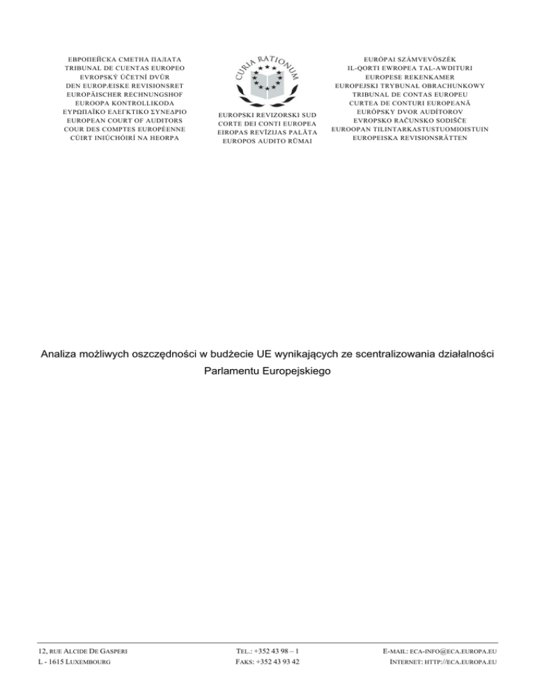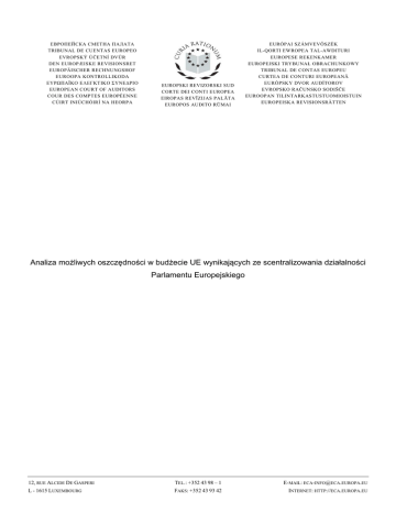 ЕВРОПЕЙСКА СМЕТНА ПАЛАТА TRIBUNAL DE CUENTAS EUROPEO EVROPSKÝ ÚČETNÍ DVŮR DEN EUROPÆISKE REVISIONSRET EUROPÄISCHER RECHNUNGSHOF EUROOPA KONTROLLIKODA ΕΥΡΩΠΑΪΚΟ ΕΛΕΓΚΤΙΚΟ ΣΥΝΕΔΡΙO EUROPEAN COURT OF AUDITORS COUR DES COMPTES EUROPÉENNE CÚIRT INIÚCHÓIRÍ NA HEORPA EUROPSKI REVIZORSKI SUD CORTE DEI CONTI EUROPEA EIROPAS REVĪZIJAS PALĀTA EUROPOS AUDITO RŪMAI EURÓPAI SZÁMVEVŐSZÉK IL-QORTI EWROPEA TAL-AWDITURI EUROPESE REKENKAMER EUROPEJSKI TRYBUNAŁ OBRACHUNKOWY TRIBUNAL DE CONTAS EUROPEU CURTEA DE CONTURI EUROPEANĂ EURÓPSKY DVOR AUDÍTOROV EVROPSKO RAČUNSKO SODIŠČE EUROOPAN TILINTARKASTUSTUOMIOISTUIN EUROPEISKA REVISIONSRÄTTEN Analiza możliwych oszczędności w budżecie UE wynikających ze scentralizowania działalności Parlamentu Europejskiego 12, RUE ALCIDE DE GASPERI L - 1615 LUXEMBOURG TEL.: +352 43 98 – 1 FAKS: +352 43 93 42 E-MAIL: [email protected] INTERNET: HTTP://ECA.EUROPA.EU 2 SPIS TREŚCI Punkt Streszczenie I–VIII Wstęp 1–3 Obecna organizacja działalności Parlamentu Europejskiego Zakres przeprowadzonej przez Trybunał analizy i zastosowane podejście Zakres analizy 1–3 4–8 4–7 Podejście 8 Analiza przeprowadzona przez Trybunał Część 1 – Przeprowadzona przez Trybunał analiza wcześniejszych badań sporządzonych przez służby administracyjne Parlamentu Europejskiego 9–49 9–11 Część 2 – Przeprowadzona przez Trybunał analiza możliwych oszczędności wynikających z przeniesienia działalności ze Strasburga do Brukseli 12–28 Część 3 – Przeprowadzona przez Trybunał analiza możliwych oszczędności wynikających z przeniesienia dodatkowo działalności z Luksemburga do Brukseli 29–49 Uwagi końcowe 50–57 Załącznik 1 Porównanie najważniejszych badań Załącznik 2 Wykorzystanie różnych szacunków opracowanych przez służby administracyjne Parlamentu Europejskiego Załącznik 3 Główne hipotezy zawarte w trzech najważniejszych badaniach Załącznik 4 Podsumowanie możliwych oszczędności wynikających ze scentralizowania działalności w Brukseli 11.7.2014 3 STRESZCZENIE I. W odpowiedzi na rezolucję Parlamentu Europejskiego z listopada 2013 r. Trybunał Obrachunkowy przeanalizował możliwe oszczędności w budżecie UE w przypadku scentralizowania działalności Parlamentu Europejskiego w Brukseli. II. W przeprowadzonej przez Trybunał analizie skoncentrowano się na dwóch podstawowych scenariuszach: a) przeniesienie działalności wyłącznie ze Strasburga do Brukseli, bez zmian w Luksemburgu; b) dodatkowo przeniesienie działalności z Luksemburga do Brukseli. III. Trybunał stwierdził, że przeniesienie działalności ze Strasburga do Brukseli mogłoby przynieść znaczne oszczędności, natomiast przeniesienie działalności z Luksemburga do Brukseli mogłoby przyczynić się do oszczędności w marginalnym stopniu. IV. Głównym czynnikiem, który wpływa na poziom możliwych oszczędności w wyniku przeniesienia działalności ze Strasburga do Brukseli, jest zysk ze sprzedaży, wynajmu lub alternatywnego wykorzystania budynków w Strasburgu. W swojej analizie Trybunał dokonał zatem osobnej oceny oszczędności uzyskanych w przypadku sprzedaży budynków w Strasburgu (wariant A) oraz oszczędności, jakie uzyskano by, gdyby budynków tych nie sprzedano (wariant B). V. Przeniesienie działalności z Luksemburga do Brukseli wymagałoby zapewnienia powierzchni biurowej w Brukseli dla personelu zatrudnionego obecnie w Luksemburgu. Decyzja dotycząca nabycia powierzchni biurowej (wariant C) lub jej najmu (wariant D) miałaby wpływ na poziom oszczędności wynikających z przeniesienia działalności z Luksemburga do Brukseli. Podobny wpływ miałaby kwota uzyskana ze sprzedaży biur w Luksemburgu. W swojej analizie Trybunał zbadał zatem osobno oszczędności płynące z każdego z tych dwóch wariantów. 11.7.2014 4 VI. Trybunał oszacował, że przeniesienie do Brukseli wyłącznie działalności ze Strasburga mogłoby przynieść oszczędności wynoszące 114 mln euro rocznie oraz jednorazowe oszczędności w wysokości 616 mln euro w przypadku sprzedaży budynków w Strasburgu bądź jednorazowy koszt wynoszący 40 mln euro, gdyby budynki te nie zostały sprzedane. VII. Przeniesienie działalności z Luksemburga do Brukseli przyniosłoby oszczędności w wysokości jedynie 13 mln euro rocznie w przypadku zakupu powierzchni biurowej w Brukseli oraz wiązałoby się z jednorazowym kosztem w wysokości 220 mln euro. Jeżeli natomiast wynajęto by powierzchnię biurową w Brukseli, wystąpiłby dodatkowy koszt w wysokości 16 mln euro rocznie oraz jednorazowy zysk w wysokości 476 mln euro. VIII. Przeprowadzona przez Trybunał analiza nie gwarantuje tego samego poziomu pewności co audyt na podstawie kosztów historycznych. W szczególności wyceny dotyczące budynków są przybliżone. Na potrzeby analizy Trybunał przyjął pewne założenia. Jakakolwiek decyzja w kwestii scentralizowania działalności będzie oparta nie tylko na przesłankach finansowych, ale również na innych czynnikach, takich jak uwzględnienie stosownych postanowień Traktatu. WSTĘP Obecna organizacja działalności Parlamentu Europejskiego 1. W grudniu 1992 r. podczas posiedzenia Rady Europejskiej w Edynburgu podjęto decyzję w sprawie siedzib instytucji unijnych. Ustalenia te zostały zawarte w protokole załączonym do Traktatu z Amsterdamu1, który stanowi, że Parlament Europejski posiada trzy siedziby: a) Parlament ma siedzibę w Strasburgu, gdzie odbywa się 12 posiedzeń plenarnych; 1 Traktat z Amsterdamu, Protokół w sprawie ustalenia siedzib instytucji i niektórych organów i służb Wspólnot Europejskich oraz Europolu, artykuł. 11.7.2014 5 b) posiedzenia komisji Parlamentu Europejskiego i dodatkowe posiedzenia plenarne odbywają się w Brukseli; c) Sekretariat Generalny Parlamentu Europejskiego i jego służby pozostają w Luksemburgu. 2. Działalność Parl