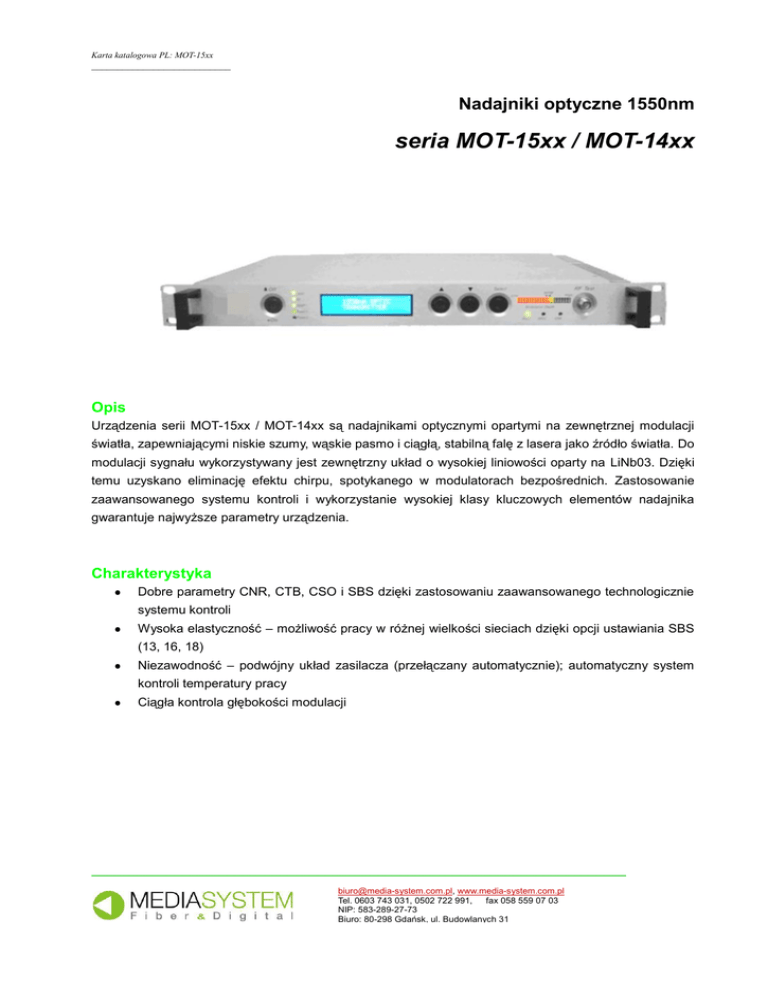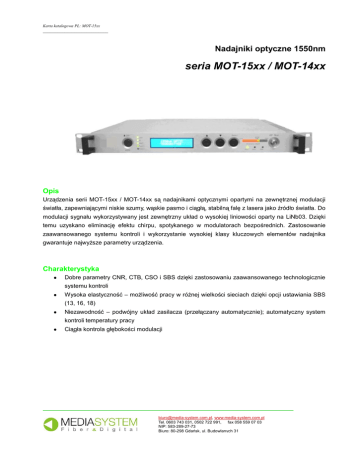 Karta katalogowa PL: MOT-15xx ___________________________ Nadajniki optyczne 1550nm seria MOT-15xx / MOT-14xx Opis Urządzenia serii MOT-15xx / MOT-14xx są nadajnikami optycznymi opartymi na zewnętrznej modulacji światła, zapewniającymi niskie szumy, wąskie pasmo i ciągłą, stabilną falę z lasera jako źródło światła. Do modulacji sygnału wykorzystywany jest zewnętrzny układ o wysokiej liniowości oparty na LiNb03. Dzięki temu uzyskano eliminację efektu chirpu, spotykanego w modulatorach bezpośrednich. Zastosowanie zaawansowanego systemu kontroli i wykorzystanie wysokiej klasy kluczowych elementów nadajnika gwarantuje najwyższe parametry urządzenia. Charakterystyka Dobre parametry CNR, CTB, CSO i SBS dzięki zastosowaniu zaawansowanego technologicznie systemu kontroli Wysoka elastyczność – możliwość pracy w różnej wielkości sieciach dzięki opcji ustawiania SBS (13, 16, 18) Niezawodność – podwójny układ zasilacza (przełączany automatycznie); automatyczny system kontroli temperatury pracy Ciągła kontrola głębokości modulacji _______________________________________________________________________ [email protected], www.media-system.com.pl Tel. 0603 743 031, 0502 722 991, fax 058 559 07 03 NIP: 583-289-27-73 Biuro: 80-298 Gdańsk, ul. Budowlanych 31 Karta katalogowa PL: MOT-15xx ___________________________ Parametry Wartość Parametr Długość fali (λ) 1550±10nm Pasmo liniowości Równoważna gęstość szumów Część optyczna Część RF Moc wyjściowa ≤-160dB/Hz RIN (20…1000MHz) 2x3dBm MOT-1503 2x5dBm MOT-1505 2x6dBm MOT-1506 2x7dBm MOT-1507 2x9dBm MOT-1509 2x10dBm MOT-1510 2x11dBm MOT-1511 1x5dBm MOT-1405 1x7dBm MOT-1407 1x9dBm MOT-1409 Złącze optyczne FC/APC ew. SC/APC lub E-2000 Zakres cz-ści 45…862MHz Poziom sygn. wej. 18…28dBmV AGC ≤±0.75dB 45…862MHz >16dB 45…750MHz Nierównomierność charakterystyki Impedancja wejściowa 75Ω Transmitowane kanały PAL-D/60k. CNR1 ≥53,5dB CNR2 ≥52dB CTB ≤-65dB CSO ≤-65dB ≥16,0dBm . 65km włókno optyczne, 0dBm odbiór 13, 16, 18 stałe lub regulowane (opcja) Interfejs sieciowy RJ45, RS232 I.E. & SNMP Zasilanie 90…265V AC -48VDC opcjonalnie ≤50W Przy pracy jednego zasilacza Pobór mocy ogólne Δλ ≥60dB Próg SBS Właściwości ≤1MHz Tłumienie odbić Tłumienie odbić Łącze Uwagi Wbudowany układ Zakres temp. Pracy -5…65°C automatycznej regulacji temperatury Temperatura przechowywania Wilgotność powietrza Wymiary -40…85°C 5…95% 19×14×1.75” _______________________________________________________________________ [email protected], www.media-system.com.pl Tel. 0603 743 031, 0502 722 991, fax 058 559 07 03 NIP: 583-289-27-73 Biuro: 80-298 Gdańsk, ul. Budowlanych 31