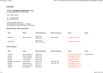ICE Transport - Kontakt 1z2 http://www.icetransport.home.pl/icetransport/index.php/pl/kontakt?tmpl=component&print=1&page= kontakt I.C.E. Transport Poland Sp. z o.o. ul. Waszyngtona 34/36, 81-342 Gdynia Biuro Główne Gdynia Tel. +48 58 6672460 Fax +48 58 6672470 E-mail: [email protected] KRS 0000121570, Sąd rejonowy w Gdańsku, NIP 5260301362, Kapitał Zakładowy: PLN 200.000 Sekretariat, biuro portowe Dział Osoba Telefon stacjonarny Telefon komórkowy E-mail Sekretariat Renata Lipińska 58 667 24 60 58 661 40 30 +48601841000 [email protected] 58 621 32 45 58 621 32 35 FAX Biuro portowe Skype [email protected] Dział Spedycji Dział Osoba Telefon stacjonarny Kierownik Marcin Kolendowicz Spedytor Spedytor Telefon komórkowy E-mail Skype 58 667 24 64 [email protected] ice_gdynia_marcin Dagmara Podraska 58 667 24 65 [email protected] Tomasz Jodłowski 58 667 24 66 [email protected] Spedytor Lucyna Olszak 58 667 24 68 [email protected] Specjalista ds. transportu Artur Zianowicz 58 667 24 69 +48 601 687 833 [email protected] Spedytor Barbara Zawisza 58 667 24 71 +48 501 807 120 [email protected] Spedytor Mirosław Olszewski 58 667 24 72 [email protected] Spedytor Ewa Wódkiewicz 58 667 24 73 [email protected] 2010-11-03 13:21 ICE Transport - Kontakt 2z2 http://www.icetransport.home.pl/icetransport/index.php/pl/kontakt?tmpl=component&print=1&page= Księgowość Dział Osoba Telefon stacjonarny Telefon komórkowy E-mail Główny księgowy Marian Suligowski 58 667 24 63 +48 607 148 695 [email protected] Księgowa Krystyna Ciechanowicz 58 667 24 75 [email protected] Księgowa Adriana Kędzierska 58 667 24 76 [email protected] Skype Biuro w Warszawie / Spedycja morska i lotnicza Dział Osoba Telefon stacjonarny Telefon komórkowy E-mail Skype Dyrektor Piotr Prasał 22 8699023 22 8690855 FAX +48 603 398 761 [email protected] icewarsaw Skype Prezes Zarządu, Dyrektor handlowy Dział Osoba Telefon stacjonarny Telefon komórkowy E-mail Dyrektor Handlowy Piotr Kulesza 58 667 24 62 +48 605 575 887 [email protected] Prezes Zarządu Tadeusz Klimczyk 58 667 24 61 +48 601 145 676 [email protected] tadeusz_klimczyk 2010-11-03 13:21