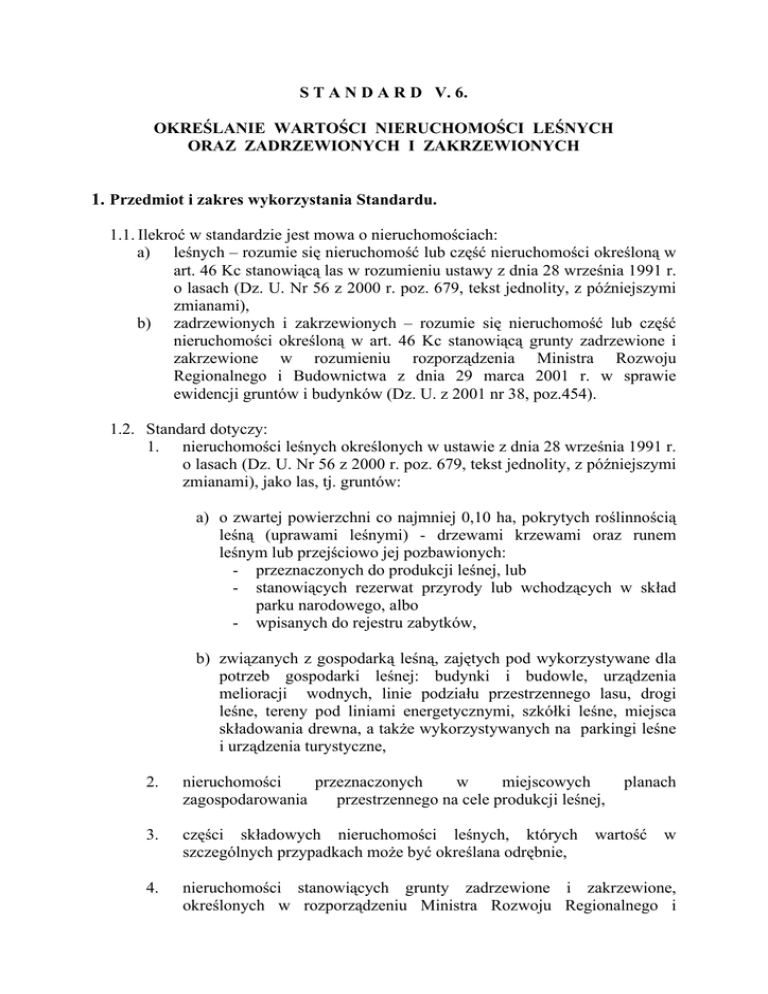 S T A N D A R D V. 6. OKREŚLANIE WARTOŚCI NIERUCHOMOŚCI LEŚNYCH ORAZ ZADRZEWIONYCH I ZAKRZEWIONYCH 1. Przedmiot i zakres wykorzystania Standardu. 1.1. Ilekroć w standardzie jest mowa o nieruchomościach: a) leśnych – rozumie się nieruchomość lub część nieruchomości określoną w art. 46 Kc stanowiącą las w rozumieniu ustawy z dnia 28 września 1991 r. o lasach (Dz. U. Nr 56 z 2000 r. poz. 679, tekst jednolity, z późniejszymi zmianami), b) zadrzewionych i zakrzewionych – rozumie się nieruchomość lub część nieruchomości określoną w art. 46 Kc stanowiącą grunty zadrzewione i zakrzewione w rozumieniu rozporządzenia Ministra Rozwoju Regionalnego i Budownictwa z dnia 29 marca 2001 r. w sprawie ewidencji gruntów i budynków (Dz. U. z 2001 nr 38, poz.454). 1.2. Standard dotyczy: 1. nieruchomości leśnych określonych w ustawie z dnia 28 września 1991 r. o lasach (Dz. U. Nr 56 z 2000 r. poz. 679, tekst jednolity, z późniejszymi zmianami), jako las, tj. gruntów: a) o zwartej powierzchni co najmniej 0,10 ha, pokrytych roślinnością leśną (uprawami leśnymi) - drzewami krzewami oraz runem leśnym lub przejściowo jej pozbawionych: - przeznaczonych do produkcji leśnej, lub - stanowiących rezerwat przyrody lub wchodzących w skład parku narodowego, albo - wpisanych do rejestru zabytków, b) związanych z gospodarką leśną, zajętych pod wykorzystywane dla potrzeb gospodarki leśnej: budynki i budowle, urządzenia melioracji wodnych, linie podziału przestrzennego lasu, drogi leśne, tereny pod liniami energetycznymi, szkółki leśne, miejsca składowania drewna, a także wykorzystywanych na parkingi leśne i urządzenia turystyczne, 2. nieruchomości przeznaczonych w miejscowych zagospodarowania przestrzennego na cele produkcji leśnej, planach 3. części składowych nieruchomości leśnych, których szczególnych przypadkach może być określana odrębnie, 4. nieruchomości stanowiących grunty zadrzewione i zakrzewione, określonych w rozporządzeniu Ministra Rozwoju Regionalnego i wartość w Budownictwa, wymienionym w p.1.1.b, tj. gruntów pokrytych roślinnością leśną, których pole powierzchni jest mniejsze od 0,10 ha , a także: a) śródpolne skupiska drzew i krzewów niezaliczone do lasów, b) tereny torfowisk, pokrytych częściowo kępami krzewów i drzew karłowatych, c) grunty porośnięte wikliną w stanie naturalnym oraz krzewiastymi formami wierzb w dolinach rzek i obniżeniach terenu, d) przylegające do wód powierzchniowych grunty porośnięte drzewami lub krzewami, stanowiące biologiczną strefę ochronną cieków i zbiorników wodnych, e) jary i wąwozy pokryte drzewami i krzewami w sposób naturalny lub sztuczny w celu zabezpieczenia przed erozją, niezaliczone do lasów, f) wysypiska kamieni i gruzowiska porośnięte drzewami i krzewami, g) zadrzewione i zakrzewione tereny nieczynnych cmentarzy, poza zwartymi kompleksami lasów, h) skupiska drzew i krzewów mające charakter parku, ale niewyposażone w urządzenia i budowle służące rekreacji wypoczynkowi. 1.3. Wartość nieruchomości gruntowych wykorzystywanych aktualnie na cele produkcji leśnej, a przeznaczonych w miejscowych planach zagospodarowania przestrzennego na inne cele, określa się jak nieruchomości innego niż leśne przeznaczenia z uwzględnieniem celu na jakie są przeznaczone w miejscowym planie zagospodarowania przestrzennego. 1.4. Wycena na potrzeby ustalania strat i odszkodowań wynikających z utraty albo ograniczenia wartości użytkowej gruntów na których prowadzona jest gospodarka leśna oraz określanie wartości drzew i drzewostanów, oraz plantacji drzew, szkółek leśnych i zadrzewieniowych następuje na zasadach przewidzianych w niniejszym Standardzie. 1.5. Wartość nieruchomości gruntowych przeznaczonych w miejscowym planie zagospodarowania przestrzennego na cele inne niż leśne a zabudowanych budynkami i innymi urządzeniami wykorzystywanymi dla potrzeb gospodarki leśnej może być określana według zasad przewidzianych w niniejszym Standardzie jeżeli wynika to z celu wyceny lub z właściwych przepisów. 1.6. Wartość nieruchomości zabudowanych budynkami i innymi urządzeniami, położonych na terenach przeznaczonych w miejscowych planach zagospodarowania przestrzennego na cele produkcji leśnej (siedziby nadleśnictw, leśnictwa, osady robotników leśnych), które są lub mogą być wykorzystywane na cele nie związane z prowadzeniem działalności leśnej a zgodnie z obowiązującymi przepisami zostały wyłączone z gospodarstwa leśnego określa się z uwzględnieniem zasad stosowanych dla aktualnego sposobu użytkowania - jeżeli występuje zgodność realizowanej funkcji w szczególności z przepisami o zagospodarowaniu przestrzennym, o ochronie gruntów rolnych i leśnych oraz przepisami prawa budowlanego. 1.7. Przedmiotem wyceny według zasad niniejszego Standardu jest nieruchomość leśna lub nieruchomość stanowiąca grunt zadrzewiony i zakrzewiony jako przedmiot prawa własności lub jako przedmiot prawa użytkowania wieczystego, prawa użytkowania oraz prawa użytkowania wkładu gruntowego w rolniczej spółdzielni produkcyjnej. 1.8. Zasady określone w niniejszym Standardzie stosuje się odpowiednio do wyceny na potrzeby ustalania strat i odszkodowań wynikających ze zniszczenia gruntu oraz określania wartości drzew, drzewostanów i krzewów (z wyjątkiem plantacji kultur wieloletnich) zlokalizowanych na gruntach wykorzystywanych jako pracownicze ogrody działkowe, ogrody przydomowe oraz działki przyzagrodowe członków rolniczej spółdzielni produkcyjnej. 1.9. Budynki mieszkalne wchodzące w skład gospodarstwa leśnego podlegają wycenie na zasadach przewidzianych w niniejszym Standardzie. 2. Nieruchomości leśne, zadrzewione i zakrzewione oraz ich cechy mające wpływ na wartość. 2.1. Do nieruchomości leśnych stanowiących grunty zalesione zalicza się drzewostany i plantacje drzew. 2.1.1. Drzewost