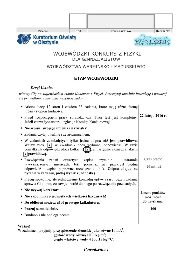 Pieczęć Imię i nazwisko Kod Razem pkt. WOJEWÓDZKI KONKURS Z FIZYKI DLA GIMNAZJALISTÓW WOJEWÓDZTWA WARMIŃSKO - MAZURSKIEGO ETAP WOJEWÓDZKI Drogi Uczniu, witamy Cię na wojewódzkim etapie Konkursu z Fizyki. Przeczytaj uważnie instrukcję i postaraj się prawidłowo rozwiązać wszystkie zadania. Arkusz liczy 12 stron i zawiera 33 zadania, które mają różną formę i różny stopień trudności. Przed rozpoczęciem pracy sprawdź, czy Twój test jest kompletny. 22 lutego 2016 r. Jeżeli zauważysz usterki, zgłoś je Komisji Konkursowej. Nie wpisuj swojego imienia i nazwiska! Zadania czytaj uważnie i ze zrozumieniem. W zadaniach zamkniętych tylko jedna odpowiedź jest prawidłowa. Wstaw znak xx w kwadracik obok wybranej odpowiedzi. W razie pomyłki złą odpowiedź otocz kółkiem xx , a następnie zaznacz znakiem xx prawidłową. Rozwiązania zadań otwartych zapisz czytelnie i starannie w wyznaczonych miejscach. Jeśli pomylisz się, przekreśl błędną odpowiedź i zapisz poprawne rozwiązanie obok. Odpowiadając na pytanie w zadaniu, podaj wynik z jednostką. Czas pracy: 90 minut Pracuj spokojnie, ale jednocześnie kontroluj upływ czasu! Jeżeli zadanie sprawia Ci kłopot, zostaw je i wróć do niego po rozwiązaniu pozostałych. Nie używaj korektora! Nie zapominaj o jednostkach wielkości fizycznych! Do obliczeń możesz użyć prostego kalkulatora. Pracuj samodzielnie. Liczba punktów możliwych do uzyskania: 100 Brudnopis nie podlega ocenie. Ważne! W zadaniach przyjmij: przyspieszenie ziemskie jako równe 10 m/s2; gęstość wody równą 1000 kg/m3; ciepło właściwe wody 4 200 J / kg·°C. Powodzenia ! Strona 2 Zadanie 1. (0-4) Oceń prawdziwość poniższych wypowiedzi. 1.2 Aby podnieść na Ziemi odważnik o masie 2 kg, wystarczy taka siła, jakiej potrzeba do jego podniesienia na Księżycu. Podczas topnienia ciało oddaje ciepło. 1.3 Powstawanie rosy na trawniku to zjawisko skraplania pary wodnej. 1.4 Podczas spadania jabłka z drzewa rośnie jego energia kinetyczna. 1.1 □ Prawda □ Fałsz □ Prawda □ Fałsz □ Prawda □ Fałsz □ Prawda □ Fałsz Zadanie 2. Wykres przedstawia zależność położenia od czasu Kasi jadącej windą. Początek układu współrzędnych umiejscowiony jest na pierwszym piętrze domu, a odległość między piętrami wynosi 3 m. Zadanie 2.1 (0-1) Na którym najwyższym piętrze była Kasia? □ A. 2 □ B. 3 □ C. 4 □ D. 6 Zadanie 2.2 (0-1) Ile czasu spędziła Kasia w windzie zjeżdżającej w dół? □ A. 12 s □ B. 18s □ C. 24 s □ D. 30 s Zadanie 2.3 (0-1) W której sekundzie ruchu Kasia była na parterze? □ A. □ B. □ C. □ D. w dwunastej sekundzie w dwudziestej czwartej sekundzie w trzydziestej sekundzie w trzydziestej szóstej sekundzie Zadanie 2.4 (0-1) W której sekundzie Kasia minęła pierwsze piętro, zjeżdżając w dół? □ A. □ B. □ C. □ D. w dwunastej sekundzie w dwudziestej czwartej sekundzie w trzydziestej sekundzie w trzydziestej szóstej sekundzie Zadanie 2.5 (0-1) Jaką drogę przebyła Kasia w czasie 36 sekund? □ A. 6 m □ B. 9 m □ C. 12 m □ D. 18 m Zadanie 3. (0-1) Przy napięciu 24 V przez przewodnik w ciągu 2 minut przepływa ładunek 12 C. Opór tego przewodnika wynosi □ A. 4 Ω □ B. 12 Ω □ C. 24 Ω Str. 2 □ D. 240 Ω pkt. Wojewódzki Konkurs z Fizyki dla Uczniów Gimnazjów – etap wojewódzki – rok szkolny 2015/2016 Strona 3 Zadanie 4. (0-1) Ołówek znajduje się w odległości 5 cm od soczewki skupiającej o ogniskowej 5 cm. Jaki obraz ołówka tworzy soczewka? □ A. □ B. □ C. □ D. rzeczywisty i powiększony. pozorny i powiększony. rzeczywisty i tej samej wielkości. soczewka nie tworzy obrazu. Zadanie 5. (0-1) Podczas przelotów statków kosmicznych przez atmosferę Ziemi następuje znaczący wzrost temperatury ich zewnętrznych powierzchni. Decydującą przyczyną tego faktu jest □ A. □ B. □ C. □ D. utlenianie się powierzchni, jako efekt działania „dziury ozonowej”. wpływ wysokiej temperatury gazów wydzielanych z silników. występowanie oporu powietrza atmosferycznego. żadna z powyższych odpowiedzi nie jest prawidłowa. Zadanie 6. (0-1) Ogniskowa zwierciadła kulistego wklęsłego ma długość 20 cm. Promień krzywizny tego zwierciadła wynosi □ A. 5 cm □ B. 10 cm □ C. 20 cm □ D. 40 cm Zadanie 7. (0-1) Wiedząc, że przyspieszenie grawitacyjne na Księżycu jest sześć razy mniejsze niż na Ziemi, masa ciała na Księżycu w porównaniu z jego masą na powierzchni Ziemi jest □ A. 6 razy większa. □ B. 6 razy mniejsza. □ C. 2,5 razy większa. □ D. taka sama. Zadanie 8. (0-8) Oceń prawdziwość poniższych wypowiedzi. 8.1 Wiązka promieni po odbiciu od chropowatej deski ulega rozproszeniu □ Prawda □ Fałsz 8.2 Okulary o ogniskowej 10 cm mają zdolność skupiającą 0,1 D 8.3 Światło słoneczne na powierzchni lustra ulega odbiciu i załamaniu 8.4 W pryzmacie światło żarówki ulega rozszczepieniu 8.5 Na powierzchni wody światło słoneczne ulega tylko odbiciu 8.6 Okulary o zdolności skupiającej 4 D mają soczewki o ogniskowej 25 cm □ Prawda □ Prawda □ Prawda □ Prawda □ Prawda 8.7 Wiązka promieni równoległych po odbiciu od lustra ulega rozproszeniu W pryzmacie światło lasera ulega rozszczepieniu 8.8 Str. 3 □ Fałsz □ Fałsz □ Fałsz □ Fałsz □ Fałsz □ Prawda □ Fałsz □ Prawda □ Fałsz pkt. Wojewódzki Konkurs z Fizyki dla Uczniów Gimnazjów – etap wojewódzki – rok szkolny 2015/2016 Strona 4 Zadanie 9. (0-1) Dwa kawałki żelaza o różnych masach spadały z tej samej wysokości w próżni. Zakładając, że przy uderzeniu o podłogę energia mechaniczna przekształciła się całkowicie w ich energię wewnętrzną, możemy powiedzieć, że temperatura □ A. □ B. □ C. □ D. wzrosła jednakowo w każdym kawałku. bardziej wzrosła w kawałku o większej masie. bardziej wzrosła w kawałku o mniejszej masie. pozostała bez zmian w obu kawałkach. Zadani