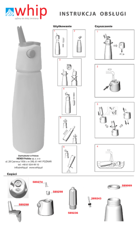 I N S T R U KC J A O B S Ł U G I Czyszczenie Użytkowanie 1 2 1 3 2 4 3 5 4 6 Dystrybutor w Polsce: HENDI Polska sp. z. o o ul. 28 Czerwca 1956 r. nr 390, 61-441 POZNAŃ tel. +48 61 834 49 10 [email protected] www.whip.pl Części 589274 589069 589298 589243 589298 589236 Szanowni Państwo Dziękujemy za wybranie, wysokiej jakości, syfonu do bitej śmietany WHIP. Przy pomocy tego urządzenia możecie Państwo stworzyć całą gamę lekkich deserów, kremów, słodkich oraz kwaśnych musów, jak również i sosów. Do syfonu do bitej śmietany WHIP można dodawać niektóre rodzaje płynnych składników, takich jak soki, kawa, syrop czekoladowy, krem waniliowy, jogurt itp., pod warunkiem, że nie zawierają one substancji nierozpuszczalnych! Gwarancję jakości daje jedynie stosowanie nabojów firmy WHIP. Przed pierwszym użyciem prosimy o dokładne zapoznanie się z instrukcją! Instrukcja obsługi (patrz: rysunki na pierwszej stronie instrukcji) 1. Zdejmij głowicę z butelki. Jeżeli używasz syfonu po raz pierwszy lub jeżeli syfon nie był używany przez jakiś czas, przepłucz butelkę letnią, a następnie zimną wodą zanim napełnisz go śmietaną (Rys. 1). 2. Napełnij butelkę odpowiednio schłodzoną, świeżą śmietaną lub innymi płynnymi składnikami zgodnie z przepisem (Rys.2). Nigdy nie napełniaj butelki większą ilością śmietany niż jest to wskazane na butelce (maksymalnie 0.25 lub 0.5). Jeżeli trzeba dosłodzić śmietanę, zalecamy stosowanie syropu cukrowego. W przypadku cukru lub zagęszczacza należy najpierw rozmieszać i rozpuścić go całkowicie w niewielkiej ilości śmietany, co zapobiegnie tworzeniu się grudek. 3. Upewnij się, że uszczelka znajduje się w odpowiedniej pozycji i ściśle przylega do głowicy. Następnie nakręć głowicę na butelkę równo i mocno, zgodnie z następującymi wskazówkami: przekręć głowicę zgodnie z ruchem wskazówek zegara, aż do napotkania oporu, a następnie wykonaj dodatkowe ćwierć obrotu. Uwaga na przekręcenie gwintu! (Rys. 3) 4. Włóż srebrny nabój (8 gr. N2O) do uchwytu naboju, zgodnie z instrukcjami na rysunku (Rys. 4). 5. Nakręć uchwyt z nabojem na zawór wlotowy do momentu, aż gaz zostanie wtłoczony do butli, wydając przy tym syczący dźwięk (Rys. 5). Stosuj 1 nabój do jednego napełnienia. Wstrząśnij energicznie syfonem 4-5 razy, w górę i w dół. W przypadku stosowania schłodzonych lekkich śmietan lub innych mieszanek, należy wstrząsnąć do dziesięciu razy. Odkręć uchwyt z nabojem (Rys. 5). W trakcie odkręcania pojawi się lekki syczący dźwięk. Wyjmij i wyrzuć zużyty nabój. Naboje WHIP wykonane są z wysokiej jakości stali i mogą być poddane recyklingowi. 6. W celu dozowania bitej śmietany, trzymaj syfon w pozycji pionowej (dysza dekoracyjna skierowana do dołu) w odległości ok. 1 cm od dekorowanej powierzchni. Następnie lekko przyciśnij dźwignię (Rys. 6). Jeżeli bita śmietana nie jest wystarczająco sztywna, należy jeszcze raz wstrząsnąć butelką z jej zawartością. Nie należy ponownie wstrząsać przed każdym dozowaniem. Napełniony syfon do bitej śmietany należy przechowywać w lodówce, nigdy w miejscu przeznaczonym do produktów głęboko mrożonych lub w zamrażarce. Przed włożeniem syfonu do lodówki, zdejmij końcówkę dozującą z głowicy, przepłucz ją letnią wodą i ponownie umocuj na wylocie głowicy. Przechowywana w lodówce zawartość pozostanie świeża przez kilka dni. Ważne wskazówki Pamiętaj o następujących rzeczach: • W celu osiągnięcia lepszych efektów, przed napełnieniem, należy schłodzić syfon w zimnej wodzie lub w lodówce. Należy stosować jedynie składniki rozpuszczalne. Do dosłodzenia najlepiej jest używać syropu cukrowego lub płynnych słodzików. Cukier lub sól w granulacie powinny być uprzednio całkowicie rozpuszczone w zimnej wodzie lub śmietanie. Stosuj jedynie sproszkowane lub płynne dodatki. Substancje nierozpuszczalne, takie jak ziarna, miazga itp. blokują ruch zaworu spustowego lub mogą spowodować nieprawidłową pracę syfonu. W przypadku stosowania różnorakich mieszanek, korzystaj z gęstego sita, które zatrzyma ziarna lub miazgę. • Syfon do bitej śmietany WHIP doskonale nadaje się do przygotowywania zimnych musów, sosów lub pianek, W syfonie WHIP nie należy przygotowywać potraw ciepłych ani gorących. • Zbyt mocne wstrząsanie powoduje powstanie zbyt sztywnej śmietany, straci ona swoją puszystą konsystencję, dlatego też nie należy tego robić! Nie należy wstrząsać syfonem za każdym razem przed dozowaniem. Dokładniejsze i częstsze wstrząsanie stosuje się do lekkich śmietan oraz mieszanki śmietany i innych płynów. • W momencie użycia syfon należy trzymać w pozycji odwrotnej (dysza dekoracyjna skierowana do dołu). W przeciwnym razie gaz ulotni się i część śmietany może pozostać wewnątrz syfonu. • Syfonu nie należy wystawiać na bezpośrednie działanie promieni słonecznych. • Lepsze efekty daje serwowanie deseru zaraz po dozowaniu z syfonu. • W sprawie części zamiennych, prosimy o kontakt ze sprzedawcą lub bezpośrednio z firmą Hendi. • Używaj wyłącznie oryginalnych części zamiennych przeznaczonych do syfonu do bitej śmietany WHIP. Nigdy nie należy łączyć części z innych produktów lub pochodzących od innych producentów. Komponenty firmy Hendi wyróżniają znaki towarowe umieszczone na głowicy, uchwycie naboju oraz dnie butelki. • Do naprawy należy zawsze wysłać kompletne urządzenie (głowica + butelka). Wykrywanie i usuwanie usterek Nabój nie zostaje udrożniony w momencie nabicia: Użyto niewłaściwego naboju lub nabój został nieprawidłowo włożony. Stosuj jedynie jednorazowy nabój firmy WHIP i umieść go w uchwycie naboju, zgodnie ze wskazówkami na Rys.4. Dźwignia nie została naciśnięta, a mimo to śmietana wypływa z dyszy i nie można jej zatrzymać: a) Dodatki, takie jak cuk