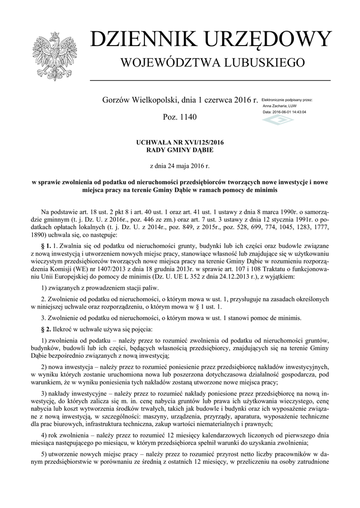 DZIENNIK URZĘDOWY WOJEWÓDZTWA LUBUSKIEGO Gorzów Wielkopolski, dnia 1 czerwca 2016 r. Elektronicznie podpisany przez: Anna Zacharia; LUW Poz. 1140 Data: 2016-06-01 14:43:04 UCHWAŁA NR XVI/125/2016 RADY GMINY DĄBIE z dnia 24 maja 2016 r. w sprawie zwolnienia od podatku od nieruchomości przedsiębiorców tworzących nowe inwestycje i nowe miejsca pracy na terenie Gminy Dąbie w ramach pomocy de minimis Na podstawie art. 18 ust. 2 pkt 8 i art. 40 ust. 1 oraz art. 41 ust. 1 ustawy z dnia 8 marca 1990r. o samorządzie gminnym (t. j. Dz. U. z 2016r., poz. 446 ze zm.) oraz art. 7 ust. 3 ustawy z dnia 12 stycznia 1991r. o podatkach opłatach lokalnych (t. j. Dz. U. z 2014r., poz. 849, z 2015r., poz. 528, 699, 774, 1045, 1283, 1777, 1890) uchwala się, co następuje: § 1. 1. Zwalnia się od podatku od nieruchomości grunty, budynki lub ich części oraz budowle związane z nową inwestycją i utworzeniem nowych miejsc pracy, stanowiące własność lub znajdujące się w użytkowaniu wieczystym przedsiębiorców tworzących nowe miejsca pracy na terenie Gminy Dąbie w rozumieniu rozporządzenia Komisji (WE) nr 1407/2013 z dnia 18 grudnia 2013r. w sprawie art. 107 i 108 Traktatu o funkcjonowaniu Unii Europejskiej do pomocy de minimis (Dz. U. UE L 352 z dnia 24.12.2013 r.), z wyjątkiem: 1) związanych z prowadzeniem stacji paliw. 2. Zwolnienie od podatku od nieruchomości, o którym mowa w ust. 1, przysługuje na zasadach określonych w niniejszej uchwale oraz rozporządzeniu, o którym mowa w § 1 ust. 1. 3. Zwolnienie od podatku od nieruchomości, o którym mowa w ust. 1 stanowi pomoc de minimis. § 2. Ilekroć w uchwale używa się pojęcia: 1) zwolnienia od podatku – należy przez to rozumieć zwolnienia od podatku od nieruchomości gruntów, budynków, budowli lub ich części, będących własnością przedsiębiorcy, znajdujących się na terenie Gminy Dąbie bezpośrednio związanych z nową inwestycją; 2) nowa inwestycja – należy przez to rozumieć poniesienie przez przedsiębiorcę nakładów inwestycyjnych, w wyniku których zostanie uruchomiona nowa lub poszerzona dotychczasowa działalność gospodarcza, pod warunkiem, że w wyniku poniesienia tych nakładów zostaną utworzone nowe miejsca pracy; 3) nakłady inwestycyjne – należy przez to rozumieć nakłady poniesione przez przedsiębiorcę na nową inwestycję, do których zalicza się m. in. cenę nabycia gruntów lub prawa ich użytkowania wieczystego, cenę nabycia lub koszt wytworzenia środków trwałych, takich jak budowle i budynki oraz ich wyposażenie związane z nową inwestycją, w szczególności: maszyny, urządzenia, przyrządy, aparatura, wyposażenie techniczne dla prac biurowych, infrastruktura techniczna, zakup wartości niematerialnych i prawnych; 4) rok zwolnienia – należy przez to rozumieć 12 miesięcy kalendarzowych liczonych od pierwszego dnia miesiąca następującego po miesiącu, w którym przedsiębiorca spełnił warunki do uzyskania zwolnienia; 5) utworzenie nowych miejsc pracy – należy przez to rozumieć przyrost netto liczby pracowników w danym przedsiębiorstwie w porównaniu ze średnią z ostatnich 12 miesięcy, w przeliczeniu na osoby zatrudnione Dziennik Urzędowy Województwa Lubuskiego –2– Poz. 1140 w pełnym wymiarze czasu pracy, przy czym od liczby nowych stanowisk pracy powstałych w związku z realizacją nowej inwestycji należy odjąć liczbę miejsc pracy zlikwidowanych w tym samym okresie. 6) przedsiębiorca – osoba fizyczna, osoba prawna i jednostka organizacyjna niebędąca osobą prawną, której odrębna ustawa przyznaje zdolność prawną – wykonująca we własnym imieniu działalność gospodarczą. § 3. Warunkiem skorzystania przez przedsiębiorcę z pomocy de minimis na podstawie niniejszej uchwały, oprócz spełnienia warunków określonych w § 6, jest złożenie przez przedsiębiorcę zawiadomienia o zamiarze skorzystania z pomocy de minimis w formie zwolnienia od podatku od nieruchomości, na druku stanowiącym załącznik nr 1 do niniejszej uchwały i dokumentów, o których mowa w § 7. § 4. 1. Pomoc przyznawana na podstawie niniejszej uchwały udzielana będzie zgodnie z przepisami rozporządzenia Komisji (WE) nr 1407/2013 z dnia 18 grudnia 2013r. w sprawie stosowania art. 107 i 108 Traktatu o funkcjonowaniu Unii Europejskiej do pomocy de minimis (Dz. Urz. UE L 352 z dnia 24.12.2013r.). 2. Przedsiębiorca, przy zachowaniu wszystkich warunków określonych w niniejszej uchwale, może uzyskać pomoc w jej ramach, jeżeli wartość tej pomocy brutto, łącznie z wartością innej pomocy de minimis, otrzymanej przez przedsiębiorcę w bieżącym roku (w roku w którym przedsiębiorca złożył zawiadomienie) oraz w dwóch poprzednich latach obrotowych, nie przekracza kwoty stanowiącej równowartość 200 tys. Euro z zastrzeżeniem, że w przypadku przedsiębiorców działających w sektorze transportu drogowego towarów kwota ta nie przekracza 100 tys. Euro, a w sektorze transportu pasażerskiego 200 tys. Euro. 3. Kwota zwolniona nie może przewyższać kwoty należnego podatku od nieruchomości z tytułu zwiększonej powierzchni i wartości budowli powstałych w wyniku inwestycji, o której mowa w § 2 pkt. 2. 4. Przedsiębiorca nie może uzyskać pomocy, o której mowa w § 1, jeżeli otrzymał inną pomoc, niż de minimis w odniesieniu do tych samych kosztów kwalifikowanych lub tego samego środka finansowania ryzyka, a łączna kwota pomocy spowodowałaby przekroczenie dopuszczalnej intensywności pomocy lub kwotę pomocy dla konkretnego przeznaczenia ustaloną w rozporządzeniu w sprawie wyłączeń grupowych lub w decyzji Komisji. § 5. Okres zwolnienia z podatku od nieruchomości wynosi odpowiednio: a) 1 rok, jeżeli w wyniku inwestycji utworzono co najmniej 3 nowe miejsca pracy, b) 3 lata, jeżeli w wyniku inwestycji utworzono co najmniej 5 nowych miejsc pracy, c) 5 lat, jeżeli w wyniku inwestycji utworzono co najmniej 10 nowych mie