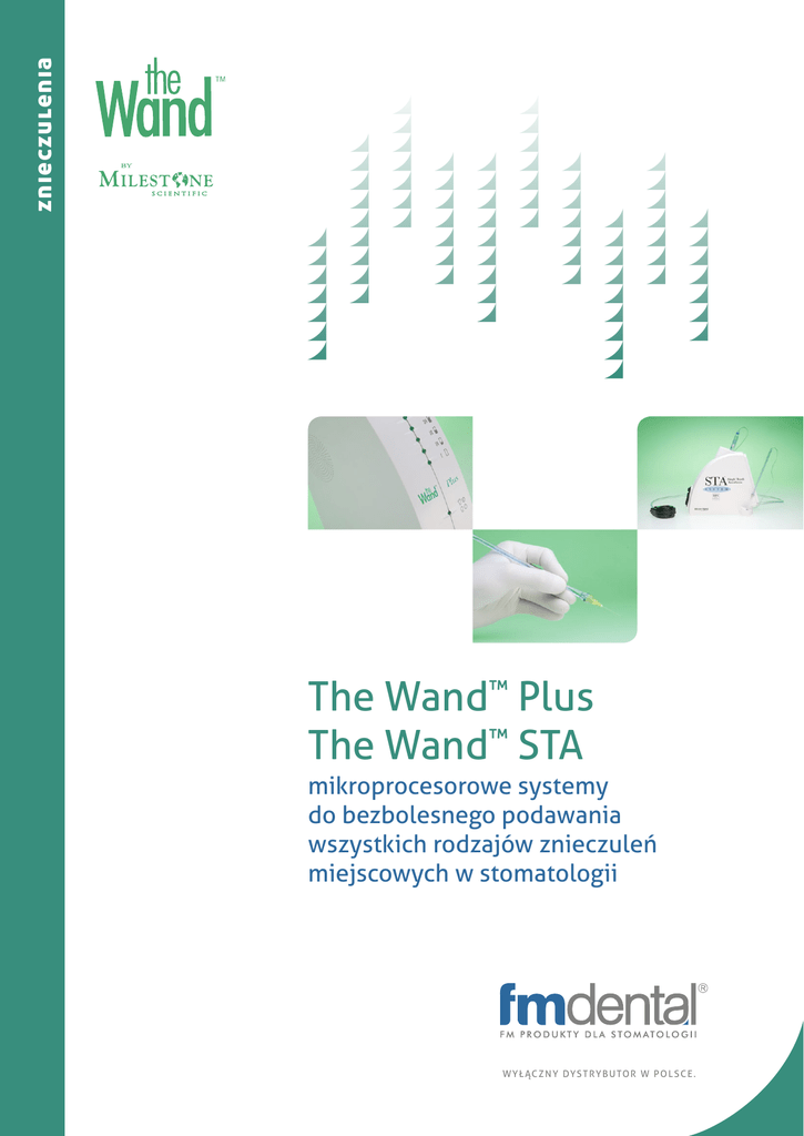znieczulenia The Wand™ Plus The Wand™ STA mikroprocesorowe systemy do bezbolesnego podawania wszystkich rodzajów znieczuleń miejscowych w stomatologii W Y Ł ĄC Z N Y DYS T RY B U TO R W P O L S C E . Spis treści Wstęp.................................................................................. 3 Jak działa The Wand........................................................ 5 Płaszcz anemizacyjny................................................ 5 Bezpieczne tempo aplikacji..................................... 5 Niezrównana precyzja............................................... 6 N awigacja i mikroprocesorowa kontrola w systemie The Wand Plus................... 8 N awigacja i mikroprocesorowa kontrola w systemie The Wand STA..................... 9 M inimalnie inwazyjne procedury stomatologiczne................................ 10 Końcówki robocze.................................................... 13 Automatyczna aspiracja.......................................... 13 Akcesoria.......................................................................... 14 Techniki znieczuleń....................................................... 16 N asiękowe (Infiltration)........................................... 17 Przewodowe oraz przewodowe żuchwy (Mandibular Block)................................................ 17 Ś ródwięzadłowe (PDL) – w obszar aparatu zawieszeniowego zęba......................... 18 Ś ródkostne (CIA) – zębowo – wyrostkowy dostęp kostny......................................................... 19 P odniebienne (AMSA) – gałązek przednich i środkowych........................................................... 20 P odniebienne (P-ASA) – przewodowe gałązek przednich z dostępu w okolicy kanału przysiecznego........................................................ 21 Domiazgowe (I-PA) – sródmiazgowe.................... 21 Wsparcie marketingowe i szkoleniowe................... 22 …w skrócie....................................................................... 23 Bezbolesne znieczulenia w stomatologii The Wand to sterowane komputerowo systemy do bezbolesnego podawania wszystkich znieczuleń miejscowych w stomatologii. Każdy system składa się z dwóch podstawowych elementów: aparatu, który kontroluje w czasie rzeczywistym prędkość i miejsce deponowania środka znieczulającego oraz jednorazowych końcówek aplikacyjnych. The Wand oferowany jest w dwóch wersjach: The Wand Plus i The Wand STA. Producentem The Wand jest firma Milestone Scientific (USA). System The Wand jest dostępny na światowym rynku od 1997 roku i od tego czasu został kilkakrotnie zmodernizowany. Obecnie z bezbolesnych i komfortowych znieczuleń wykonywanych za pomocą The Wand mogą korzystać pacjenci i lekarze niemal w 30 krajach świata na wszystkich kontynentach. Firma FM Dental, jako wyłączny polski dystrybutor oferty Milestone Scientific już od 1997 roku oferuje swoim klientom systemy The Wand a także zapewnia użytkownikom wsparcie marketingowe i merytoryczne. T H E W A N D ™ P LU S • T H E W A N D ™ S TA 3 The Wand™ Plus 4 M I L E S TO N E S C I E N T I F I C Jak działa The Wand™ Płaszcz anemizacyjny Schemat ścieżki anemizacji Lekarz za pomocą końcówki roboczej podaje anestetyk już od samego początku procedury znieczulania, również przed pierwszym kontaktem końcówki roboczej z tkankami, co pozwala bez użycia dodatkowych środków wykonać anemizację nabłonka. Krople aplikowanego środka znieczulającego tworzą przed igłą tzw. płaszcz anemizacyjny – znieczulenie jest wprowadzane bez przerwy zarówno w trakcie pasażu końcówki roboczej przez tkanki oraz po osiągnięciu przez tę końcówkę miejsca docelowego w tkankach jamy ustnej pacjenta (np. szpara ozębnowa). Cały czas anestetyk jest wprowadzany z prędkością fizjologiczną, czyli taką, która umożliwia efektywne i optymalne wchłanianie płynu przez tkanki ludzkie (0,005 ml/sek). Bezpieczne tempo aplikacji W porównaniu z innymi metodami aplikacji The Wand zapewnia lepszą wchłanialność znieczulenia, a przy tym eliminuje ryzyko mechanicznego uszkodzenia tkanek pod wpływem zbyt dużego ciśnienia środka znieczulającego. Zbyt szybkie podanie środka znieczulającego tradycyjnymi metodami powoduje bardzo często znieczulenie głównie tkanek miękkich, gdyż strumień płynu odbijając się od kości (przy podawaniu od przedsionka - twardej kości zbitej) nie dociera do struktur kości gąbczastej. W efekcie znieczulone zostają przede wszystkim tkanki miękkie, a nie ząb. Przy pomocy The Wand lekarz może wygodnie i bezpiecznie podać wymaganą dawkę znieczulenia zaś sam proces aplikacji jest bezbolesny, komfortowy dla pacjenta i absolutnie nieporównywalny z żadną inną techniką deponowania znieczuleń. Zabieg stomatologiczny można rozpocząć od razu po zakończeniu deponowania znieczulenia. Nie trzeba czekać na działanie zaaplikowanego środka, tak jak ma to miejsce przy stosowaniu strzykawki. T H E W A N D ™ P LU S • T H E W A N D ™ S TA 5 System The Wand™ umożliwia wykonanie znieczuleń miejscowych z niespotykaną dotąd skutecznością. Niezrównana precyzja To, co wyróżnia The Wand to wykorzystanie zjawiska osmozy komórkowej, co oznacza, że płyn wprowadzony do tkanek, np. do szpary ozębnowej jest absorbowany przez tkanki otaczające wierzchołek korzenia, także przez pęczek naczyniowo – nerwowy. Znieczulenia śródkostne są wykonywane bez konieczności perforacji kości, jak ma to miejsce w innych zautomatyzowanych technologiach znieczuleń. Protokół postępowania w przypadku The Wand jest łatwiejszy dla lekarza, bezpieczniejszy, bardziej komfortowy dla pacjenta i w porównaniu do innych znieczuleń absolutnie minimalnie inwazyjny. Precyzja, z jaką działa The Wand sprawia, że znieczulany jest ściśle wybrany, ograniczony obszar – np. jeden ząb, bez zbędnego znieczulenia tkanek otaczających. Pacjent znieczulon