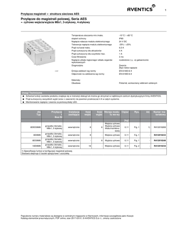 1 Przyłącza magistrali ► struktura sieciowa AES Przyłącze do magistrali polowej, Seria AES ► cyfrowe wejścia/wyjścia M8x1, 3-stykowy, 4-stykowy 21397 Temperatura otoczenia min./maks. -10°C / +60°C stopień ochrony IP65 Napięcie robocze modułu elektronicznego 24 V DC Tolerancja napięcia modułu elektronicznego -25% / +25% Prąd na kanał maks. 0,5 A Prąd sumaryczny dla aktuatorów 4A Prąd sumaryczny dla czujników max. 1A Czas filtrowania 3 ms Napięcie układu logicznego/ układu organów wykonawczych rozdzielone (-y, -a) galwanicznie Diagnostyka Zwarcie Zbyt niskie napięcie Emisja zakłóceń wg normy EN 61000-6-4 Odporność na zakłócenia wg normy EN 61000-6-2 Materiały: Obudowa Poliamid, wzmacniany włóknem szklanym Uwagi Techniczne ■ Schemat funkcji zacisków produktu znajduje się w instrukcji obsługi lub można go otrzymać w najbliższym centrum dystrybucyjnym firmy AVENTICS. ■ Prąd sumaryczny wszystkich wyjść (wraz z zaworami) nie powinien przekraczać 4 A w całym systemie. ■ Monitorowanie napięcia i zwarcia za pomocą diody LED. dla Typ Przyłącze 1 Bus IN Instalacja zasilająca Ilość wejść Ilość Wersja modu- Ciężar wyjść łu we-wy Rys. Ad. Numer materiałowy 0,11 Fig. 1 1) R412018269 [kg] 8DIDO8M8 gniazdko (female), M8x1, 3-stykowy wewnętrznie 8 8 Wejścia cyfrowe Wyjścia cyfrowe Moduł kombinowany 8DI8M8 gniazdko (female), M8x1, 3-stykowy wewnętrznie 8 - Wejścia cyfrowe 0,11 Fig. 1 - R412018233 8DO8M8 gniazdko (female), M8x1, 3-stykowy wewnętrznie - 8 Wyjścia cyfrowe 0,11 Fig. 1 - R412018248 16DI8M8 gniazdko (female), M8x1, 4-stykowy wewnętrznie 16 - Wejścia cyfrowe 0,11 Fig. 2 - R412018234 1) Specyfikacja funkcji w konfiguracji magistrali polowej. Dostawa obejmuje 2 zaciski sprężynowe i uszczelkę Pogrubione numery materiałowe są dostępne w centralnym magazynie w Niemczech, informacje szczegółowe patrz Koszyk Katalog elementów pneumatycznych, PDF online, stan 2017-03-01, © AVENTICS S.à r.l., zmiany zastrzeżone 2 Przyłącza magistrali ► struktura sieciowa AES Przyłącze do magistrali polowej, Seria AES ► cyfrowe wejścia/wyjścia M8x1, 3-stykowy, 4-stykowy Rozmiary, Fig. 1 37,5 12,5 25 50 M8x1 34 1 18,8 18,8 18,8 18,8 11 14,6 18,8 82 90,6 99,2 34 18,8 16 1 16474 1) Kątownik mocujący (opcjonalny) Funkcje styków, PNP, 3-stykowy 4 3 1 22771 Styk Moduł wejściowy Moduł wyjściowy 3 0 V DC 0 V DC 4 Sygnał wejściowy sygnał wyjściowy 1 24 V DC - Pogrubione numery materiałowe są dostępne w centralnym magazynie w Niemczech, informacje szczegółowe patrz Koszyk Katalog elementów pneumatycznych, PDF online, stan 2017-03-01, © AVENTICS S.à r.l., zmiany zastrzeżone 3 Przyłącza magistrali ► struktura sieciowa AES Przyłącze do magistrali polowej, Seria AES ► cyfrowe wejścia/wyjścia M8x1, 3-stykowy, 4-stykowy Rozmiary, Fig. 2 37,5 12,5 25 50 M8x1 34 1 18,8 18,8 18,8 18,8 11 14,6 18,8 82 90,6 99,2 34 18,8 16 1 24597 Funkcje styków, PNP, 4-stykowy 4 3 2 1 24598 Styk Moduł wejściowy 1 Napięcie czujnika 24 V DC 2 Sygnał wejściowy (najbardziej znaczący bit) 3 Napięcie czujnika 0 V DC 4 Sygnał wejściowy (najmniej znaczący bit) Pogrubione numery materiałowe są dostępne w centralnym magazynie w Niemczech, informacje szczegółowe patrz Koszyk Katalog elementów pneumatycznych, PDF online, stan 2017-03-01, © AVENTICS S.à r.l., zmiany zastrzeżone