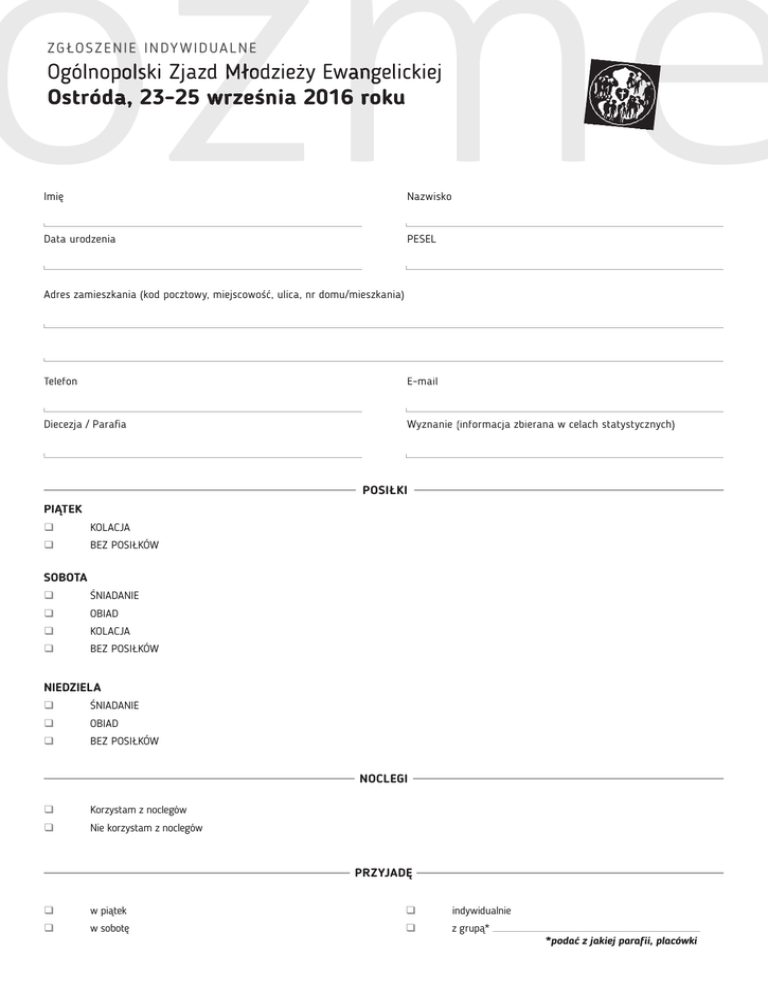 ozme Z G ŁO S Z E NI E I N DY W I D UA L N E Ogólnopolski Zjazd Młodzieży Ewangelickiej Ostróda, 23-25 września 2016 roku Imię Nazwisko Data urodzenia PESEL Adres zamieszkania (kod pocztowy, miejscowość, ulica, nr domu/mieszkania) Telefon E-mail Diecezja / Parafia Wyznanie (informac (informacja zbierana w celach statystycznych) POSIŁKI PIĄTEK KOLACJA BEZ POSIŁKÓW SOBOTA ŚNIADANIE OBIAD KOLACJA BEZ POSIŁKÓW NIEDZIELA ŚNIADANIE OBIAD BEZ POSIŁKÓW NOCLEGI Korzystam z noclegów Nie korzystam z noclegów PRZYJADĘ w piątek indywidualnie w sobotę z grupą* ...................................................................................................................................... *podać z jakiej parafii, placówki Dotyczy osób niepełnoletnich Wyraż yra am zgodę na pobyt mojego syna/córki na OZME. yraż podpis rodzica/opiekuna miejscowość, data Dane opiekuna osoby niepełnoletniej: imię i nazwisko oraz numer telefonu WYPEŁNIA DUSZPASTERZ Jest członkiem naszej parafii Jest sympatykiem naszej parafii Inne miejscowość, data pieczęć parafii i podpis duszpasterza UWAGI ZGODA ZGODA NA PRZETWARZANIE DANYCH Wyrażam zgodę na umieszczenie moich danych w adresowej bazie danych ODM oraz ich przetwarzanie zgodnie z treścią Ustawy o ochronie danych osobowych (Dz. U. nr 13, poz. 883), zastrzegając sobie prawo wglądu, aktualizacji i możliwości ich usunięcia. AKCEPTUJĘ REGULAMIN OZME 2016 miejscowość, data podpis