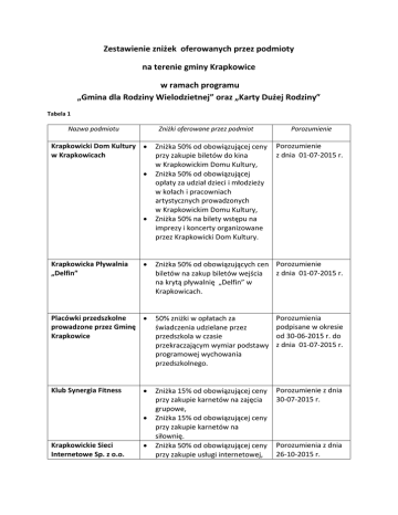 Zestawienie zniżek oferowanych przez podmioty na terenie gminy Krapkowice w ramach programu „Gmina dla Rodziny Wielodzietnej” oraz „Karty Dużej Rodziny” Tabela 1 Nazwa podmiotu Zniżki oferowane przez podmiot Krapkowicki Dom Kultury w Krapkowicach Krapkowicka Pływalnia „Delfin” Zniżka 50% od obowiązującej ceny przy zakupie biletów do kina w Krapkowickim Domu Kultury, Zniżka 50% od obowiązującej opłaty za udział dzieci i młodzieży w kołach i pracowniach artystycznych prowadzonych w Krapkowickim Domu Kultury, Zniżka 50% na bilety wstępu na imprezy i koncerty organizowane przez Krapkowicki Dom Kultury. Porozumienie Porozumienie z dnia 01-07-2015 r. Zniżka 50% od obowiązujących cen Porozumienie z dnia 01-07-2015 r. biletów na zakup biletów wejścia na krytą pływalnię „Delfin” w Krapkowicach. Placówki przedszkolne prowadzone przez Gminę Krapkowice 50% zniżki w opłatach za świadczenia udzielane przez przedszkola w czasie przekraczającym wymiar podstawy programowej wychowania przedszkolnego. Porozumienia podpisane w okresie od 30-06-2015 r. do z dnia 01-07-2015 r. Zniżka 15% od obowiązującej ceny przy zakupie karnetów na zajęcia grupowe, Zniżka 15% od obowiązującej ceny przy zakupie karnetów na siłownię. Zniżka 50% od obowiązującej ceny przy zakupie usługi internetowej, Porozumienie z dnia 30-07-2015 r. Klub Synergia Fitness Krapkowickie Sieci Internetowe Sp. z o.o. Porozumienia z dnia 26-10-2015 r. Zniżka 10% od obowiązującej ceny przy zakupie usługi telewizji/telefonu.