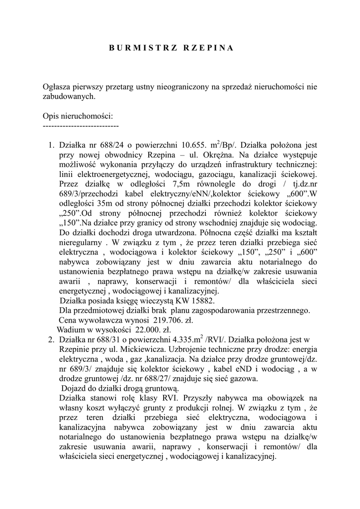 BU RMI STR Z R ZEPI NA Ogłasza pierwszy przetarg ustny nieograniczony na sprzedaŜ nieruchomości nie zabudowanych. Opis nieruchomości: --------------------------1. Działka nr 688/24 o powierzchni 10.655. m2/Bp/. Działka połoŜona jest przy nowej obwodnicy Rzepina – ul. OkręŜna. Na działce występuje moŜliwość wykonania przyłączy do urządzeń infrastruktury technicznej: linii elektroenergetycznej, wodociągu, gazociągu, kanalizacji ściekowej. Przez działkę w odległości 7,5m równolegle do drogi / tj.dz.nr 689/3/przechodzi kabel elektryczny/eNN/,kolektor ściekowy „600”.W odległości 35m od strony północnej działki przechodzi kolektor ściekowy „250”.Od strony północnej przechodzi równieŜ kolektor ściekowy „150”.Na działce przy granicy od strony wschodniej znajduje się wodociąg. Do działki dochodzi droga utwardzona. Północna część działki ma kształt nieregularny . W związku z tym , Ŝe przez teren działki przebiega sieć elektryczna , wodociągowa i kolektor ściekowy „150”, „250” i „600” nabywca zobowiązany jest w dniu zawarcia aktu notarialnego do ustanowienia bezpłatnego prawa wstępu na działkę/w zakresie usuwania awarii , naprawy, konserwacji i remontów/ dla właściciela sieci energetycznej , wodociągowej i kanalizacyjnej. Działka posiada księgę wieczystą KW 15882. Dla przedmiotowej działki brak planu zagospodarowania przestrzennego. Cena wywoławcza wynosi 219.706. zł. Wadium w wysokości 22.000. zł. 2. Działka nr 688/31 o powierzchni 4.335.m2 /RVI/. Działka połoŜona jest w Rzepinie przy ul. Mickiewicza. Uzbrojenie techniczne przy drodze: energia elektryczna , woda , gaz ,kanalizacja. Na działce przy drodze gruntowej/dz. nr 689/3/ znajduje się kolektor ściekowy , kabel eND i wodociąg , a w drodze gruntowej /dz. nr 688/27/ znajduje się sieć gazowa. Dojazd do działki drogą gruntową. Działka stanowi rolę klasy RVI. Przyszły nabywca ma obowiązek na własny koszt wyłączyć grunty z produkcji rolnej. W związku z tym , Ŝe przez teren działki przebiega sieć elektryczna, wodociągowa i kanalizacyjna nabywca zobowiązany jest w dniu zawarcia aktu notarialnego do ustanowienia bezpłatnego prawa wstępu na działkę/w zakresie usuwania awarii, naprawy , konserwacji i remontów/ dla właściciela sieci energetycznej , wodociągowej i kanalizacyjnej. Działka posiada księgę wieczystą KW 15882. Dla przedmiotowej działki brak planu zagospodarowania przestrzennego. Cena wywoławcza wynosi 105.947.zł. Wadium w wysokości 10.600.zł. 3. Działka nr 905/1 o powierzchni 3.832.m2 / IV b -1.620.m2 , ŁIV -2.212.m2 /. Działka połoŜona jest w Rzepinie przy ul. OkręŜnej. Przy ul. Poznańskiej znajduje się uzbrojenie techniczne : miejska sieć wodociągowa , sieć gazowa ,linia energetyczna. Przez działkę przechodzą 2 linie elektryczne napowietrzne. Teren działki znajduje się ok.2m poniŜej ulicy OkręŜnej. Z uwagi na występujące uŜytki rolne przyszły nabywca ma obowiązek na własny koszt wyłączyć grunty z produkcji rolnej. Dla powyŜszej działki brak planu zagospodarowania przestrzennego. Zgodnie z decyzją o warunkach zabudowy działka przeznaczona jest pod budowę kompleksu warsztatowo-usługowego obsługi samochodów osobowych polegającego na budowie sklepu, hali naprawczo-rozbiórkowej, magazynu opon , placu manewrowego i parkingu. Działka posiada księgę wieczystą KW 21674. Cena wywoławcza wynosi 77.636.zł. Wadium w wysokości 7.800.zł. Nieruchomości będące przedmiotem przetargu są bez obciąŜeń i zobowiązań. Na podstawie ustawy z dnia 11.03.2004 r. o podatku od towarów i usług /Dz. U. Nr 54 ,poz.535 z 2004r./ do ustalonej w trakcie licytacji ceny w/w nieruchomości naliczony zostanie 22% podatek VAT. Termin do złoŜenia wniosku przez osoby, którym przysługiwało pierwszeństwo w nabyciu nieruchomości na podstawie art. 34 ust.1 pkt.1 i pkt.2 upłynął dnia 02.01.2009r. Informujemy, Ŝe przetarg odbędzie się w dniu 23.02.2009r. o godz. 1000 w sali narad Urzędu Miejskiego w Rzepinie. Wadium naleŜy wnosić w pieniądzu / w kasie tut. Urzędu do godz. 1400/, lub na konto BS Rzepin 78 8371 0009-0001 8119 2000 00 80 do dnia 17.02.2009r. Dowód wpłaty wadium naleŜy przedłoŜyć komisji przetargowej przed otwarciem przetargu. Wadium wniesione przez uczestników przetargu, którzy przetarg przegrają zwraca się niezwłocznie po odwołaniu albo zamknięciu przetargu jednak nie później niŜ przed upływem 3 dni od dnia, odpowiednio: odwołania przetargu, zamknięcia przetargu. Wadium wniesione w pieniądzu przez uczestnika, który przetarg wygrał, zalicza się na poczet ceny nabytej nieruchomości. Wadium ulega przepadkowi w razie uchylenia się uczestnika, który przetarg wygrał od zawarcia umowy notarialnej. Cena nieruchomości sprzedanej w drodze przetargu podlega zapłacie nie później niŜ do dnia zawarcia umowy notarialnej. Nabywca pokrywa koszty sporządzenia umowy notarialnej. Przetarg zostanie przeprowadzony na podstawie art. 38 ustawy z dnia 21 sierpnia 1997r. o gospodarce nieruchomościami / Dz.U.Nr. 261 z 2004r. poz. 2603 z późń. zm./ i Rozporządzenia Rady Ministrów z dnia 14 września 2004r. w sprawie sposobu i trybu przeprowadzania przetargów oraz rokowań na zbycie nieruchomości /Dz.U. Nr 207 poz. 2108 z 2004r/. Ogłaszający ma prawo z uzasadnionej przyczyny do odwołania przetargu.