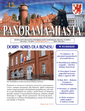 TCZEW www.bip.tczew.pl www. tczew.pl 750-LECIE MIASTA TCZEWA 1 2 6 0-2 0 1 0 PANORAMA MIASTA BEZPŁATNY BIULETYN INFORMACYJNY SAMORZĄDU MIASTA TCZEWA NR 4/242 • TCZEW • KWIECIEŃ 2011 r. ISSN 1234-5911 DOBRY ADRES DLA BIZNESU W NUMERZE •• Lokatorzy 36 mieszkań komunalnych otrzymali klucze •• Rewitalizacja nabiera rozpędu – wkrótce kolejne inwestycje •• Prezydent Tczewa nagrodził twórców filmu o agencie 007 Dom Przedsiębiorcy na kilka minut przed oficjalnym otwarciem PIERWSZY W POWIECIE TCZEWSKIM INKUBATOR PRZEDSIĘBIORCZOŚCI, miejsce przyjazne dla biznesu, gdzie zwłaszcza osoba rozpoczynająca działalność gospodarczą (ale także ta już działająca na rynku), może liczyć na fachową poradę i pomoc w prowadzeniu biznesu, miejsce, dzięki któremu w ciągu 10 lat powstanie 70 nowych firm – wszystko to w Domu Przedsiębiorcy, który od 15 kwietnia działa w Tczewie. •• Rok 2011 – Rokiem Grzegorza Ciechowskiego •• Przemoc w rodzinie – sprawdź, gdzie znajdziesz pomoc •• Dwie wystawy, jeden papież – w Fabryce Sztuk Więcej na str. 10-11 ² 1 www. tczew.pl www.bip.tczew.pl Posprzątaj po swoim psie Właściciele psów pod kontrolą Straż Miejska prowadzi wzmożone kontrole osób wyprowadzających psy. Tylko w marcu, w wyniku przeprowadzonych działań nałożono 55 mandatów karnych oraz pouczono 47 osób. Patrole trwały codziennie w godz. 5.30-9.30. Mandatami ukarano 33 osoby, które nie zachowywały środków ostrożności przy trzymaniu psa, dwie sprawy skierowano do sądu, pouczono 35 osób. Na podstawie art. 145 Kodeksu Wykroczeń – mówiącego o zanieczyszczaniu miejsc publicznych przez psy, nałożono 12 mandatów karnych na właścicieli oraz pouczono 12 osób. Pozostałe poranne interwencje dotyczyły parkowania na zakazie zatrzymywania się (2 mandaty), spożywania alkoholu w miejscach niedozwolonych (5 mandatów), zaśmiecania miejsc publicznych (2 mandaty), palenia papierosów pod wiatą przystankową (1 mandat). W ciągu miesiąca funkcjonariusze Straży Miejskiej przekazali mieszkańcom 840 zestawów do zbierania odchodów po psach. Informacja o osobach ukaranych i pouczonych za wyprowadzanie psa bez smyczy została przekazana do Wydziału Podatków i Budżetu UM, po to by sprawdzić, czy osoby te uiszczają należne opłaty za posiadanie psa. Równocześnie z wyżej wymienionymi działaniami, funkcjonariusze tczewskiej Straży Miejskiej prowadzili pogadanki profilaktyczne w szkołach. Działania dotyczące czystości i porządku, a szczególnie „psich spraw” są nadal kontynuowane. M.M. Rada Miejska w pełnym składzie Podczas marcowej sesji do grona tczewskich radnych dołączył Kazimierz Mokwa (PO). Radny złożył ślubowanie i rozpoczął samorządową pracę. Kazimierz Mokwa wybrany został w listopadowych wyborach, tak jak wszyscy pozostali członkowie Rady Miejskiej, jednak obowiązki zawodowe nie pozwoliły mu wcześniej objąć mandatu – przebywał w kilkumiesięcznym rejsie. Jak powiedział, przed emeryturą czeka go jeszcze jedynie krótka wyprawa (2-3 miesiące), więc będzie mógł sumiennie wykonywać swoje obowiązki w radzie. Kazimierz Mokwa został wybrany z Osiedla Witosa i bardzo zależy mu na tym, aby na Górkach wybudowano świetlicę oraz boisko wielofunkcyjne. K. Mokwa jest członkiem Stowarzyszenia Górki, które przyczyniło się m.in. do zorganizowania na tym osiedlu skweru rekreacyjnego im. 750-lecia Tczewa Kazimierz Mokwa zamierza pracować w trzech komisjach Rady Miejskiej: Komisji Polityki Gospodarczej, Komisji Finansowo-Budżetowej oraz Komisji Edukacji, Kultury i Kultury Fizycznej. M.M. VIII SESJA Proponowany porządek obrad VIII sesji Rady Miejskiej w Tczewie na dzień 28 kwietnia 2011 r. (czwartek) o godz. 10.00 w sali konferencyjnej im. F. Fabicha w Urzędzie Miejskim w Tczewie I. CZĘŚĆ PIERWSZA: 1. 2. 3. 4. Otwarcie sesji i powitanie gości. Sprawdzenie obecności radnych. Przedstawienie proponowanego porządku obrad sesji. Przyjęcie protokołu z sesji Rady Miejskiej w Tczewie z 31 marca 2011 r. 5. Informacja z działalności Prezydenta Miasta Tczewa. 6. Informacja z interpelacji zgłoszonych przez radnych w okresie od 31 marca do 27 kwietnia 2011 r. II . CZĘŚĆ DRUGA: 7. Sprawozdanie z rozliczenia przyznanych dotacji organizacjom pozarządowym za 2010 r. oraz informacja o współpracy z organizacjami w zakresie: – Edukacyjnej Opieki Wychowawczej, – Ochrony Zdrowia, – Pomocy Społecznej, – Kultury Fizycznej i Sportu, – Kultury i Ochrony Dziedzictwa Narodowego, – Prowadzenia Informacji Turystycznej – Upowszechniania Turystyki. 8. Informacja z realizacji zadań Gminnego Programu Profilaktyki i Rozwiązywania Problemów Alkoholowych i Przeciwdziałania Narkomanii za rok 2010. 9. Informacja o stanie finansowym Zakładu Gospodarki Komunalnym Zasobem Mieszkaniowym w Tczewie. 10. Podjęcie uchwał w sprawie: 10.1 zmieniająca uchwałę w sprawie przystąpienia Gminy Miejskiej Tczew do stowarzyszenia gmin i powiatów pod nazwą Ogólnopolska Federacja Młodzieżowych Samorządów Lokalnych, 10.2 przyjęcia zadań z zakresu administracji rządowej. 11. Zgłaszanie interpelacji i zapytań oraz wniosków. 12. Wolne wnioski, informacje oraz oświadczenia. Porządek sporządzono 7.04.2011 r. ILU NAS JEST? 1 kwietnia 2011 r. w Tczewie zameldowanych było 59 858 osób, w tym 58 750 na pobyt stały i 1108 na pobyt czasowy. Od początku marca ubyło 22 mieszkańców miasta. PANORAMA MIASTA – BIULETYN INFORMACYJNY SAMORZĄDU MIASTA TCZEWA RADA PROGRAMOWA: przewodniczący – Kazimierz Ickiewicz CZŁONKOWIE – Zenon Drewa, Ludwik Kiedrowski, Zyta Myszka, Barbara Kamińska, Włodzimierz Mroczkowski, Zbigniew Urban. REDAKTOR NACZELNA – Małgorzata Mykowska. Urząd Miejski Tczew, Biuro Promocji Miasta 77-59-322 WYDAWCA: Miejska Biblioteka Publiczna im. Aleksandra Skulteta, ul. J. Dąbrowskiego 6, 531-35-50; 531-36-37 2 www.bip.tczew.pl www. tczew.pl 36 nowych mieszkań prz