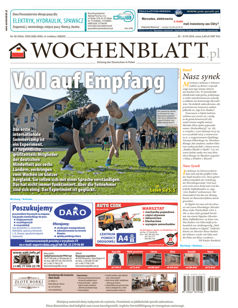 Znajomość j. niemieckiego, miejsce pracy: Niemcy, Austria LARES: Diese Materialien sind lediglich zum Lesen bereitgestellt. Jegliche Vervielfältigung ist strengstens untersagt. Nr 30 (1164), ISSN 2082-8195, nr indeksu 368202 8006 Agencja Pracy Sp. z o.o. ul. Oleska 121b, 45-231 Opole, tel. 77/4548566, 77/5506895, 668831028, 513106189 www.diwa-personalservice.pl [email protected]: 6760 Elektryk, Hydraulik, Spawacz LARES: Niniejszy materiał służy wyłącznie do czytania. Powielanie w jakikolwiek sposób zabronione. 8003 25 – 31 VII 2014, cena 2,40 zł (VAT 5%) WOCHENBLATT.pl Voll auf Empfang LARES: Niniejszy materiał służy wyłącznie do czytania. Powielanie w jakikolwiek sposób zabronione. LARES: Diese Materialien sind lediglich zum Lesen bereitgestellt. Jegliche Vervielfältigung ist strengstens untersagt. Zeitung der Deutschen in Polen Foto: Juliane Preiß Nanu? LARES: Niniejszy materiał służy wyłącznie do czytania. Powielanie w jakikolwiek sposób zabronione. LARES: Diese Materialien sind lediglich zum Lesen bereitgestellt. Jegliche Vervielfältigung ist strengstens untersagt. Nasz synek M ieszkańcy Schönau w Schwarzwaldzie są dumni z największego syna tego miasta, którym jest Joachim Löw. W poniedziałek obradowała rada gminy, podejmując w trybie natychmiastowym uchwałę o nadaniu mu honorowego obywatelstwa. Na dodatek zadecydowano, aby przemianować miejscowy stadion piłkarski na „Jogi-Löw-Stadion”. Tymczasem w Opolu ludziom niełatwo jest oswoić się z myślą, że do grona honorowych obywateli miasta mógłby należeć Miroslav Klose (patrz poprzedni numer „Wochenblatt.pl”, str. 10), w związku z czym dyskusja toczy się tu o szczebelek niżej, a mianowicie m.in. o zorganizowaniu Opolskiego Turnieju Piłkarskiego im. Miroslava Klosego. Jak wiadomo, stadion Odry nosi nudną jak flaki z olejem nazwę „Stadion Miejski w Opolu”. Czy nie warto byłoby nadać mu imię Miroslava Klosego, by Ślązaków pogodzić z Odrą, a Polaków z Klosem? LARES: Niniejszy materiał służy wyłącznie do czytania. Powielanie w jakikolwiek sposób zabronione. LARES: Diese Materialien sind lediglich zum Lesen bereitgestellt. Jegliche Vervielfältigung ist strengstens untersagt. Wer sammelt am schnellsten die Karten für seine Mannschaft zusammen? Jeder Tag im Sommercamp beginnt mit einem Spiel, erklärt wird auf deutsch. Foto: Juliane Preiß LARES: Niniejszy materiał służy wyłącznie do czytania. Powielanie w jakikolwiek sposób zabronione. LARES: Diese Materialien sind lediglich zum Lesen bereitgestellt. Jegliche Vervielfältigung ist strengstens untersagt. Das erste internationale Sommercamp ist LARES: Niniejszy materiał służy wyłącznie do czytania. Powielanie w jakikolwiek sposób zabronione. ein Experiment. Diese Materialien sind lediglich zum Lesen bereitgestellt. Jegliche Vervielfältigung ist strengstens untersagt. 67LARES: Jugendliche, größtenteils Mitglieder der deutschen Minderheit aus sechs Nasz Synek LARES: Niniejszy materiał służy wyłącznie do czytania. Powielanie w jakikolwiek sposób zabronione. Ländern, verbringen n Schönau im Schwarzwald ist LARES: Diese Materialien sind lediglich zum Lesen bereitgestellt. Jegliche Vervielfältigung ist strengstens I man stolz untersagt. auf den größten Sohn zwei Wochen im Glatzer der Stadt Joachim Löw. Dazu gehört selbstverständlich die Verleihung Bergland. Sie sollen sich mit einer Sprache verständigen. der Ehrenbürgerschaft. Und man Das hat nicht immer funktioniert. Aber die Teilnehmer setzt noch einen drauf und wird das örtliche Fußballstadion in „Jogisind sich einig: Experiment geglückt. Lesen Siesposób S. 5 zabronione. LARES:Das Niniejszy materiałist służy wyłącznie do czytania. Powielanie w jakikolwiek -Löw-Stadion“ umbenennen. Der Gemeinderat hat dies am Montag LARES: Diese Materialien sind lediglich zum Lesen bereitgestellt. Jegliche Vervielfältigung ist strengstens untersagt.durchbereits im Hauruckverfahren Werbung / Reklama Poszukujemy pracowników fizycznych ze znajomością języka niemieckiego do prac: n magazynowych n recyclingowych n na produkcji oraz specjalistów z j. niemieckim: elektryków, spawaczy, kierowców C+E, ślusarzy, operatorów koparek i ładowarek warsztat Bernard Czok lmechanika pojazdowa lczęści używane llakiernictwo lblacharstwo lwynajem samochodów gewunken. In Oppeln tut man sich da schwerer mit einem Ehrenbürger Miroslav Klose (siehe Wochenblatt 1163, S. 10), so dass tiefer gestapelt bereits nur von einem Oppelner MiroslavKlose-Fußballturnier zu hören war. Das Stadion von Odra heißt ja bekanntlich nur stinklangweilig „Städtisches Stadion in Oppeln“. Vielleicht könnte ein Miroslav-Klose-Stadion die Schlesier wieder mit Odra und die Polen mit Klose versöhnen… Till Scholtz-Knobloch LARES: Niniejszy materiał służy wyłącznie do czytania. Powielanie w jakikolwiek sposób zabronione. LARES: Diese Materialien sind lediglich zum Lesen bereitgestellt. Jegliche Vervielfältigung ist strengstens untersagt. Oferujemy: n atrakcyjne wynagrodzenie n zakwaterowanie na terenie Niemiec n opiekę polskiego biura 46-022 Kępa k. Opola, ul. Wróblińska 17b tel./fax: 77 456 86 58 kom. 602 369 462 (A4) 661 333 777 604 963 702 CENTRUM LARES: Niniejszy materiał służy wyłącznie POMOCY do czytania. Powielanie w jakikolwiek sposób zabronione. Zainteresowanych prosimy o wysyłanie CV DROGOWEJ www.autoczok.pl LARES: Diese Materialienlub sind ist strengstens untersagt. na e-mail: [email protected] Tel.lediglich 32 279 96 80zum Lesen bereitgestellt. Jegliche Vervielfältigung 7877 Werbung / Reklama Nowy punkt: Zakład Kamieniarski PPHU Sati 46-073 Wrzoski, ul. Wrocławska 24 tel. kom. 880 370 130, 784 518 593 tel. (+48) 77 546 22 78 [email protected] 7963 Oddział Ekspozycja nagrobków 46-020 Krzanowice, Stara Droga 6 i 8 tel. kom. (+48) 666 523 384 tel. (+48) 77 546 21 84 [email protected] Nagrobki Płytki granitowe Schody Blaty Kominki Tara