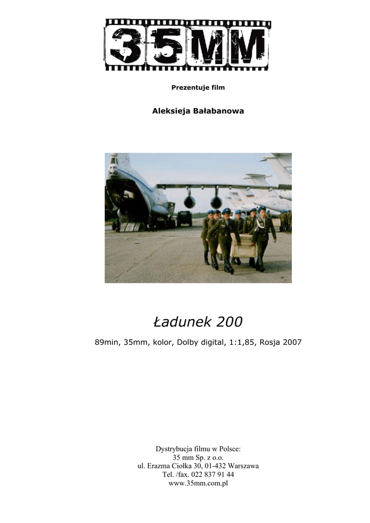 Prezentuje film Aleksieja Bałabanowa Ładunek 200 89min, 35mm, kolor, Dolby digital, 1:1,85, Rosja 2007 Dystrybucja filmu w Polsce: 35 mm Sp. z o.o. ul. Erazma Ciołka 30, 01-432 Warszawa Tel. /fax. 022 837 91 44 www.35mm.com.pl TWÓRCY: Reżyser: Aleksiej Bałabanow Scenariusz: Aleksiej Bałabanow Operator: Aleksander Simonow Montaż: Tatiana Kuzmiczewa Montaż dźwięku: Michaił Nikołajew Kostiumy: Nadieżda Wasiljewa Scenografia: Paweł Parchomenko Producent: Siergiej Seljanow Producent wykonawczy: Maxim Ukanow OBSADA: Aleksiej - ALEKSIEJ SEREBRYAKOV Artyom - LEONID GROMOW Michaił - JURIJ STIEPANOW Angelika - AGNIJA KUŹNECOWA Żurow - ALEKSIEJ POLUJAN Sunka - MICHAIŁ SKRJABIN Valera - LEONID BICHEVIN Antonina - NATALJA AKIMOWA Matka Żurowa - WALENTINA ANDRJUKOWA Naboev - ANDRIEJ MOKEEV Żona Artyoma - LIKA NEWOLINA FESTIWALE I NAGRODY: • • • Festiwal Filmów Rosyjskich „Kinotawr”, Soczi 2007 – Nagroda krytyków; Venice Days – film otwierający; Festiwal Filmowy w Telluride; FABUŁA FILMU Ładunek 200 to termin wojskowy określający ładunek ciał wysyłanych po wojnie do domu. „Ładunek-200” jest jedenastym filmem Aleksieja Bałabanowa. Nowe dzieło opowiada o zmierzchu totalitaryzmu na początku 1984 roku, u świtu pierestrojki, kiedy to ciemność życia zgęstniała do maksimum. W swoim nowym filmie Bałabanow obiecuje wyjaśnić wszystko o sobie, o swoim kraju i jego bohaterach w sposób bardziej szczery niż w poprzednich obrazach. ZSSR, rok 1984. Koniec ery sowieckiej. Prowincjonalne miasteczko. Po wyjściu do klubu, znika córka sekretarza okręgowego komitetu Partii Komunistycznej. Nie ma żadnych świadków. Nie odnaleziono żadnych podejrzanych. Tego samego wieczoru, w domu na przedmieściach miasteczka zostaje popełnione brutalne morderstwo. Sprawcą jest właściciel domu. Oba śledztwa prowadzi kapitan milicji Żurow. BIOGRAFIA REŻYSERA I FILMOGRAFIA Reżyser, scenarzysta, producent ALEKSIEJ BAŁABANOW urodził się w Swierdłowosku (teraz Jekaterynburg) w 1959 r. Ukończył Kolegium Języków Obcych w Gorki i kurs reżyserski w Moskwie. Zrobił dwa filmy dokumentalne i przeniósł się do Sankt Petersburga, gdzie wyreżyserował swój pierwszy pełnometrażowy film. FILMOGRAFIA: „Radosne dni” (reżyser, scenariusz) Oficjalna nominacja do Festiwalu Filmowego Cannes ’92 5 nagród krajowych Wyświetlany w: UK „Zamek” (reżyser, scenariusz) Koprodukcja rosyjsko –francusko -niemiecka Oficjalna nominacja do festiwalu Montreal ‘94, Rotterdam ‘95 2 nagrody krajowe Wyświetlany w: Polsce, Węgrzech, UK „Trofim” (reżyser, scenariusz) Grand Prix dla najlepszego filmu krótkometrażowego “Message to a Man” Międzynarodowy Festiwal Filmowy (St. Petersburg) Festiwal Filmowy w Nowym Jorku ‘96 Clermont-Ferrand ‘97 “Siergiej Eizenstein. Autobiografia.” (Producent) „Brat” (reżyser, scenariusz) Oficjalna nominacja do festiwalu Cannes ‘97 Międzynarodowy Festiwal Filmowy w Chicago ‘97 –najlepszy aktor Międzynarodowy Festiwal Filmowy Cottbus ‘97- specjalna nagroda jury Manaki Brothers (Macedonia) ‘97 – złota nagroda za zdjęcia Międzynarodowy Festiwal Filmowy w Turynie ‘97 – nagroda Fipresci, specjalna nagroda jury 2 nagrody krajowe Wyświetlany w 10 krajach, m.in. USA, Włochy, Japonia „O potworach i ludziach” (reżyser, scenariusz) Oficjalna nominacja do festiwalu Cannes ‘98 Międzynarodowy Festiwal Filmowy w Montrealu Międzynarodowy Festiwal Filmowy w Chicago Wyświetlany w: Kanadzie (prowincje anglojęzyczne), Francji,Izraelu, Węgrzech, Japonii, Meksyku, Polsce, Szwecji, UK, USA „Brat 2” (reżyser, scenariusz) 25 nominacji krajowych Wyświetlany w: Australii, Włoszech, Węgrzech, Polsce, UK „Wojna”(reżyser, scenariusz) 34 festiwale, 8 nagród, m.in. Międzynarodowy Festiwal Filmowy w Montrealu – Najlepszy aktor Wyświetlany w: Australii, Bułgarii, Hong Kongu, Węgrzech, Japonii, Polsce, Serbii, UK „Rzeka” (reżyser, scenariusz) Nieskończona wersja 5 nominacji do festiwali, m.in. Międzynarodowy Festiwal Filmowy w Wenecji „Ciuciubabka” (reżyser, scenariusz) „To nie boli” (reżyser) „Ładunek 200” (reżyser, scenariusz) SERGEY SELYANOV i CTB FILM COMPANY Producent Jako założyciel i współwłaściciel (razem z reżyserem Aleksiejem Bałabanowem) CTB Film Company, Sergey Selyanov należy do najbardziej oddanych i odnoszących sukcesy producentów niezależnych w nowoczesnej Rosji. Sergey urodził się na północy Rosji w 1955 r. i studiował na Politechnice, gdzie założył studio filmowe. W 1980 r. ukończył Wydział Scenariuszu w Rosyjskim Państwowym Instytucie Kinematografii (WGIK). W latach 1987-88 ukończył także Wyższe Kursy Scenariuszu i Reżyserii w Moskwie. W 1992 r. założył CTB Film Company. Firma ta wyprodukowała ponad 40 filmów pełnometrażowych i dokumentalnych, a także wiele programów telewizyjnych. Były to między innymi takie tytuły, jak festiwalowi ulubieńcy i sukcesy kasowe jak BRAT, O POTWORACH I LUDZIACH, BRAT 2 i WOJNA Aleksieja Bałabanowa, POSTERUNEK i KUKUŁKA Aleksandra Rogożkina, OLIGARCHA Pawła Lunguina, STRACH NA WRÓBLE i DWÓCH KIEROWCÓW Aleksandra Kotta oraz BUMER Petra Buslowa. W 1998 r. Sergey został odznaczony Medalem Chanżonkowa jako Najlepszy Rosyjski Producent. W 1999 r. otrzymał Nagrodę dla najlepszego producenta od American Motion Picture Association (Amerykańskiego Stowarzyszenia Studiów Filmowych) za wybitne osiągnięcia w rozwoju niezależnej produkcji filmowej w Rosji. Państwowe Stowarzyszenie Rosyjskich Krytyków Filmowych oraz prasa filmowa nagrodziła Sergeya nagrodą specjalną jako Najlepszego Producenta Filmowego lat 90-tych XX w. i nagrodą specjalną “za odwagę w promowaniu krajowej kinematografii na rosyjskich ekranach”. W 2003 r. magazyn ekonomiczny Expert scharakteryzował Sergeya Selyanova jako “jedynego rosyjskiego producenta filmowego, którego nazwisko stało się marką sam