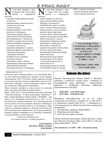 N a sesji Rady Miejskiej w dniu 30 grudnia 2009 roku podjęto uchwały w następujących sprawach: • uchwalenia budżetu gminy Koniecpol na 2010 rok; • udzielenia pomocy finansowej przez Gminę na rzecz Powiatu Częstochowskiego; • sprzedaży działek nr 4530, 5439/2 położonych w Koniecpolu stanowiących własność gminy na podstawie KW 41925 prowadzonej przez Sąd Rejonowy w Myszkowie; • określenia wymagań, jakie powinien spełnić przedsiębiorca ubiegający się o uzyskanie zezwolenia na prowadzenie działalności w zakresie odbierania odpadów komunalnych od właścicieli nieruchomości i opróżniania zbiorników bezodpływowych i transportu nieczystości ciekłych; • zatwierdzenia zmian w Statucie Samodzielnego Publicznego Zakładu Opieki Zdrowotnej Miejska Przychodnia Rejonowa w Koniecpolu. N a sesji Rady Miejskiej w dniu 17 lutego 2010 roku podjęto uchwały w następujących sprawach: • zmian w budżecie na 2010 rok; • zmian uchwały budżetowej Rady Miejskiej w Koniecpolu Nr XXXIII/227/09 z dnia 30.12.2009 r.; • zmian w Statucie Gminy Koniecpol; • zmiany uchwały w sprawie przyjęcia projektów herbu, flagi, baneru i pieczęci Miasta i Gminy Koniecpol; • zaopiniowania projektu uchwały Rady Miasta Częstochowy w sprawie przekształcenia Miejskiego Szpitala Zespolonego z siedzibą przy ul. Mirowskiej w Częstochowie; • zaopiniowania projektu Uchwały Rady Powiatu w sprawie likwidacji Samodzielnego Publicznego Zakładu Opieki Zdrowotnej Wielospecjalistycznego Szpitala Powiatowego im. dr. B. Hagera w Tarnowskich Górach przy ul. Pyskowickiej 47-51; • wprowadzenie zmiany do uchwały nr XXX/208/09 z dnia 29 września dokończenie ze str. 20 Z bieżących spraw informuję Państwa, że na Przychodni Zdrowia trwa malowanie pomieszczeń, zakupione są dwa gabinety stomatologiczne, RTG. W kwietniu zostanie ogłoszony przetarg na elewację zewnętrzną. Nareszcie podpisaliśmy umowę na dofinansowanie wodociągu w Starym Koniecpolu, Luborczy, Zagaciu, Ludwinowie, Aleksandrowie i Michałowie. Mamy przyznane pieniądze na zakup maszyn do sortowania śmieci oraz zakup samochodu do zbierania śmieci. Boisko „Orlik” jest w wykazie dofinansowania przez Marszałka i Wojewodę Śląskiego. 16 marca przekazujemy wykonawcy który wygrał przetarg na budowę drogi i chodników - plac budowy na ul. Żeromskiego od kościoła na tzw. „kuty” i ul. Armii Ludowej do ostatnich zabudowań. Po 8 latach przygotowań wreszcie sprawa może być pomyślnie zakończona. Wodociąg na Teresowie i zakres obecnych robót na ul. Żeromskiego i Armii Ludowej to wieloletnia awantura z p. Markiem Lisem, który chodził za tymi sprawami. Podobnie było i jest ze sprawą kanalizacji sanitarnej, drogami i chodnikami na ul. Kościelnej i Kilińskiego, za którymi chodził p. Leszek Tutajewicz. Z okazji Świąt Wielkanocnych życzę Państwu zdrowia i wszelkiej pomyślności. Z poważaniem Burmistrz Miasta i Gminy Józef Kałuża 2 - marzec 201 0 2009 r. w sprawie utworzenia i realizacji programu osłonowego z zakresu pomocy społecznej. Z okazji nadchodzących Świąt Zmartwychwstania Pańskiego życzenia radosnej nadziei, uśmiechu i wiary, na dziś i na jutro. Dni wspólnie spędzonych z kochającą rodziną, pełnych pokoju i zgody. Wesołego Alleluja! Przewodniczący Mirosław Cegieła wraz z Radą Miejską Kol on i e d l a d zi eci Krajowe Stowarzyszenie Pomocy Szkole w Warszawie informuje o możliwości wyjazdu dzieci i młodzieży na dwutygodniowy turnus rekreacyjno – wypoczynkowy połączony z profilaktyką zdrowotną, edukacyjną, krajoznawstwem i turystyką. 1. 2. 28.06.2010 – 11.07.2010 Stegna 20.07.2010 – 12.08.2010 Łeba Warunkiem zakwalifikowania się do ww. formy wypoczynku jest złożenie w terminie do 15 maja 2010 r. w sekretariacie Zespołu Szkół SP nr 1 i Gimnazjum nr 1 w Koniecpolu przy ul. Mickiewicza 26 niżej wymienionych dokumentów: 1. Zaświadczenie o płatności składek KRUS. 2. Wypełniona karta kolonijna. 3. Ksero dowodu wpłaty za kolonie. Istnieje możliwość skorzystania z koloni dla dzieci z rodzin nie rolniczych. Wysokość opłaty wynosi 600 zł. A dla tych, którzy płacą KRUS – 390 zł. Tel. kontaktowy: 34 3551 – 408 – sekretariat szkoły. J u bi l eu sz 5 0 -l eci a m a łżeń stwa „ Tyle razem dróg przebytych. . . ” 50. rocznica zawarcia związku małżeńskiego to wyjątkowa okazja do podsumowań i refleksji nad zmieniającym się na przestrzeni lat uczuciem dwojga ludzi. Z tego też powodu 17 grudnia 2009 roku zorganizowano niecodzienną uroczystość, mającą na celu uhonorowanie szanownych jubilatów medalami nadawanymi przez Prezydenta RP. Miejscem spotkania była sala Ośrodka Kultury, Sportu i Rekreacji w Koniecpolu. Szanownych Jubilatów przywitał Burmistrz Józef Kałuża, który podkreślił że te wspólne 50 lat to symbol wierności i miłości rodzinnej, to dowód wzajemnego zrozumienia i istoty związku małżeńskiego, to wzór i piękny przykład dla młodych pokoleń. Za zgodność pożycia małżeńskiego, za trud pracy i wyrzeczeń dla dobra swych rodzin założonych przed pół wiekiem, za wychowanie dzieci, za noce przy nich nieprzespane, za cierpienia, łzy, radości, za każdy siły włos na ich skroni Jubilaci zostali odznaczeni przez Prezydenta RP medalami. Aktu dekoracji dokonał Burmistrz Józef Kałuża w towarzystwie Wiceburmistrza Janusza Stypki, Sekretarza Gminy Jerzego Maszewskiego, Przewodniczącego Ra- dy Miejskiej Mirosława Cegieły i Zastępcy Kierownika USC Sławomira Gałwiaczka. Po uroczystym wręczeniu medali, pamiątkowych upominków i kwiatów odśpiewano 100 lat. Szanowni Goście obejrzeli część artystyczną przygotowaną przez uczniów Zespołu Szkół im. J. Piłsudskiego. Już sama obecność tak licznego grona młodych adeptów sztuki, ubranych w stroje z różnych epok – przy tym radosnych i miłych – wniósł wiele ciepła w dość wychłodzoną sale widowiskową i od