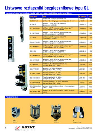 Listwowe rozłączniki bezpiecznikowe typu SL Listwowe rozłączniki bezpiecznikowe typu SL, kaŜda faza rozłączana oddzielnie, rozstaw szyn 185 mm Oznaczenie Opis Nr artykułu Cena SL00-3X/F Wielkość 00, 160A, przyłącze: śruba M8 L5431002 204 SL00-3X/KU00 Wielkość 00, 160A, przyłącze: zacisk typu U do 95 mm2 L5496061 208 SL1-3X/3A Wielkość 1, 250A, przyłącze: śruba M10 (poprzedni nr L1931001) L193100195 345 SL1-3X/9/KM2G-F Wielkość 1, 250A, przyłącze: zacisk ramkowy typu V do 240 mm2 (poprzedni nr L1996004) L199600495 365 SL1-3X/9/KM2G Wielkość 1, 250A, przyłącze: zacisk ramkowy typu V do 300 mm2 (poprzedni nr L1996029) L199602995 370 SL2-3X/3A Wielkość 2, 400A, przyłącze: śruba M12 (poprzedni nr L2931001) L293100195 345 SL2-3X/9/KM2G-F Wielkość 2, 400A, przyłącze: zacisk ramkowy typu V do 240 mm2 (poprzedni nr L2996004) L299600495 365 SL2-3X/9/KM2G Wielkość 2, 400A, przyłącze: zacisk ramkowy typu V do 300 mm2 (poprzedni nr L2996005) L299600595 370 SL3-3X/3A Wielkość 3, 630A, przyłącze: śruba M12 do 300 mm2 (poprzedni nr L3931001) L393100195 430 SL3-3X/9/KM2G-F Wielkość 3, 630A, przyłącze: zacisk ramkowy typu V do 240 mm2 (poprzedni nr L3996018) L399601895 450 SL3-3X/9/KM2G Wielkość 3, 630A, przyłącze: zacisk ramkowy typu V do 300 mm2 (poprzedni nr L3996004) L399600495 455 SL3-3X/910/HA Wielkość 3, do 910A z bezpiecznikami gTr, przyłącze: śruba M12, z osłoną L3921200 1030 SL3-3X/1000/HA Wielkość 3, do 1000A ze zworami, przyłącze: śruba M12, z osłoną L3921300 810 SL3-3X2/1250/HA Podwójny, wielkość 3, do 1250A, przyłącze: śruby M12, z osłoną L3921400 1400 SL3-3X2/1600/HA Podwójny, wielkość 3, do 1600A, przyłącze: śruby M12, z osłoną L3921402 1530 SL3-3X2/2000/HA Podwójny, wielkość 3, do 2000A ze zworami, przyłącze: śruby M12, z osłoną L3921507 2690 SLTL4A-3AS/3x/2x3A/ Q/147/HA Wielkość: 4A, do 1250A, szerokość: 147 mm, przyłącze: 2xM12, z osłoną L4231049 2600 SLTL4A-3AS/3x/4 Wielkość: 4A, do 1250A, szerokość: 248 mm, przyłącze: 1xM16 L4941000 1500 Przyłącza kablowe 6 KU00 KM2G-F KM2G 3A do 95 mm2 do 240 mm2 do 300 mm2 przyłącze na śrubę Inne wykonania na zapytanie. Zastrzega się prawo zmian technicznych i cen. Listwowe rozłączniki bezpiecznikowe typu SL, 3 fazy rozłączane jednocześnie, rozstaw szyn 100 i 185 mm Wersja na system szyn o rozstawie 100 mm Inne wykonania na zapytanie. Zastrzega się prawo zmian technicznych i cen. Oznaczenie Opis Nr artykułu Cena SL00-3x3/100/F Wielkość 00, 160A, rozstaw szyn 100 mm, przyłącze: śruba M8 L5051001 154 SL00-3x3/100/KU00 Wielkość 00, 160A, rozstaw szyn 100 mm, przyłącze: zacisk ramkowy typu U do 95 mm2 L5056003 158 SL00-3x3/100/W/KU00 Wielkość 00, 160A, rozstaw szyn 100 mm, zacisk ramkowy typu U do 95 mm2, z moŜliwością wbudowania przekładników L5356003 172 SL00-3X3/F Wielkość 00, 160A , przyłącze: śruba M8 L5531001 204 SL00-3X3/KU00 Wielkość 00, 160A, przyłącze: zacisk ramkowy typu U do 95 mm2 L5596033 208 SL1-3X3/3A Wielkość 1, 250A, przyłącze: śruba M10 (poprzedni nr L1031001) L103100195 360 SL1-3X3/9/KM2G-F Wielkość 1, 250A, przyłącze: zacisk ramkowy typu V do 240 mm2 (poprzedni nr L1096004) L109600495 368 SL1-3x3/9/KM2G Wielkość 1, do 250A, przyłącze: zacisk ramkowy typu V do 300 mm2 (poprzedni nr L1096026) L109602695 374 SL2-3X3/3A Wielkość 2, 400A, przyłącze: śruba M12 (poprzedni nr L2031001) L203100195 360 SL2-3x3/W/3A Wielkość 2, do 400A, przyłącze: śruba M12, z moŜliwością wbudowania przekładników (tulejki i przekładniki oddzielnie) L2331001 415 SL2-3X3/9/KM2G-F Wielkość 2, 400A, przyłącze: zacisk ramkowy typu V do 240 mm2 (poprzedni nr L2096015) L209601595 368 SL2-3X3/9/KM2G Wielkość 2, 400A, przyłącze: zacisk ramkowy typu V do 300 mm2 (poprzedni nr L2096005) L209600595 374 SL2-3x3/9/W/KM2G Wielkość 2, do 400A, przyłącze: zacisk ramkowy typu V do 300 mm2, z moŜliwością wbudowania przekładników L239600595 420 SL3-3X3/3A Wielkość 3, 630A, przyłącze: śruba M12 (poprzedni nr L3031001) L303100195 430 SL3-3X3/9/KM2G-F Wielkość 3, 630A, przyłącze: zacisk ramkowy typu V do 240 mm2 (poprzedni nr L3096012) L309601295 450 SL3-3X3/9/KM2G Wielkość 3, 630A, przyłącze: zacisk ramkowy typu V do 300 mm2 (poprzedni nr L3096004) L309600495 460 SL3-3X3/W/3A Wielkość 3, 630A, przyłącze: śruba M12, z moŜliwością wbudowania przekładników L333100195 485 SL3-3X3/910/HA Wielkość 3, do 910A z bezpiecznikami gTr, przyłącze: śruba M12, z osłoną L3021200 1030 SL3-3x3/910+/HA Wielkość 3, do 910A z bezpiecznikami gTr, przyłącze: śruba M12, z osłoną L302120099 1070 SL3-3X3/1000/HA Wielkość 3, do 1000A ze zworami, przyłącze: śruba M12, z osłoną L3021300 810 SL3-3X6/1250/HA Podwójny, wielkość 3, do 1250A, przyłącze: śruby M12, z osłoną L3021400 1400 SL3-3X6/1600/HA Podwójny, wielkość 3, do 1600A ze zworami, przyłącze: śruby M12, z osłoną L3021402 1550 SL3-3X6/2000/HA Podwójny, wielkość 3, do 2000A ze zworami, przyłącze: śruby M12, z osłoną L3021501 2690 7 Listwowe sprzęgłowe rozłączniki bezpiecznikowe typu SLT3-3S... do łączenia dwóch systemów szyn zbiorczych, rozstaw szyn 185 mm Oznaczenie Opis Nr artykułu Cena SLT3-3SL/3X Wielkość 3, do 630A, rozłączany jednofazowo, do łączenia sekcyjnego z lewej strony L3900001 560 SLT3-3SL/3X/1000 Wielkość 3, do 1000A, rozłączany jednofazowo, do łączenia sekcyjnego z lewej strony L3900003 660 SLT3-3SR/3X Wielkość 3, do 630A, rozłączany jednofazowo, do łączenia sekcyjnego z prawej strony L3900002 540 SLT3-3SR/3X/1000 Wielkość 3, do 1000A, rozłączany jednofazowo, do łączenia sekcyjnego z prawej strony L3900004 660 SLT3-3SL/3X3 Wielkość 3, do 630A, rozłączany trójfazowo, do łączenia sekcyjnego z lewej strony L3000001 550 SLT3-3SL/3X3/1000 Wielkość 3, do 1000A, rozłączany trójfazowo, do łączenia sekcyjnego z lewej strony L3000003 660 SLT3-3SR