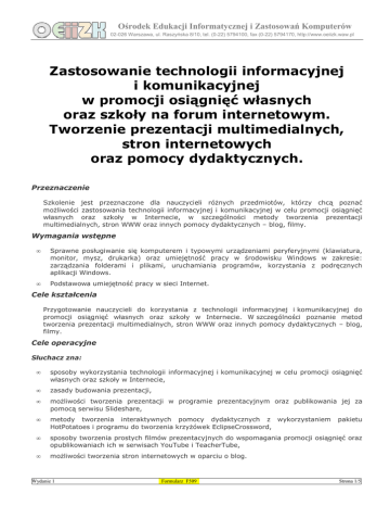 Ośrodek Edukacji Informatycznej i Zastosowań Komputerów 02-026 Warszawa, ul. Raszyńska 8/10, tel. (0-22) 5794100, fax (0-22) 5794170, http://www.oeiizk.waw.pl Zastosowanie technologii informacyjnej i komunikacyjnej w promocji osiągnięć własnych oraz szkoły na forum internetowym. Tworzenie prezentacji multimedialnych, stron internetowych oraz pomocy dydaktycznych. Przeznaczenie Szkolenie jest przeznaczone dla nauczycieli róŜnych przedmiotów, którzy chcą poznać moŜliwości zastosowania technologii informacyjnej i komunikacyjnej w celu promocji osiągnięć własnych oraz szkoły w Internecie, w szczególności metody tworzenia prezentacji multimedialnych, stron WWW oraz innych pomocy dydaktycznych – blog, filmy. Wymagania wstępne • Sprawne posługiwanie się komputerem i typowymi urządzeniami peryferyjnymi (klawiatura, monitor, mysz, drukarka) oraz umiejętność pracy w środowisku Windows w zakresie: zarządzania folderami i plikami, uruchamiania programów, korzystania z podręcznych aplikacji Windows. • Podstawowa umiejętność pracy w sieci Internet. Cele kształcenia Przygotowanie nauczycieli do korzystania z technologii informacyjnej i komunikacyjnej do promocji osiągnięć własnych oraz szkoły w Internecie. W szczególności poznanie metod tworzenia prezentacji multimedialnych, stron WWW oraz innych pomocy dydaktycznych – blog, filmy. Cele operacyjne Słuchacz zna: • sposoby wykorzystania technologii informacyjnej i komunikacyjnej w celu promocji osiągnięć własnych oraz szkoły w Internecie, • zasady budowania prezentacji, • moŜliwości tworzenia prezentacji w programie prezentacyjnym oraz publikowania jej za pomocą serwisu Slideshare, • metody tworzenia interaktywnych pomocy dydaktycznych z wykorzystaniem HotPotatoes i programu do tworzenia krzyŜówek EclipseCrossword, • sposoby tworzenia prostych filmów prezentacyjnych do wspomagania promocji osiągnięć oraz opublikowaniach ich w serwisach YouTube i TeacherTube, • moŜliwości tworzenia stron internetowych w oparciu o blog. Wydanie 1 Formularz F509 pakietu Strona 1/5 Ośrodek Edukacji Informatycznej i Zastosowań Komputerów 02-026 Warszawa, ul. Raszyńska 8/10, tel. (0-22) 5794100, fax (0-22) 5794170, http://www.oeiizk.waw.pl Słuchacz potrafi: • zastosować odpowiednią metodę technologii informacyjnej i komunikacyjnej do promocji osiągnięć własnych oraz szkoły w Internecie, • wskazać zalety i wady stosowania poszczególnych metod (prezentacje, blogi, strony internetowe, interaktywne pomoce dydaktyczne, filmy). Plan szkolenia • Liczba godzin teoretycznych szkolenia – 2. • Liczba godzin praktycznych szkolenia – 18. Opis treści 1. Sposoby wykorzystania technologii informacyjnej i komunikacyjnej do promocji osiągnięć własnych oraz szkoły w Internecie. Techniki prezentacji i promocji osiągnięć jakie moŜna zastosować wykorzystując sieć Internet, w szczególności prezentacje multimedialne, blogi, filmy. Wady i zalety poszczególnych technik. ZagroŜenia związane z publikowaniem treści w Internecie. Prawa autorskie w sieci Internet - moŜliwości wykorzystywania róŜnorodnych materiałów. 2. Zasady budowy poprawnej prezentacji. Ogólne zasady opracowywania prezentacji multimedialnych dla edukacji z uwzględnieniem ich kompozycji, czytelności i estetyki. Prezentacje jako pomoce wspomagające samodzielną naukę (interaktywne) oraz jako wsparcie dla wykładu (do przedstawiania z pomocą projektora). Przykładowe, wartościowe prezentacje omawiające róŜne zagadnienia i problemy związane z treściami nauczania i róŜnymi osiągnięciami. 3. Poznanie głównych narzędzi programu prezentacyjnego (gotowe szablony prezentacji, efekty przejść obiektów i slajdów, animacja niestandardowa, chronometraŜ). Zasady poprawnego formatowania prezentacji – praca z tekstem i grafiką. Wykorzystanie obrazów zapisanych na dysku, import obrazów dostępnych w sieci, korzystanie z galerii Clipartów dostępnej na stronach Microsoft. Zasady wykorzystania tekstów i grafiki z Internetu (prawa autorskie). Dodawanie elementów multimedialnych: animacji, dźwięku i sekwencji wideo. RóŜne sposoby zapisu – prezentacja, pokaz, strona internetowa, prezentacja przenośna. Samodzielne prowadzenie prezentacji. Publikowanie prezentacji za pomocą serwisu Slideshare lub AuthorSlide. 4. Metody projektowania i tworzenia interaktywnych pomocy dydaktycznych – testy jednokrotnego i wielokrotnego wyboru, krzyŜówki, ćwiczenia na dopasowanie, ćwiczenia z luką. Praca z programami HotPotatoes i EclipseCrossword. 5. Tworzenie filmów prezentacyjnych z pomocą Windows Movie Maker. Pozyskiwanie i edycja pojedynczych zdjęć oraz obróbka zdjęć. Organizacja materiałów. Łączenie zdjęć w sekwencje wideo, składanie filmu. Edycja materiału filmowego. Dodawanie efektów tekstowych, dźwiękowych, efektów animacyjnych na zdjęcia oraz efektów przejść. Zapis materiału w postaci pliku wideo. MoŜliwości wykorzystania filmów prezentacyjnych w edukacji w celu wzbogacenia zajęć i zaktywizowania uczniów. Publikowanie filmów w serwisach YouTube i TeacherTube. 6. Poznanie podstawowych metod tworzenia prostych stron WWW opartych na blogu. Przykładowe, wartościowe strony WWW i blogi dostępne w sieci Internet – ich analiza, porównanie i ocenianie. ZałoŜenie bloga i wykorzystanie go jako strony, jego konfiguracja, tworzenie internetowej galerii zdjęć, wykorzystanie funkcji Mobloga, serwisy współpracujące z Blogger. Wydanie 1 Formularz F509 Strona 2/5 Ośrodek Edukacji Informatycznej i Zastosowań Komputerów 02-026 Warszawa, ul. Raszyńska 8/10, tel. (0-22) 5794100, fax (0-22) 5794170, http://www.oeiizk.waw.pl Harmonogram szkolenia Lp. 1. 2. 3. 4. 5. 6. 7. 8. 9. Liczba godzin teoretycznych praktycznych Temat Sposoby wykorzystania technologii informacyjnej i komunikacyjnej do promocji osiągnięć własnych oraz szkoły w Internecie. Zasady poprawnej budowy 