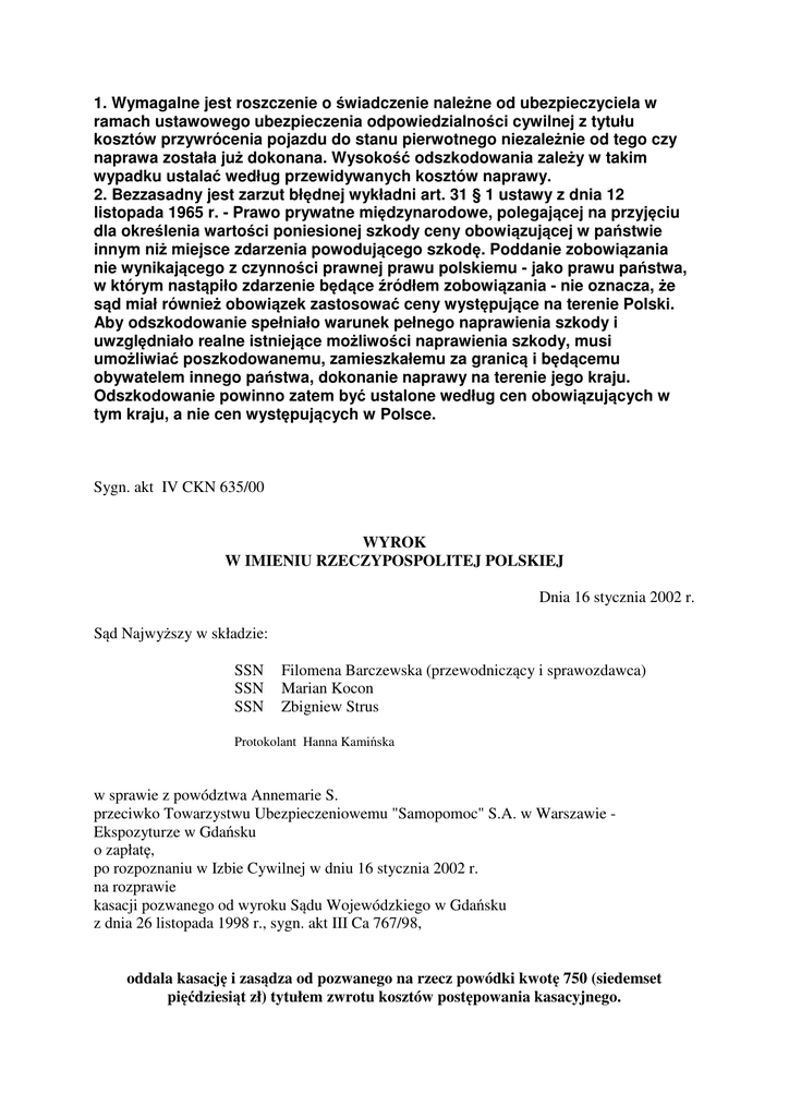 1. Wymagalne jest roszczenie o świadczenie należne od ubezpieczyciela w ramach ustawowego ubezpieczenia odpowiedzialności cywilnej z tytułu kosztów przywrócenia pojazdu do stanu pierwotnego niezależnie od tego czy naprawa została już dokonana. Wysokość odszkodowania zależy w takim wypadku ustalać według przewidywanych kosztów naprawy. 2. Bezzasadny jest zarzut błędnej wykładni art. 31 § 1 ustawy z dnia 12 listopada 1965 r. - Prawo prywatne międzynarodowe, polegającej na przyjęciu dla określenia wartości poniesionej szkody ceny obowiązującej w państwie innym niż miejsce zdarzenia powodującego szkodę. Poddanie zobowiązania nie wynikającego z czynności prawnej prawu polskiemu - jako prawu państwa, w którym nastąpiło zdarzenie będące źródłem zobowiązania - nie oznacza, że sąd miał również obowiązek zastosować ceny występujące na terenie Polski. Aby odszkodowanie spełniało warunek pełnego naprawienia szkody i uwzględniało realne istniejące możliwości naprawienia szkody, musi umożliwiać poszkodowanemu, zamieszkałemu za granicą i będącemu obywatelem innego państwa, dokonanie naprawy na terenie jego kraju. Odszkodowanie powinno zatem być ustalone według cen obowiązujących w tym kraju, a nie cen występujących w Polsce. Sygn. akt IV CKN 635/00 WYROK W IMIENIU RZECZYPOSPOLITEJ POLSKIEJ Dnia 16 stycznia 2002 r. Sąd Najwyższy w składzie: SSN SSN SSN Filomena Barczewska (przewodniczący i sprawozdawca) Marian Kocon Zbigniew Strus Protokolant Hanna Kamińska w sprawie z powództwa Annemarie S. przeciwko Towarzystwu Ubezpieczeniowemu "Samopomoc" S.A. w Warszawie Ekspozyturze w Gdańsku o zapłatę, po rozpoznaniu w Izbie Cywilnej w dniu 16 stycznia 2002 r. na rozprawie kasacji pozwanego od wyroku Sądu Wojewódzkiego w Gdańsku z dnia 26 listopada 1998 r., sygn. akt III Ca 767/98, oddala kasację i zasądza od pozwanego na rzecz powódki kwotę 750 (siedemset pięćdziesiąt zł) tytułem zwrotu kosztów postępowania kasacyjnego. Uzasadnienie Sąd Rejonowy w Gdańsku wyrokiem z dnia 28 maja 1998 r. zasądził od pozwanego na rzecz powódki kwotę 10.865,86 zł z ustawowymi odsetkami od dnia 11 listopada 1996 r., a w pozostałej części powództwo oddalił, opierając rozstrzygnięcie na następujących ustaleniach: Stanowiący własność powódki - obywatelki Niemiec - samochód marki Renault 19 został uszkodzony w dniu 5 października 1996 r. w Stargardzie Gdańskim, na skutek kolizji spowodowanej przez prowadzącego samochód marki Fiat 126 p ubezpieczony w pozwanym Towarzystwie od odpowiedzialności cywilnej. W wyniku zderzenia uległy uszkodzeniu i wymagają wymiany części pojazdu powódki wykazane w ekspertyzie technicznej sporządzonej na zlecenie powódki, a zweryfikowanej w opinii biegłego sądowego. Ogólny koszt niezbędnej naprawy wynosi 5.422,96 marek niemieckich, co stanowi na dzień wyrokowania kwotę 10.165,86 zł. Pozwany wypłacił powódce odszkodowanie w kwocie 2.456,89 zł. Sąd uznał, że uwzględniając zasadę pełnego odszkodowania, obiektywnym miernikiem wartości są ceny rynkowe części i usług koniecznych do naprawienia szkody i to na terenie Niemiec, to jest w miejscu zamieszkania powódki, gdyż takie koszty musi powódka ponieść aby przywrócić uszkodzony pojazd do stanu poprzedniego. Nadto Sąd ten ustalił, że powódka zgłosiła pozwanemu swe roszczenie w dniu 11 października 1996 r. dołączając dokumenty (w tym kosztorys) niezbędne do ustalenia wysokość odszkodowania. Powódce należą się więc odsetki od dnia 11 listopada 1996 r. stosownie do treści art. 817 k.c. Na skutek apelacji pozwanego Sąd Wojewódzki w Gdańsku wyrokiem z dnia 26 listopada 1998 r. zmienił zaskarżony wyrok o tyle, że zasądził od pozwanego na rzecz powódki kwotę 8.236,38 zł z ustawowymi odsetkami poczynając od dnia 11 listopada 1996 r., a w pozostałym zakresie apelację oddalił. Sąd ten podzielił w pełni stanowisko Sądu I instancji, że pozwany ponosi odpowiedzialność cywilną za szkodę wyrządzoną przez sprawcę kolizji drogowej. Wobec tego, że powódka jest cudzoziemką w sprawie ma zastosowanie art. 31 ust. 1 ustawy prawo prywatne międzynarodowe, zgodnie z którym do odpowiedzialności z czynu niedozwolonego, należy stosować prawo państwa, na którego terenie nastąpiło zdarzenie wywołujące szkodę. W tym wypadku zastosowanie ma prawo polskie, a więc przepisy kodeksu cywilnego o czynach niedozwolonych, przepisy ustawy o działalności ubezpieczeniowej, jak i przepisy wykonawcze do tej ustawy. Sąd ten podzielił też stanowisko Sądu I instancji, iż aby odszkodowanie spełniało warunek pełnego naprawienia szkody, powinno ono umożliwić poszkodowanemu naprawienie samochodu w kraju jego zamieszkania. Odszkodowanie powinno być zatem ustalone według cen w tym kraju, z tym że przeliczone następnie na pieniądz polski. Wartość szkody Sąd Wojewódzki ustalił na sumę 5.747,31 DM (w tym 327,33 DM koszty ekspertyzy), co po przeliczeniu na złotówki wg kursu z dnia ustalenia odszkodowania daje sumę 10.692,87 zł. Wobec tego że powódka otrzymała od strony pozwanej kwotę 2.496,49 zł do zapłaty pozostała kwota 8.236,38 zł. Sąd ten w pełni podzielił ustalenia Sądu I instancji, co do daty zawiadomienia pozwanego o szkodzie, jak i ocenę, że odsetki należą się od 11 listopada 1996 r. Pozwany w kasacji powołując się na podstawę z art. 3931 pkt 1 k.p.c. wnosił o zmianę wyroku i oddalenie powództwa, ewentualnie o jego uchylenie, jak i poprzedzającego go wyroku Sądu I instancji i przekazanie sprawy do ponownego rozpoznania. Rozpoznając kasację na podstawie przepisów obowiązujących przed wejściem w życie ustawy z dnia 24 maja 2000 r. o zmianie ustawy - kodeks postępowania cywilnego ... (Dz. U. Nr 48, poz. 554) Sąd Najwyższy zważył, co następuje: Oparcie kasacji na pierwszej z podstaw kasacyjnych wymienionych w art. 3931 ma ten skutek, ż