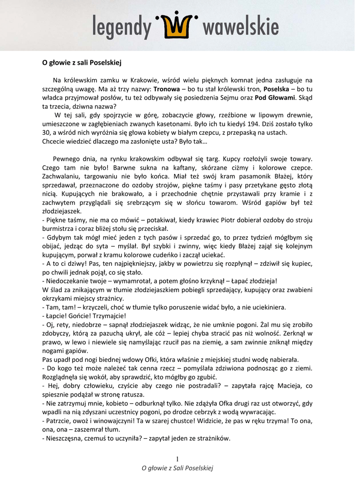 O głowie z sali Poselskiej Na królewskim zamku w Krakowie, wśród wielu pięknych komnat jedna zasługuje na szczególną uwagę. Ma aż trzy nazwy: Tronowa – bo tu stał królewski tron, Poselska – bo tu władca przyjmował posłów, tu też odbywały się posiedzenia Sejmu oraz Pod Głowami. Skąd ta trzecia, dziwna nazwa? W tej sali, gdy spojrzycie w górę, zobaczycie głowy, rzeźbione w lipowym drewnie, umieszczone w zagłębieniach zwanych kasetonami. Było ich tu kiedyś 194. Dziś zostało tylko 30, a wśród nich wyróżnia się głowa kobiety w białym czepcu, z przepaską na ustach. Chcecie wiedzieć dlaczego ma zasłonięte usta? Było tak… Pewnego dnia, na rynku krakowskim odbywał się targ. Kupcy rozłożyli swoje towary. Czego tam nie było! Barwne sukna na kaftany, skórzane ciżmy i kolorowe czepce. Zachwalaniu, targowaniu nie było końca. Miał też swój kram pasamonik Błażej, który sprzedawał, przeznaczone do ozdoby strojów, piękne taśmy i pasy przetykane gęsto złotą nicią. Kupujących nie brakowało, a i przechodnie chętnie przystawali przy kramie i z zachwytem przyglądali się srebrzącym się w słońcu towarom. Wśród gapiów był też złodziejaszek. ‐ Piękne taśmy, nie ma co mówić – potakiwał, kiedy krawiec Piotr dobierał ozdoby do stroju burmistrza i coraz bliżej stołu się przeciskał. ‐ Gdybym tak mógł mieć jeden z tych pasów i sprzedać go, to przez tydzień mógłbym się obijać, jedząc do syta – myślał. Był szybki i zwinny, więc kiedy Błażej zajął się kolejnym kupującym, porwał z kramu kolorowe cudeńko i zaczął uciekać. ‐ A to ci dziwy! Pas, ten najpiękniejszy, jakby w powietrzu się rozpłynął – zdziwił się kupiec, po chwili jednak pojął, co się stało. ‐ Niedoczekanie twoje – wymamrotał, a potem głośno krzyknął – Łapać złodzieja! W ślad za znikającym w tłumie złodziejaszkiem pobiegli sprzedający, kupujący oraz zwabieni okrzykami miejscy strażnicy. ‐ Tam, tam! – krzyczeli, choć w tłumie tylko poruszenie widać było, a nie uciekiniera. ‐ Łapcie! Gońcie! Trzymajcie! ‐ Oj, rety, niedobrze – sapnął złodziejaszek widząc, że nie umknie pogoni. Żal mu się zrobiło zdobyczy, którą za pazuchą ukrył, ale cóż – lepiej chyba stracić pas niż wolność. Zerknął w prawo, w lewo i niewiele się namyślając rzucił pas na ziemię, a sam zwinnie zniknął między nogami gapiów. Pas upadł pod nogi biednej wdowy Ofki, która właśnie z miejskiej studni wodę nabierała. ‐ Do kogo też może należeć tak cenna rzecz – pomyślała zdziwiona podnosząc go z ziemi. Rozglądnęła się wokół, aby sprawdzić, kto mógłby go zgubić. ‐ Hej, dobry człowieku, czyście aby czego nie postradali? – zapytała rajcę Macieja, co spiesznie podążał w stronę ratusza. ‐ Nie zatrzymuj mnie, kobieto – odburknął tylko. Nie zdążyła Ofka drugi raz ust otworzyć, gdy wpadli na nią zdyszani uczestnicy pogoni, po drodze cebrzyk z wodą wywracając. ‐ Patrzcie, owoż i winowajczyni! Ta w szarej chustce! Widzicie, że pas w ręku trzyma! To ona, ona, ona – zaszemrał tłum. ‐ Nieszczęsna, czemuś to uczyniła? – zapytał jeden ze strażników. 1 O głowie z Sali Poselskiej ‐ Ja nie…, to nie ja..., ja tylko... – próbowała się tłumaczyć zaskoczona kobieta, ale głos wiązł jej w gardle, gdy patrzyła na wzburzonych mieszczan. Nie czuła nawet, że woda z przewróconego cebrzyka całkiem jej ciżmy przemoczyła. Postanowiono zaprowadzić ją, na wawelski zamek, przed oblicze samego króla Zygmunta Augusta, który był władcą sprawiedliwym i słynął z mądrych rządów. Kiedy uczestnicy zajścia wspięli się na wzgórze, sprawę wpierw kasztelanowi Mikołajowi przedstawili. Ten, nie zwlekając, do monarchy się udał i o audiencję poprosił. ‐ Najjaśniejszy Panie, racz w swej mądrości sprawę pasamonika Błażeja i wdowy Ofki rozsądzić – poprosił. ‐ Skoro o to prosisz, uczynię tak – odparł król. Na rozkaz marszałka wszyscy zgromadzili się w sali Pod Głowami, bo tam właśnie miał się odbyć sąd. Gdy zajęli miejsca, przybył Zygmunt August, zasiadł na tronie i zapytał: ‐ Powiedzcie dobrzy ludzie, co się stało? ‐ Najjaśniejszy Panie – rzekł na to pasamonik Błażej – z mojego kramu ktoś zabrał pas przepięknej roboty, a że za niego nie zapłacił, przeto jasnym jest, iż go skradł. ‐ Słusznie mówisz, Błażeju – rzekł król – to kradzież. Czy wiesz kto to uczynił? ‐ Mniemam, iż to ta kobieta ‐ rzekł pasamonik, wskazując na Ofkę. ‐ Słusznie mówi – odezwały się liczne głosy – Sami widzieliśmy, że pas w ręku miała! ‐ Czy rzeczywiście miałaś pas w ręku? – zwrócił się monarcha do przerażonej kobiety. ‐ Miałam – odpowiedziała cicho. ‐ Czy zapłaciłaś za niego? – zapytał król. ‐ Nie, Najjaśniejszy Panie – odpowiedziała i dodała szybko – ja go znalazłam, podniosłam z ziemi. ‐ Czy ktoś z was widział, że kobieta ta pas z ziemi podnosi? – zapytał król zgromadzonych. ‐ Nie, nikt z nas tego nie widział – odezwały się głosy. Zasmucił się król, że Ofka, zamiast zmiłowania prosić, kolejne kłamstwo do niej dokłada, a że o jej winie był przekonany, skazał ją na więzienie. Kiedy przebrzmiały słowa wyroku, zrozpaczona kobieta ośmieliła się powiedzieć: ‐ Jeśli nikt nie chce stanąć w mojej obronie, niech przemówią za mną chociaż te drewniane głowy! Po tych słowach w komnacie zaległa taka cisza, że słychać było przelatującą koło okna zagubioną muchę. Wszyscy zamarli z przerażenia, bo nikt nie odważyłby się odzywać w obecności władcy. Nagle spod stropu dał się słyszeć głos: ‐ Królu Auguście, sądź sprawiedliwie. Zebrani spojrzeli w górę i ze zdziwieniem zobaczyli, że wyrzeźbiona z drewna głowa kobiety w białym czepcu rusza ustami. Zdziwił się Błażej, zdz