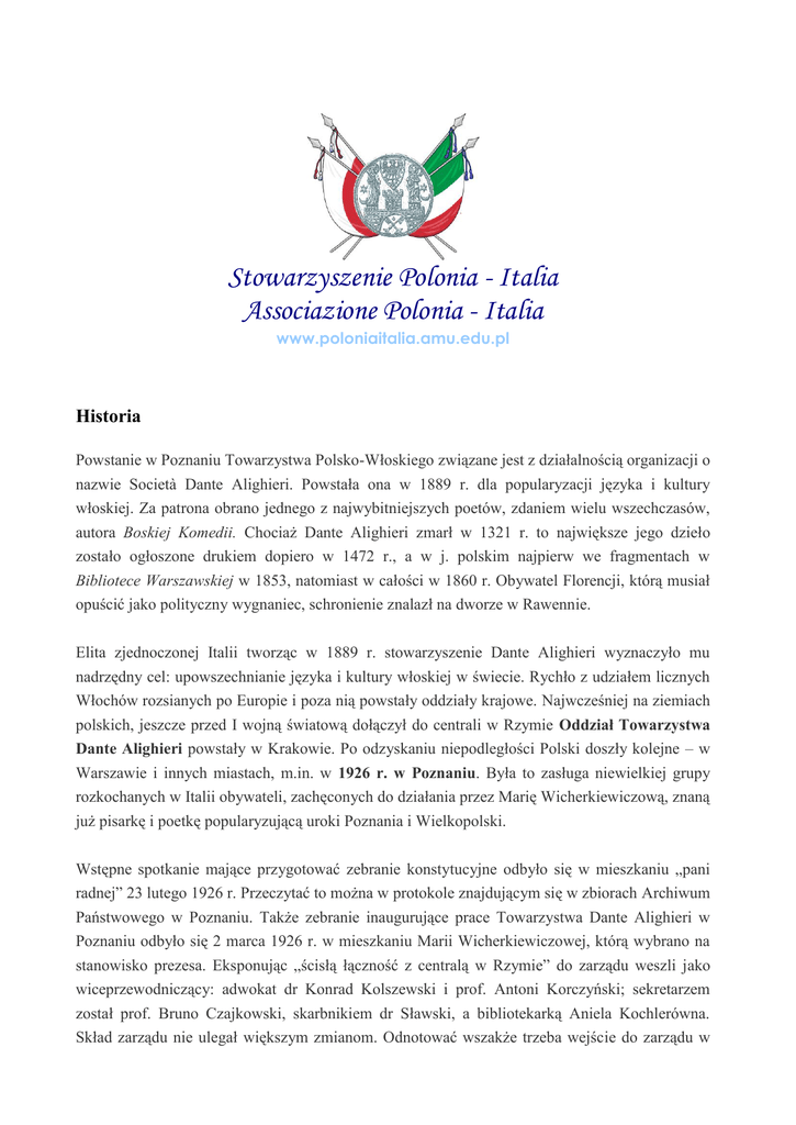 Stowarzyszenie Polonia - Italia Associazione Polonia - Italia www.poloniaitalia.amu.edu.pl Historia Powstanie w Poznaniu Towarzystwa Polsko-Włoskiego związane jest z działalnością organizacji o nazwie Società Dante Alighieri. Powstała ona w 1889 r. dla popularyzacji języka i kultury włoskiej. Za patrona obrano jednego z najwybitniejszych poetów, zdaniem wielu wszechczasów, autora Boskiej Komedii. Chociaż Dante Alighieri zmarł w 1321 r. to największe jego dzieło zostało ogłoszone drukiem dopiero w 1472 r., a w j. polskim najpierw we fragmentach w Bibliotece Warszawskiej w 1853, natomiast w całości w 1860 r. Obywatel Florencji, którą musiał opuścić jako polityczny wygnaniec, schronienie znalazł na dworze w Rawennie. Elita zjednoczonej Italii tworząc w 1889 r. stowarzyszenie Dante Alighieri wyznaczyło mu nadrzędny cel: upowszechnianie języka i kultury włoskiej w świecie. Rychło z udziałem licznych Włochów rozsianych po Europie i poza nią powstały oddziały krajowe. Najwcześniej na ziemiach polskich, jeszcze przed I wojną światową dołączył do centrali w Rzymie Oddział Towarzystwa Dante Alighieri powstały w Krakowie. Po odzyskaniu niepodległości Polski doszły kolejne – w Warszawie i innych miastach, m.in. w 1926 r. w Poznaniu. Była to zasługa niewielkiej grupy rozkochanych w Italii obywateli, zachęconych do działania przez Marię Wicherkiewiczową, znaną już pisarkę i poetkę popularyzującą uroki Poznania i Wielkopolski. Wstępne spotkanie mające przygotować zebranie konstytucyjne odbyło się w mieszkaniu „pani radnej” 23 lutego 1926 r. Przeczytać to można w protokole znajdującym się w zbiorach Archiwum Państwowego w Poznaniu. Także zebranie inaugurujące prace Towarzystwa Dante Alighieri w Poznaniu odbyło się 2 marca 1926 r. w mieszkaniu Marii Wicherkiewiczowej, którą wybrano na stanowisko prezesa. Eksponując „ścisłą łączność z centralą w Rzymie” do zarządu weszli jako wiceprzewodniczący: adwokat dr Konrad Kolszewski i prof. Antoni Korczyński; sekretarzem został prof. Bruno Czajkowski, skarbnikiem dr Sławski, a bibliotekarką Aniela Kochlerówna. Skład zarządu nie ulegał większym zmianom. Odnotować wszakże trzeba wejście do zarządu w 1927 r. prof. Romana Pollaka, bodaj najwybitniejszego przedstawiciela italianistów polskich w środowisku akademickim okresu międzywojennego (zob. T. Witczak, Roman Pollak (31 lipca 1886 – 23 lutego 1972). “Pamiętnik Literacki” 1972, z.3), hr. Zofię Żółtowską oraz w latach 30. dra Antonio Stefaniniego, który wykładał na Uniwersytecie historię literatury włoskiej i prowadził lektorat. Widoczny pospiech w organizacji Towarzystwa w Poznaniu wiązać można z trwającymi właśnie przygotowaniami do kongresu światowego Towarzystwa w Rzymie w czerwcu 1926 r. Delegatem oddziału warszawskiego został Maciej Loret, zasiedziały w Rzymie radca poselstwa polskiego, mający niezaspokojone ambicje dyplomatyczne. Drugim delegatem na Kongres rzymski została prezeska świeżo utworzonego oddziału poznańskiego – środowiska o stosunkowo licznych admiratorach faszyzmu we Włoszech. Wśród nich był Roman Dmowski, który także w rozmowach prywatnych przyznawał się do wiary w faszyzm. Do hr. Janiny z Puttkamerów Żółtowskiej 16marca 1925 r. mówił że „w jego mniemaniu ludzie rządzący obecnie Europą są przejściowi i podobnie przejściowymi są ustroje, które oby zmierzały w kierunku systemu Mussoliniego” (Janina z Puttkamerów Żółtowska, Dziennik. Fragmenty wielkopolskie 1919-1933. Wybór, opracowanie i wstęp Barbara Wysocka. Poznań 2003, s.217). Pobyt w Rzymie wykorzystała Maria Wicherkiewiczowa na spotkanie z Mussolinim. Było to dla niej wielkie przeżycie, z którym się nie kryła. W ostatnim artykule z tomiku Trypolis czytamy: „w czerwcu roku przeszłego miałam szczęście rozmawiać z Mussolinim na audiencji prywatnej. […] Przeszłam liczne wspaniałe apartamenta, sale pełne czekających i służby zanim się otworzyły podwoje pracowni Mussoliniego. Sala ogromna, ozdobiona dziełami sztuki. Wódz faszystów stał za biurkiem. Poprzez onieśmielenie i emocje tej niezapomnianej chwili zobaczyłam postać człowieka niezwykłego, o ruchach wytwornych, stylowych i żywych”. (M. Wicherkiewiczowa, Tripolis: wrażenia z podróży do Afryki i Włoch, Poznań 1927). Dwa lata później ukazała się równie ekscytująca treścią książka poświęcona Italii Mussoliniego, w której wiersz pisany w maju 1928 r. zawierał takie strofy: „W Palazzo Chigi faszyści czarni, Wpatrzeni w wodza oblicze spiżowe Czekają hasła, spokojni karni Do zwycięstw legie gotowe” (M. Wicherkiewiczowa, Pod urokiem Italii, Poznań 1929). Zawsze elitarne poznańskie koło Dante Alighieri, liczące średnio około 40 członków, jakkolwiek znajdowało się pod urokiem dokonań faszyzmu (co zresztą było zjawiskiem w ówczesnej Europie dość rozpowszechnionym) w znakomitej większości znacznie szerzej spoglądało na swoje włoskie sympatie. Syntezą tych stanów ducha były wyjazdy do Włoch, zwykle kilkunastodniowe. Jednak z powodu wysokich kosztów zwykle łączyły one członków, kilku nieraz wszystkich oddziałów (Warszawa, Kraków, Łódź, Wilno, Lwów). Najbardziej popularną formą działalności Towarzystwa w Poznaniu były cykliczne spotkania z prelekcjami osób w sposób szczególny znających Italię, jej literaturę, sztukę sakralną i świecką, takąż architekturę i wielką historię od antyku poczynając. Znaczący udział w popularyzacji Włoch w latach 30. mieli pracownicy ambasady włoskiej, zwłaszcza, od kiedy w 1932 r. ambasadorem został Giuseppe Bastianini, polityk traktujący placówkę w Warszawie jako trampolinę do dalszej kariery. Oddziały Towarzystwa zostały w sposób wyraźny, chociaż półoficjalny włączone w rydwan rozwijającej się polityki włoskiej ekspansji. Dotychczasową nazwę starano si