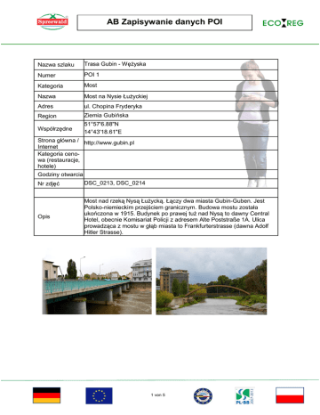 AB Zapisywanie danych POI Nazwa szlaku Trasa Gubin - Wężyska Numer POI 1 Kategoria Most Nazwa Most na Nysie Łużyckiej Adres ul. Chopina Fryderyka Region Ziemia Gubińska Współrzędne 51°57'6.88"N 14°43'18.61"E Strona główna / http://www.gubin.pl Internet Kategoria cenowa (restauracje, hotele) Godziny otwarcia Nr zdjęć DSC_0213, DSC_0214 Opis Most nad rzeką Nysą Łużycką. Łączy dwa miasta Gubin-Guben. Jest Polsko-niemieckim przejściem granicznym. Budowa mostu została ukończona w 1915. Budynek po prawej tuż nad Nysą to dawny Central Hotel, obecnie Komisariat Policji z adresem Alte Poststraße 1A. Ulica prowadząca z mostu w głąb miasta to Frankfurterstrasse (dawna Adolf Hitler Strasse). 1 von 5 AB Zapisywanie danych POI Nazwa szlaku Trasa Gubin - Wężyska Numer POI 2 Kategoria kościół Nazwa Ruiny Kościoła Farnego Adres ul. Ratuszowa Region Ziemia Gubińska Współrzędne 51°57'6.68"N 14°43'29.58"E Strona główna / http://www.gubin.pl Internet Kategoria cenowa (restauracje, hotele) Godziny otwarcia Nr zdjęć dsc_0221, dsc_0220, dsc_0222 Pierwsze wzmianki o kościele pochodzą z 1324 roku. Budowlę wznie- Opis siono w stylu romańskim, w formie trójnawowej bazyliki. Po zniszczeniach wywołanych czternastowiecznymi trzęsieniami ziemi, budowlę rozebrano, zaś na jej miejscu rozpoczęto wznoszenie nowego gotyckiego kościoła. Prace trwały bardzo długo, a ostatecznego kształtu budowla nabrała w 1844 roku. Podczas II wojny światowej kościół uległ prawie całkowitemu zniszczeniu. Wielu badaczy twierdzi, że w podziemiach zabytkowego kościoła znajdowały się skarby. Miałyby one mieścić się w kryptach. Po ich odkopaniu okazało się, że tuż po wojnie zostały one brutalnie splądrowane. Z historią kościoła wiążą się 3 legendy. 1. W miejscu, gdzie stoi dziś kościół farny, znajdował się staw. Ze stawu wyłaniał się biały jeleń. Miejscowa ludność uznała więc, że jest to miejsce święte i wybudowała świątynię. 2. W czasie oblężenia miasta przez husytów jedna z zakonnic uciekła na dach kościoła zabierając ze sobą kozę i wiązkę siana. Karmiąc się kozim mlekiem, zakonnica pozostała w ukryciu aż do czasu opuszczenia miasta przez husytów i tym sposobem ocalała. Na pamiątkę tego zdarzenia u stóp wieżyczki narożnej wmurowano figurki zakonnicy i kozy. 3. Na zachodniej stronie wieży widnieją trzy krzyże. Upamiętniają one śmierć robotników, którzy ponieśli śmierć w czasie budowy świątyni 2 von 5 AB Zapisywanie danych POI Nazwa szlaku Trasa Gubin - Wężyska Numer POI 3 Kategoria Wieże, baszty Nazwa Baszta Ostrowska Adres ul.3 Maja Region Ziemia Gubińska Współrzędne 51°57'0.08"N 14°43'38.02"E Strona główna / http://www.gubin.pl Internet Kategoria cenowa (restauracje, hotele) Godziny otwarcia Nr zdjęć DSC_0227, Opis Baszta Ostrowska jest jedną z budowli nie istniejącej już Bramy Ostrowskiej. Wybudowana została ok. 1530 roku- ze względu na brak dokumentów nie można dokładnie określić jej wieku. Wznosi się na ponad siedem pięter, do fryzu na wysokość 23 metrów. Od tego miejsca do szczytu jest jeszcze 5,5 metra. Średnica wewnątrz to około 3,7 metra , ma 24,8 m w obwodzie. 3 von 5 AB Zapisywanie danych POI Nazwa szlaku Trasa Gubin - Wężyska Numer POI 4 Kategoria Sklep Nazwa Sklep w Wałowicach Adres Wałowice Region Ziemia Gubińska Współrzędne 51°59'11.93"N 14°47'58.24"E Strona główna / Internet Kategoria cenowa (restauracje, hotele) Godziny otwarcia Nr zdjęć DSC_0391, DSC_0393, DSC_0393 Opis Sklep spożywczy w Wałowicach oferuje dobrej jakości produkty w przystępnych cenach. Jest jedynym sklepie na trasie Gubin-Wężyska. Można tam wysłać kartkę. Obok znajduje się siedziba sołtysa. 4 von 5 AB Zapisywanie danych POI Nazwa szlaku Trasa Gubin - Wężyska Numer POI 5 Kategoria Kościół Nazwa Kościół w Wężyskach Adres Wężyska Region Ziemia Gubińska Współrzędne 52° 0'57.77"N 14°57'3.10"E Strona główna / Internet Kategoria cenowa (restauracje, hotele) Godziny otwarcia Nr zdjęć DSC_0302, DSC_0330, DSC_0330 Opis Kościół Filialny p.w. Matki Bożej Szkaplerznej. Budynek ten należy do przedstawicieli architektury neogotyckiej. Zbudowany został 1878 r., ceglany, jednonawowy, zamknięty od wschodu pięciobocznie. 5 von 5