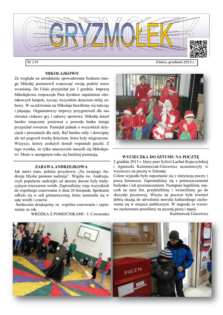 Nr 119 MIKOŁAJKOWO Ze względu na utrudnienia spowodowane brakiem śniegu Mikołaj postanowił rozpocząć swoją podróż nieco wcześniej. Do Uśnic przyjechał już 3 grudnia. Imprezę Mikołajkowa rozpoczęła Pani dyrektor zapaleniem choinkowych lampek, życząc wszystkim dzieciom miłej zabawy. W oczekiwaniu na Mikołaja bawiliśmy się tańcząc i pląsając. Organizatorzy imprezy przygotowali dla nas również ciekawe gry i zabawy sportowe. Mikołaj dotarł bardzo zmęczony ponieważ z powodu braku śniegu przyjechał rowerem. Pamiętał jednak o wszystkich dzieciach i prezentach dla nich. Był bardzo miły i dowcipny ale też pogroził trochę dzieciom, które były niegrzeczne. Wszyscy, którzy zasłużyli dostali wspaniałe paczki. Z tego wynika, że tylko nauczyciele narazili się Mikołajowi. Może w następnym roku się bardziej postarają. ZABAWA ANDRZEJKOWA Jak mówi stare, polskie przysłowie „Na świętego Andrzeja błyska pannom nadzieja”. Wigilia św. Andrzeja, czyli popularne andrzejki od dawien dawna były tradycyjnym wieczorem wróżb. Zaprosiliśmy więc wszystkich do wspólnego czarowania w dniu 26 listopada. Spotkanie odbyło się w sali gimnastycznej, która zamieniła się w salę wróżb i czarów. Serdecznie dziękujemy za wspólne czarowanie i zapraszamy za rok. WRÓŻKA Z POMOCNIKAMI - I. Czwerenko Uśnice, grudzień 2013 r. WYCIECZKA DO SZTUMU NA POCZTĘ 2 grudnia 2013 r. klasy pani Sylwii Łachut-Kopczyńskiej i Agnieszki Kaźmierczak-Giecewicz uczestniczyły w wycieczce na pocztę w Sztumie. Celem wyjazdu było zapoznanie się z instytucją poczty i pracą listonosza. Zapoznaliśmy się z pomieszczeniami budynku i ich przeznaczeniem. Następnie kupiliśmy znaczek na nasz list, przykleiliśmy i wrzuciliśmy go do skrzynki pocztowej. Wizyta na poczcie była również dobrą okazją do utrwalenia nawyku kulturalnego zachowania się w miejscu publicznym. W nagrodę za wzorowe zachowanie poszliśmy na pyszną pizzę i napój. Kaźmierczk Giecewicz PASOWANIE 5 grudnia był dniem szczególnie uroczystym dla naszych najmłodszych. W obecności gości : pani dyrektor, wicedyrektor, pani psycholog oraz rodziców wychowankowie pani Alicji Kapszewicz po roku pobytu w przedszkolu, zdobywaniu nowych doświadczeń, wiedzy i umiejętności zostali pasowani na przedszkolaków. DO WIDZENIA ! Z końcem grudnia rozstajemy się z panią Elżbietą Zwierzyńską, która zdecydowała się odejść na emeryturę. Pani Ela pracowała u nas od 2001 r. Pani Elu dziękujemy za wszystko. Za nieustający uśmiech na twarzy, za tabletki podane na czas, za towarzyszenie podczas wizyt u różnych specjalistów, za trzymanie za rękę u dentysty, za kontrolowanie naszych babskich spraw. Za to, że nie pozwalała nam pani utyć, za marsze po lasach. Dziękujemy za Dni Zdrowia, za zaufanie, za głowę przepełnioną naszymi sekretami. Dziękujemy za cierpliwość, ciepło. Za to, że miała pani dla nas radę lub lekarstwo zawsze kiedy nam było smutno lub kiedy byliśmy wściekli albo nieznośni. Będziemy tęsknić i wspominać. Do widzenia pani Elu. Życzymy odpoczynku. Wszystkiego dobrego. Jeśli Pani zatęskni - zapraszamy, choćby na kijki. Wdzięczne za wszystko. Dzieciaki. Redakcja : S.Lipińska, M. Kowalski KIERMASZ Tradycyjny kiermasz ozdób świątecznych i noworocznych odbył się w 5 grudnia, w sali konferencyjnej Starostwa Powiatowego w Sztumie. Podczas kiermaszu można było nabyć ozdoby, stroiki świąteczne, kartki noworoczne oraz wszelkie inne przedmioty związane ze zbliżającymi się świętami Bożego Narodzenia. Nasz ośrodek jak co roku przygotował stoisko z wyrobami wykonanymi na zajęciach techniki i plastyki. Dochód z kiermaszu przeznaczono na materiały do zajęć plastycznych. Tym razem nasze stoisko cieszyło się jeszcze większym powodzeniem z powodu przygotowanej przez nas loterii fantowej. W kiermaszu uczestniczyli M. Kowalski, S. Lipińska, M. Strąk, D. Chochel, P. Dąbrowski pod opieką p. A. Giecewicz i p. P. Seca. JEST TAKI DZIEŃ…. Wigilia Świąt Bożego Narodzenia to najbardziej rodzinny dzień w roku. 17 grudnia cała Uśnicka Rodzina spotkała się na urodzinach Jezusa zorganizowanych przez Uśnickie Anioły i grupę przedszkolną. Uroczystość miała charakter radosny, jak to bywa na urodzinach. Najmilsze akcenty Wigilii to wspólne kolędowanie, dzielenie się opłatkiem oraz pyszne potrawy wigilijne, wspaniały tort i życzenia płynące prosto z serca. XII 2013 Opiekunowie: E. Zdziebłowska, W. Wnuk