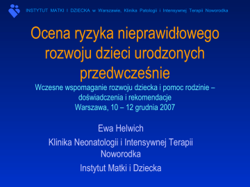 INSTYTUT MATKI I DZIECKA w Warszawie, Klinika Patologii i Intensywnej Terapii Noworodka Ocena ryzyka nieprawidłowego rozwoju dzieci urodzonych przedwcześnie Wczesne wspomaganie rozwoju dziecka i pomoc rodzinie – doświadczenia i rekomendacje Warszawa, 10 – 12 grudnia 2007 Ewa Helwich Klinika Neonatologii i Intensywnej Terapii Noworodka Instytut Matki i Dziecka INSTYTUT MATKI I DZIECKA w Warszawie, Klinika Patologii i Intensywnej Terapii Noworodka Główne czynniki ryzyka zaburzeń rozwoju neurologicznego • • • • • Poród przedwczesny Chorioamnionitis OENN Posocznica Zaawansowane zmiany widoczne w obrazie USG mózgu INSTYTUT MATKI I DZIECKA w Warszawie, Klinika Patologii i Intensywnej Terapii Noworodka Noworodki z małą urodzeniową masą ciała w latach 1989 – 2006 (GUS) 500-2500g 9 8 7 6 5 8,4 8,4 8,1 7,2 6,4 6,2 6 6,2 6,3 6,2 6,4 6,3 6,3 4 3 2 1 0 1989 1990 1992 1994 1996 1998 2000 2001 2002 2003 2004 2005 2006 INSTYTUT MATKI I DZIECKA w Warszawie, Klinika Patologii i Intensywnej Terapii Noworodka Sytuacja zdrowotna kobiet ciężarnych jest zróżnicowana • • • • różnice w sytuacji materialnej i życiowej odmienne zachowania zdrowotne odmienna świadomość zdrowotna zróżnicowana dostępność usług zdrowotnych INSTYTUT MATKI I DZIECKA w Warszawie, Klinika Patologii i Intensywnej Terapii Noworodka Wskaźniki ilustrujące świadomość zdrowotną i zachowania zdrowotne • częstość przyjmowania kwasu foliowego przez kobiety 15 - 49 lat - 13% (2001r) • odsetek kobiet ciężarnych rozpoczynających opiekę w czasie ciąży w I trymestrze - 50 - 60% (2001r) • odsetek kobiet palących papierosy – ok. 20% w I trymestrze ciąży – ok. 10% w III trymestrze ciąży INSTYTUT MATKI I DZIECKA w Warszawie, Klinika Patologii i Intensywnej Terapii Noworodka Profilaktyka pierwotna wad wrodzonych suplementacja kwasem foliowym diety w populacji kobiet w wieku rozrodczym • redukcja częstości wad cewy nerwowej o 75% • redukcja wad układu krążenia o 30% INSTYTUT MATKI I DZIECKA w Warszawie, Klinika Patologii i Intensywnej Terapii Noworodka Noworodki z bardzo małą (VLBW) i ekstremalnie małą (ELBW) masą ciała • Porody przed 33 t.c. stanowią 1-2% wszystkich porodów, ale są odpowiedzialne za: – 80% umieralności noworodkowej – 40-50% umieralności niemowlęcej Kramer M i wsp. JAMA 2000; 284:843-49 • Wzrost przeżywalności skrajnie niedojrzałych noworodków (<28 t.c.) w wyniku: – poprawy opieki perinatalnej – prenatalnej podaży steroidów – zastosowania surfaktantu egzogennego INSTYTUT MATKI I DZIECKA w Warszawie, Klinika Patologii i Intensywnej Terapii Noworodka Aktualne trendy • Podejmowanie leczenia dzieci o coraz krótszym wieku płodowym • Znaczne ryzyko ciężkich uszkodzeń w populacji najmniej dojrzałych noworodków INSTYTUT MATKI I DZIECKA w Warszawie, Klinika Patologii i Intensywnej Terapii Noworodka Sytuacja w Polsce • Szybki spadek tzw. płodności demograficznej (z 2 do 1,4 dziecka na kobietę w okresie rozrodczym) • Poprawa wskaźnika umieralności okołoporodowej – 20/1000 w 1990 roku – 8,2/1000 w 2006 roku • Nieznacznie zmieniająca się częstość porodów przedwczesnych – 6,7 w 1995 roku – 6,4 w 2004 roku – 6,3 w 2006 roku • Odsetek noworodków z bardzo małą masą ciała (<1500g) stanowi ok. 1%, w tym z ekstremalnie małą masą ciała (500-999g) ok.0,4% (2004r.) INSTYTUT MATKI I DZIECKA w Warszawie, Klinika Patologii i Intensywnej Terapii Noworodka Ocena rozwoju noworodków bardzo niedojrzałych (<33 t.c.) • częstość mózgowego porażenia dziecięcego nie wzrasta, ale 50% dzieci z tą chorobą stanowią byłe wcześniaki urodzone przed 33 t.c. Hagberg B i wsp. Acta Pediatr 1996; 85:954-60 • inne najczęstsze powikłania to: zaburzenia widzenia, słuchu, dysharmonia rozwojowa (DCD-developmental coordination INSTYTUT MATKI I DZIECKA w Warszawie, Klinika Patologii i Intensywnej Terapii Noworodka Co zagraża noworodkowi urodzonemu przedwcześnie? • • • • Problemy oddechowe Niewydolność krążenia Powikłania mózgowe Powikłania infekcyjne INSTYTUT MATKI I DZIECKA w Warszawie, Klinika Patologii i Intensywnej Terapii Noworodka INSTYTUT MATKI I DZIECKA w Warszawie, Klinika Patologii i Intensywnej Terapii Noworodka INSTYTUT MATKI I DZIECKA w Warszawie, Klinika Patologii i Intensywnej Terapii Noworodka xxxxxxxxxxxxxxxx INSTYTUT MATKI I DZIECKA w Warszawie, Klinika Patologii i Intensywnej Terapii Noworodka INSTYTUT MATKI I DZIECKA w Warszawie, Klinika Patologii i Intensywnej Terapii Noworodka INSTYTUT MATKI I DZIECKA w Warszawie, Klinika Patologii i Intensywnej Terapii Noworodka Badanie neurologiczne wg.Denver - ocena całościowa (PREMATURITAS) 1. Dzieci z rozwojem patologicznym: mpdz głuchota wymagająca aparatu słuchowego ślepota 2. Dzieci z rozwojem wątpliwym opóźnienie rozwoju mniejsze niż 3 miesiące objawy łagodne, przejściowe 3. Dzieci z rozwojem prawidłowym wzorzec ruchowy zgodny z wiekiem kalendarzowym INSTYTUT MATKI I DZIECKA w Warszawie, Klinika Patologii i Intensywnej Terapii Noworodka Długofalowa ocena rozwoju noworodków bardzo i skrajnie niedojrzałych: badania europejskie Badanie EPICURE (N Engl J Med. 2005; 352: 9-19 N Engl J Med. 2000; 343: 378-84) • • • • • prospektywne badanie kohortowe z grupą kontrolną wszystkie (276) oddziałów położniczych i noworodkowych na terenie Anglii i Irlandii (żywe i martwe urodzenia) badanie dotyczy noworodków skrajnie niedojrzałych (<26 t.c.) urodzonych w okresie marzec-grudzień 1995 rok (811 noworodków) długofalowa ocena rozwoju: 2 lata - 283 (92%) 6 lat -241 (78%) dzieci, które przeżyły grupa kontrolna (dzieci z tej samej klasy): 160 (78%) dzieci zgłosiło się na badanie w wieku 5 lat INSTYTUT MATKI I DZIECKA w Warszawie, Klinika Patologii i Intensywnej Terapii Noworodka Długofalowa ocena rozwoju noworodków bardzo i skrajnie niedojrzałych: badania europejskie (cd) Badanie EPIPAGE (Arch Dis 