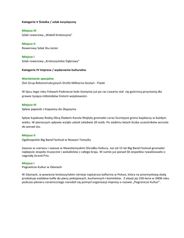 Kategoria V Ścieżka / szlak turystyczny Miejsce III Szlak rowerowy „Wokół Krotoszyna” Miejsce II Rowerowy Szlak Stu Jezior Miejsce I Szlak rowerowy „Krotoszyńskie Dąbrowy” Kategoria IV Impreza / wydarzenie kulturalne Wyróżnienie specjalne Zlot Grup Rekonstrukcyjnych Strefa Militarna Gostyń - Piaski W lipcu tego roku Folwark Podrzecze koło Gostynia już po raz czwarty stał się gościnną przystanią dla prawie tysiąca miłośników historii wojskowości. Miejsce III Spływ papieski z Kopanicy do Zbąszynia Spływ kajakowy Rzeką Obrą Śladami Karola Wojtyły gromadzi coraz liczniejsze grono kajakarzy w każdym wieku. W pierwszym spływie wzięło udział zaledwie 20 osób. Po siedmiu latach liczba uczestników wzrosła do ponad stu. Miejsce II Ogólnopolski Big Band Festival w Nowym Tomyślu Zawsze w czerwcu i zawsze w Nowotomyskim Ośrodku Kultury. Już od 15 lat Big Band Festival gromadzi najlepsze zespoły muzyczne i wokalistów z całego kraju. W sumie już ponad 50 zespołów rywalizowało o nagrodę Grand Prix. Miejsce I Pogranicze Kultur w Zdunach W Zdunach, w powiecie krotoszyńskim istnieje najstarsza kaflarnia w Polsce, która na przemysłową skalę produkuje ozdobne kafle do piecy pokojowych, kuchennych i kominków. Z okazji jej 150-lecia w 2008 roku podczas pleneru ceramicznego narodził się pomysł organizacji imprezy o nazwie „Pogranicze Kultur”. Kategoria III Baza kulinarno – noclegowa Wyróżnienie specjalne OLANDIA – Centrum Konferencyjne i Skansen Olenderski Centrum Konferencyjne OLANDIA mieści się w Prusimiu w Gminie Kwilcz, 70 km od Poznania. Nowoczesny kompleks powstał na bazie zabytkowego, osiemnastowiecznego folwarku. Przy pracach rekonstrukcyjnych zadbano o zachowanie dawnego charakteru obiektu. Miejsce III Dworek „Koper” w Grabównie koło Piły W zabytkowym, osiemnastowiecznym Dworku „Koper” niedaleko Piły, w oryginalnych, a jednocześnie wygodnych wnętrzach można odnaleźć chwilę wytchnienia. Do dyspozycji gości są dwie sale restauracyjne, kawiarnia oraz tonąca w zieleni weranda. Miejsce II Pokoje Gościnne „Pod Dębami” w Promienku Niewielki obiekt w Gminie Pobiedziska oddaje do dyspozycji gości dwa pokoje dwuosobowe z aneksem kuchennym. Do jego atutów należy lokalizacja przy jeziorze, w zacisznej okolicy Parku Krajobrazowego Promno. Miejsce I Ośrodek „Kama” Ośrodek Szkoleniowo Wypoczynkowy położony jest w okolicy jezior Jaroszewskiego i Lutomskiego na terenie Sierakowskiego Parku Krajobrazowego. Oferuje blisko 140 miejsc noclegowych. Kategoria II Atrakcja turystyczna Miejsce III Sierakowski Park Krajobrazowy Sierakowski Park Krajobrazowy został utworzony przed 20 laty w celu ochrony polodowcowego krajobrazu Pojezierza Międzychodzko-Sierakowskiego. Płynąca przez Park rzeka Warta dzieli go na dwie części: północną z wydmami porośniętymi lasami i południową z jeziorami rynnowymi. Miejsce II Największy kosz wiklinowy świata w Nowym Tomyślu Poszukiwacze rekordów nie pożałują wizyty w Nowy Tomyślu! Znajduje się tu kosz gigant - o długości dochodzącej do 20 metrów, szerokiej na prawie 10 i wysokiej na niemal 9 metrów. Miejsce I Ratusz Miejski w Kole Najbardziej reprezentacyjna budowla Miasta Koło i siedziba Rady Miejskiej oraz Urzędu Stanu Cywilnego. To jedyny w Wielkopolsce średniowieczny budynek o świeckim charakterze. Kategoria I Miejscowość / Gmina Wyróżnienie specjalne Miasto Czarnków Usytuowane na terenie Szwajcarii Czarnkowskiej, nieopodal Puszczy Noteckiej przyciąga amatorów ciszy i pieszych wędrówek. Z uwagi na położenie nad rzeką Noteć miasto stawia też na turystykę wodną. Niedawno do dyspozycji wodniaków oddano nowoczesną przystań. Miejsce III Miasto Czarnków Miejsce II Gmina Sieraków Gmina Sieraków leży na terenie Pojezierza Międzychodzko – Sierakowskiego, na skraju Puszczy Noteckiej. Przepastne lasy zajmują aż 60% jej powierzchni. Oprócz terenów leśnych z dobrze oznakowanymi szlakami turystycznymi, do walorów Sierakowa zaliczyć należy aż 40 jezior polodowcowych. Miejsce I Gmina Kiszkowo Gmina Kiszkowo w powiecie gnieźnieńskim przyciąga turystów dogodną lokalizacją na skraju dwóch parków krajobrazowych. Park Krajobrazowy Puszcza Zielonka w prawie 80 % porośnięty jest lasami. W okolicy znajdziemy gościnne gospodarstwa agroturystyczne - prawdziwy azyl dla miłośników przyrody. Wokół Puszczy wytyczono Szlak Kościołów Drewnianych. Plebiscyt "Wielkie Odkrywanie Wielkopolski - Perły w Koronie" organizują wspólnie dziennik „Głos Wielkopolski” i Wielkopolska Organizacja Turystyczna. Honorowy Patronat nad plebiscytem przyjął Marek Woźniak – Marszałek Województwa Wielkopolskiego. Celem Plebiscytu jest wskazanie turystom ciekawych i jeszcze mało znanych atrakcji turystycznych, miejscowości, imprez, bazy noclegowo - kulinarnej z terenu Wielkopolski. źródło: www.wielkopolska.travel