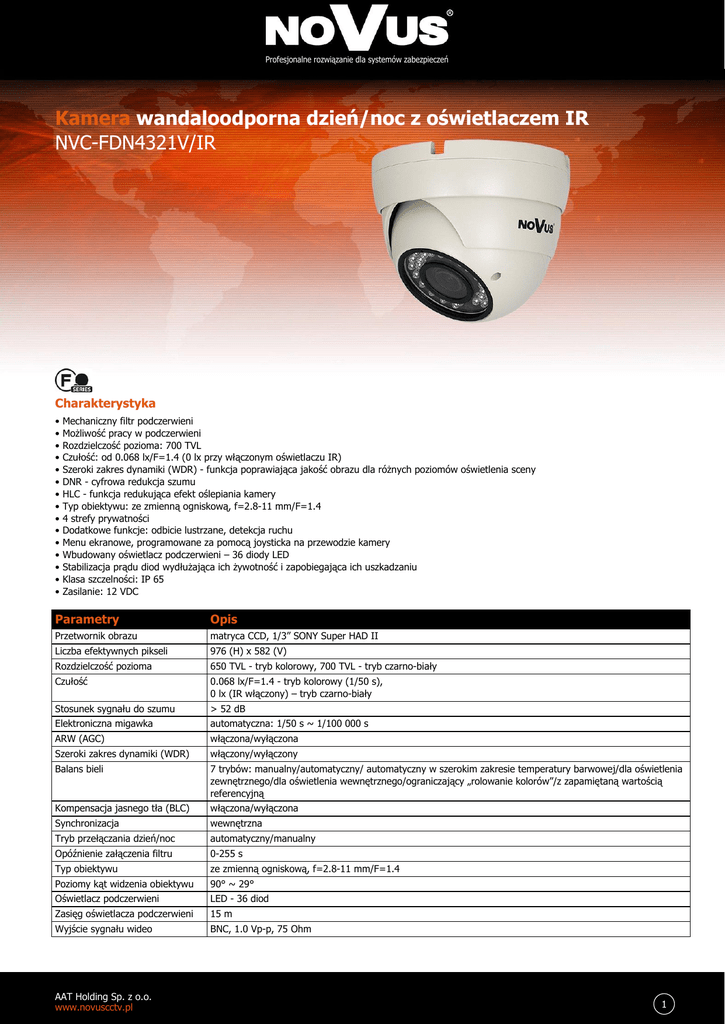Profesjonalne rozwiązanie dla systemów zabezpieczeń Kamera wandaloodporna dzień/noc z oświetlaczem IR NVC-FDN4321V/IR Charakterystyka • • • • • • • • • • • • • • • Mechaniczny filtr podczerwieni Możliwość pracy w podczerwieni Rozdzielczość pozioma: 700 TVL Czułość: od 0.068 lx/F=1.4 (0 lx przy włączonym oświetlaczu IR) Szeroki zakres dynamiki (WDR) - funkcja poprawiająca jakość obrazu dla różnych poziomów oświetlenia sceny DNR - cyfrowa redukcja szumu HLC - funkcja redukująca efekt oślepiania kamery Typ obiektywu: ze zmienną ogniskową, f=2.8-11 mm/F=1.4 4 strefy prywatności Dodatkowe funkcje: odbicie lustrzane, detekcja ruchu Menu ekranowe, programowane za pomocą joysticka na przewodzie kamery Wbudowany oświetlacz podczerwieni – 36 diody LED Stabilizacja prądu diod wydłużająca ich żywotność i zapobiegająca ich uszkadzaniu Klasa szczelności: IP 65 Zasilanie: 12 VDC Parametry Opis Przetwornik obrazu matryca CCD, 1/3” SONY Super HAD II Liczba efektywnych pikseli 976 (H) x 582 (V) Rozdzielczość pozioma 650 TVL - tryb kolorowy, 700 TVL - tryb czarno-biały Czułość 0.068 lx/F=1.4 - tryb kolorowy (1/50 s), 0 lx (IR włączony) – tryb czarno-biały Stosunek sygnału do szumu > 52 dB Elektroniczna migawka automatyczna: 1/50 s ~ 1/100 000 s ARW (AGC) włączona/wyłączona Szeroki zakres dynamiki (WDR) włączony/wyłączony Balans bieli 7 trybów: manualny/automatyczny/ automatyczny w szerokim zakresie temperatury barwowej/dla oświetlenia zewnętrznego/dla oświetlenia wewnętrznego/ograniczający „rolowanie kolorów”/z zapamiętaną wartością referencyjną Kompensacja jasnego tła (BLC) włączona/wyłączona Synchronizacja wewnętrzna Tryb przełączania dzień/noc automatyczny/manualny Opóźnienie załączenia filtru 0-255 s Typ obiektywu ze zmienną ogniskową, f=2.8-11 mm/F=1.4 Poziomy kąt widzenia obiektywu 90° ~ 29° Oświetlacz podczerwieni LED - 36 diod Zasięg oświetlacza podczerwieni 15 m Wyjście sygnału wideo BNC, 1.0 Vp-p, 75 Ohm AAT Holding Sp. z o.o. www.novuscctv.pl 1 Profesjonalne rozwiązanie dla systemów zabezpieczeń Parametry Opis Menu kamery wyświetlane na ekranie monitora (w języku angielskim) Strefy prywatności 4 Dodatkowe funkcje DNR - cyfrowa redukcja szumu, HLC - funkcja redukująca efekt oślepiania kamery, detekcja ruchu, tworzenie efektów: odbicie lustrzane, ustawienie ostrości obrazu Obudowa wandaloodporna, wykonana z aluminium, lakierowana Klasa szczelności IP 65 Zasilanie 12 VDC Pobór mocy 1,1 W 3,1 W (IR włączony) Temperatura pracy -30°C ~ 40°C Wymiary (mm) 120 (Ø) x 100 (wys) Masa 750 g AAT Holding Sp. z o.o. www.novuscctv.pl 2