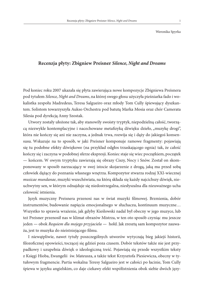 Recenzja płyty: Zbigniew Preisner Silence, Night and Dreams 1 Weronika Spyrka Recenzja płyty: Zbigniew Preisner Silence, Night and Dreams Pod koniec roku 2007 ukazała się płyta zawierająca nowe kompozycje Zbigniewa Preisnera pod tytułem Silence, Night and Dreams, na której swego głosu użyczyła pieśniarka fado i wokalistka zespołu Madredeus, Teresa Salgueiro oraz młody Tom Cully śpiewający dyszkantem. Solistom towarzyszyła Aukso Orchestra pod batutą Marka Mosia oraz chór Camerata Silesia pod dyrekcją Anny Szostak. Utwory zostały ułożone tak, aby stanowiły swoisty tryptyk, niepodzielną całość, tworzącą niezwykle kontemplacyjne i nacechowane metafizyką dźwięku dzieło, „muzykę drogi”, która nie kończy się ani nie zaczyna, a jednak trwa, rozwija się i dąży do jakiegoś konsensusu. Wskazuje na to sposób, w jaki Preisner komponuje ramowe fragmenty: pojawiają się tu podobne efekty dźwiękowe (na przykład odgłos trzaskającego ognia) tak, że całość kończy się i zaczyna w podobnej sferze ekspresji. Koniec staje się wiec początkiem, początek — końcem. W owym tryptyku zawierają się obrazy Ciszy, Nocy i Snów. Został on skomponowany w sposób narzucający w swej istocie skojarzenie z drogą, jaką ma przed sobą człowiek dążący do poznania własnego wnętrza. Kompozytor stwarza rodzaj XXI-wiecznej musicae mundanae, muzyki wszechświata, na którą składa się każdy najcichszy dźwięk, nieuchwytny sen, w którym odnajduje się niedostrzegalna, niesłyszalna dla nieuważnego ucha celowość istnienia. Język muzyczny Preisnera przenosi nas w świat muzyki filmowej. Brzmienia, dobór instrumentów, budowanie napięcia emocjonalnego w słuchaczu, kontinuum muzyczne… Wszystko to sprawia wrażenie, jak gdyby Kieślowski nadal był obecny w jego muzyce, lub też Preisner przenosił nas w klimat obrazów Mistrza, w ten oto sposób czyniąc mu jeszcze jeden — obok Requiem dla mojego przyjaciela — hołd. Jak zresztą sam kompozytor zauważa, jest to muzyka do nieistniejącego filmu. I niewątpliwie, nawet tytuły poszczególnych utworów wytyczają bieg jakiejś historii, filozoficznej opowieści, toczącej się gdzieś poza czasem. Dobór tekstów także nie jest przypadkowy i uzupełnia dźwięk o ideologiczną treść. Pojawiają się przede wszystkim teksty z Księgi Hioba, Ewangelii św. Mateusza, a także tekst Krzysztofa Piesiewicza, obecny w tytułowym fragmencie. Partia wokalna Teresy Salgueiro jest w całości po łacinie, Tom Cully śpiewa w języku angielskim, co daje ciekawy efekt współistnienia obok siebie dwóch języ- Recenzja płyty: Zbigniew Preisner Silence, Night and Dreams 2 ków, które zdominowały, ale i zintegrowały całą Europę. Kiedyś była to łacina. Dziś „łaciną XXI wieku” nazywa się język angielski. Poziom wykonawczy płyty jest bardzo wysoki. Instrumenty i solistów wybrał Preisner starannie, niczym malarz dobierający paletę kolorów. Chęć zaangażowania jako solistki Teresy Salgueiro uzasadnia kompozytor fascynacją jej wysokim i bardzo przejrzystym, czystym głosem, pozbawionym wszelkiego „klasycznego” wibrata. W całość doskonale wkomponowuje się głos dyszkantowy Toma Cully. Prostota, klarowność, nieskomplikowanie środków wykonawczych obecnych także w partiach instrumentalnych pozwala wydobyć prawdziwą głębię znaczeń, tym samym odzwierciedla przesłanie ideologiczne dzieła. Preisner operuje barwą, co więcej, to ona właśnie jest tutaj elementem formotwórczym. Minimalizm wyrazu, delikatne harmonie, nieraz trudne do uchwycenia melodie solistów podporządkowane wersetom Biblii, zrozumiałe, klarowne, a jednocześnie zawieszone w czasoprzestrzeni brzmienia czynią poszczególne utwory kontemplacją — zarówno dla wykonawców, jak i dla słuchacza. Jakość nagrania także jest znakomita. Sprawia, iż można w pełni delektować się muzyką Preisnera. Oprawa graficzna — oszczędna, wręcz można by powiedzieć, purystyczna, acz pasująca do estetyki owej muzyki, co jest jej niewątpliwym atutem — zawiera teksty użyte w utworach oraz ich tłumaczenia na niemiecki, angielski i francuski. Preisner kieruje więc swą płytę do szerszej publiczności. Zabrakło tu jednak tłumaczenia na język polski. Oprawa graficzna została wzbogacona o fotografie kompozytora i solistów, co czyni ją ciekawszą. Atutem natomiast z pewnością nie jest cena płyty (ok. 60 zł), choć wielbiciele muzyki filmowej Preisnera, a także i muzyki kontemplacyjnej, naznaczonej specyficzną zadumą dźwiękową, nie pozbawioną przesłania pozamuzycznej treści, które wyraża filozoficzny dialog ze słuchaczem, nie będą żałowali zakupu. Silence, Night and Dreams nie odbiega znacznie w swym wyrazie od poprzednich kompozycji Preisnera, jednak jest to zjawisko niezwykle ciekawe, wymykające się wszelkiej analizie, zresztą — w moim rozumieniu — nie przeznaczone do analizy „typowo” muzycznej. Preisnerowi udało się stworzyć niepowtarzalny, nacechowany niezwykłym indywidualizmem, przemawiający do wyobraźni język, który pozostawia słuchaczowi miejsce na własną interpretację, subiektywny odbiór. Muzyka ta zdaje się skłaniać do przemyśleń, zagłębiania się w swoje odczucia i poszukiwania własnego fragmentu ciszy, nocy i snów w świecie pełnym chaosu, hałasu cywilizacji, szaleńczego tempa życia, jakie sobie sami narzuciliśmy, coraz doskonalszych technologii i coraz większego, bardziej namacalnego oddalania się Człowieka od Człowieka. Jako podsumowanie chciałabym przytoczyć tłumaczenie słów kompozytora, zamieszczone w książeczce dołączonej do płyty. Są one niezwykle istotne, gdyż stanowią właściwe credo całości, odzwierciedlają świat idei, które kierowały kompozytorem przy tworzeniu powyższego dzieła, wskazują na funkcję, jaką ma spełniać muzyka zawarta na płycie. A ce- Recenzja płyty: Zbigniew Preisner Silence, Nig