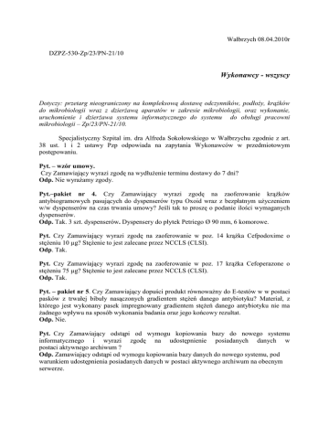 Wałbrzych 08.04.2010r DZPZ-530-Zp/23/PN-21/10 Wykonawcy - wszyscy Dotyczy: przetarg nieograniczony na kompleksową dostawę odczynników, podłoŜy, krąŜków do mikrobiologii wraz z dzierŜawą aparatów w zakresie mikrobiologii, oraz wykonanie, uruchomienie i dzierŜawa systemu informatycznego do systemu do obsługi pracowni mikrobiologii – Zp/23/PN-21/10. Specjalistyczny Szpital im. dra Alfreda Sokołowskiego w Wałbrzychu zgodnie z art. 38 ust. 1 i 2 ustawy Pzp odpowiada na zapytania Wykonawców w przedmiotowym postępowaniu. Pyt. – wzór umowy. Czy Zamawiający wyrazi zgodę na wydłuŜenie terminu dostawy do 7 dni? Odp. Nie wyraŜamy zgody. Pyt.–pakiet nr 4. Czy Zamawiający wyrazi zgodę na zaoferowanie krąŜków antybiogramowych pasujących do dyspenserów typu Oxoid wraz z bezpłatnym uŜyczeniem w/w dyspenserów na czas trwania umowy? Jeśli tak to proszę o podanie ilości wymaganych dyspenserów. Odp. Tak. 3 szt. dyspenserów. Dyspensery do płytek Petriego Ø 90 mm, 6 komorowe. Pyt. Czy Zamawiający wyrazi zgodę na zaoferowanie w poz. 14 krąŜka Cefpodoxime o stęŜeniu 10 µg? StęŜenie to jest zalecane przez NCCLS (CLSI). Odp. Tak. Pyt. Czy Zamawiający wyrazi zgodę na zaoferowanie w poz. 17 krąŜka Cefoperazone o stęŜeniu 75 µg? StęŜenie to jest zalecane przez NCCLS (CLSI). Odp. Tak. Pyt. – pakiet nr 5. Czy Zamawiający dopuści produkt równowaŜny do E-testów w w postaci pasków z trwałej bibuły nasączonych gradientem stęŜeń danego antybiotyku? Materiał, z którego jest wykonany pasek impregnowany gradientem stęŜeń danego antybiotyku nie ma Ŝadnego wpływu na sposób wykonania badania oraz jego końcowy rezultat. Odp. Nie. Pyt. Czy Zamawiający odstąpi od wymogu kopiowania bazy do nowego systemu informatycznego i wyrazi zgodę na udostępnienie posiadanych danych w postaci aktywnego archiwum ? Odp. Zamawiający odstąpi od wymogu kopiowania bazy danych do nowego systemu, pod warunkiem udostępnienia posiadanych danych w postaci aktywnego archiwum na obecnym serwerze. Pyt. Czy Zamawiający dopuści zaoferowanie stacji roboczych o następujących parametrach: stacja robocza: FUJITSU: P2550 E6300 (2.8) 2GB 320GB DVD GF7050 W7P/XPP, Klasa produktu: Komputer ; Typ obudowy komputera: Micro Tower; Nazwa rodziny produktów: ESPRIMO P2550; Ilość zainstalowanych procesorów: 1szt.; Maksymalna ilość procesorów:1 szt.; Typ zainstalowanego procesora: Intel Pentium E (Dual-Core); Kod procesora: E6300; Częstotliwość procesora: 2,8 GHz;n Częstotliwość szyny FSB: 1066 MHz; Pojemność pamięci cache [L2]: 2MB; Ilość zainstalowanych dysków: 1 szt.; Maksymalna ilość dysków: 2 szt.; Pojemność zainstalowanego dysku: 320 GB; Typ zainstalowanego dysku:SATA II; Zainstalowane sterowniki dysków: 4 x SATA; Pojemność zainstalowanej pamięci: 2048 MB; Maksymalna pojemność pamięci: 4096 MB; Rodzaj zainstalowanej pamięci: DDR2; Typ pamięci: Non-ECC; Częstotliwość szyny pamięci: 800 MHz; Ilość banków pamięci: 2 szt.; Ilość wolnych banków pamięci: 1 szt.; Producent chipsetu zainstalowanej płyty głównej: NVIDIA; Typ zainstalowanego chipsetu: MCP73PV; Zintegrowana karta graficzna: Tak; Typ zintegrowanej karty graficznej: NVIDIA GeForce 7050; Zintegrowana karta dźwiękowa: Tak; Typ zintegrowanej karty dźwiękowej: Realtek ALC663; Zintegrowana karta sieciowa: Tak; Typ zintegrowanej karty sieciowej:10/100/1000 Mbit/s; Bezprzewodowa karta sieciowa: Nie; Bluetooth: Nie; Ilość slotów AGP: 0 szt.; Ilość wolnych slotów AGP: 0 szt.; Ilość slotów PCI: 2 szt.; Ilość wolnych slotów PCI: 2 szt.; Ilość slotów PCI-E 1x: 1 szt.; Ilość wolnych slotów PCI-E 1x: 0 szt.; Ilość slotów PCI-E 4x: 0 szt.; Ilość slotów PCI-E 8x: 0 szt.;Ilość slotów PCI-E 16x: 1 szt.; Ilość wolnych slotów PCI-E 16x: 1szt.; Ilość slotów PCI-X 64-bit/100MHz Non Hot Plug: 0 szt.; Ilość slotów PCI-X 64-bit/133MHz Non Hot Plug: 0 szt.; Dodatkowe informacje n/t slotów PCI: 1 x slot PCI-E 16x (standard), 1 x slot PCI-E 1x (standard), 2x slot PCI (standard); Ilość wolnych kieszeni 3,5 (zewnętrznych): 1 szt.; Ilość wolnych kieszeni 3,5 slim (zewnętrznych): 0 szt.; Ilość wolnych kieszeni 3,5 (wewnętrznych): 1 szt.; Ilość wolnych kieszeni 5,25 (zewnętrznych): 1 szt.; Interfejsy: 1 x Serial, 1 x 15-stykowe D-Sub (wyjście na monitor), 1 x wejście na mikrofon (mono), 1 x wejście liniowe (stereo), 1 x wyjście liniowe (stereo, 1 Wat), 1 x wejście na mikrofon (na froncie obudowy), 1 x wyjście słuchawkowe (na froncie obudowy), 1 x RJ-45 (LAN), 8 x USB 2.0, PS/2 (mysz), PS/2 (klawiatura); Dodatkowe informacje o portach USB 2.0/3.0: 2 x USB 2.0 (przedni panel), 4 x USB 2.0 (tylny panel), 2 x USB 2.0 (opcja); Napędy wbudowane (zainstalowane): DVD?RW Super Multi (+ DVD-RAM) Dual Layer; System operacyjny: Microsoft Windows 7 Professional PL 64-bit, Microsoft Windows XP Professional PL; Dołączone wyposaŜenie: mysz, klawiatura; Szerokość: 175 mm; Wysokość: 353 mm; Głębokość: 425 mm; Masa netto: brak danych; Dodatkowe informacje: MoŜliwość downgrade-u do Microsoft Windows XP Pro plus karta 2xRS232? Odp. Zamawiający dopuści zaoferowane stacje robocze z zainstalowanym systemem operacyjnym wraz z oprogramowaniem biurowym OFFICE 2007 o parametrach ze SIWZ. serwera o następujących parametrach: SERWER - HP ML110T05 QC X3220 2400-8M/1066(2*250GB NHP LFF SATA, 2*1GB, DVD,3Y NBD 9x5); Klasa produktu: Serwer; Typ obudowy serwera: Tower; Nazwa rodziny produktów: ProLiant ML110 G5; Ilość zainstalowanych procesorów: 1 szt.; Maksymalna ilość procesorów: 1 szt.; Typ zainstalowanego procesora: Intel Xeon /Quad-Core/; Kod procesora: X3220; Częstotliwość procesora: 2,4 GHz; Częstotliwość szyny FSB: 1066 MHz; Pojemność pamięci cache [L2]: 8 MB; Ilość zainstalowanych dysków: 2 szt.; Maksymalna ilość dysków: 4 szt.; Pojemność zainstalowanego dysku: 2*250 GB; Typ zainstalowanego dysku: SATA; Zainstalowane sterowniki dys