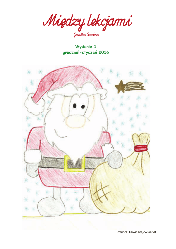 Miêdzy lekcjami Gazetka Szkolna Wydanie 1 grudzień-styczeń 2016 Rysunek: Oliwia Krajewska VIf KĄCIK MOLA KSIĄŻKOWEGO Seria książek "Spirit Animals" Książki z serii na pewno spodobają się miłośnikom gatunku fantasy. Cały cykl opowiada bowiem o przygodach czwórki nastolatków-Abeke, Meilin, Conora i Rollana, mieszkających na różnych kontynentach krainy zwanej Erdas. Każdy z nich bierze udział w rytuale, podczas którego przywołuje jedną z Czterech Wielkich Bestiilamparcicę, sokoła, pandę oraz wilka. Głównym zadaniem dzieci jest odkrycie niezwykłej więzi łączącej ich ze zwierzoduchami, która pozwoli uzyskać im wielką moc i uratować świat przed zagładą. Seria składa się z siedmiu części - "Zwierzoduchy", "Polowanie", "Więzy Krwi", "Ogień i Lód", "Naprzeciw Falom", "Wzlot i upadek" oraz "Wszechdrzewo" (ostatnia nie miała jeszcze swojej premiery). Wszystkie są niezwykle wciągające, chociaż występujące w nich częste opisy przyrody mogą nieco zniechęcić czytelnika. Jest to także swego rodzaju eksperyment, bowiem każdą z książek pisze inny autor. Według mnie największą przyjemność sprawia odkrywanie tajemnic Erdas, jak i bliższe poznanie postaci. Bohaterowie są przedstawieni w sposób bardzo realistyczny. Każdy posiada swoją historię, ma jakiś określony cel. Czasem trudno jest się im ze sobą porozumieć, ale razem tworzą zgraną drużynę. Akcja rozwija się dość szybko, istnieje wiele ciekawych wątków pobocznych. Pomysł na serię był również oryginalny - trudno jest znaleźć coś o podobnej i równie interesującej fabule. Na pierwszy rzut oka można stwierdzić, że autorzy posiadają bogaty zasób słownictwa, chociaż w niektórych momentach występują powtórzenia, ale nawet najlepszemu to się zdarza. Podsumowując, są to publikacje warte przeczytania, mimo, że posiadają kilka, ale niewielkich błędów. Jeśli zdecydujesz się sięgnąć po te tytuły, życzę ci miłej lektury! Ewelina Jagiełło, kl.VIe 2 Święta tuż, tuż! Zapewne każdy kojarzy je sobie ze śniegiem, ubieraniem choinki, prezentami, spędzaniem czasu z rodziną, zajadaniem się dwunastoma potrawami, z opłatkiem… no właśnie, ale czy w ogóle wiecie, co one tak naprawdę symbolizują? Może nawet kiedyś zastanawialiście się dlaczego 12 potraw, a nie np. 10? Po co śpiewamy kolędy i dlaczego idziemy na Pasterkę? 1. Opłatek - w geście łamania się opłatkiem zawarte jest pojednanie i wzajemne wyrażanie sobie życzliwości, 2. Siano i snop słomy przypomina ubóstwo groty betlejemskiej, ze słomy wróżono urodzaj, 3. 12 potraw wigilijnych - na pamiątkę 12 apostołów, 4. Pierwsza Gwiazdka - jest symbolem Gwiazdy Betlejemskiej, której pojawienie się towarzyszyło narodzinom Jezusa. 5. Kolędy - zaczynamy je śpiewać przy wigilijnym stole. Są to pieśni, które opowiadają o Narodzeniu Pana 6. Stajenka - w niej narodził się Jezus. Jest także symbolem nas samych. 7. Pasterka - tradycyjna msza odprawiana w nocy z 24 na 25 grudnia. Symbolizuje czuwanie pasterzy przy żłobie Jezusa 8. Choinka - symbol odradzającego się stale życia. Zawieszane na nie ozdoby, bądź smakołyki nie są zawieszane przypadkowo: · łańcuchy wzmacniają rodzinne więzi, · lampki i bombki mają chronić dom od demonów i ludzkiej nieżyczliwości, · gwiazdka na czubku - to pamiątka gwiazdy betlejemskiej oraz znak mający pomagać w powrocie członków rodziny przebywających poza domem, · dzwonki oznaczają dobre nowiny i radosne wydarzenia w rodzinie, · aniołki, to opiekunowie domu, · jabłka symbolizują zdrowie i urodę, · orzechy zawijane w złotko, mają zapewnić dobrobyt i siły witalne, · miodowe pierniki - dostatek na przyszły rok. 3 Wigilijne przesądy -W tym dniu nie należy się sprzeczać, kłócić ani płakać, bo niezgoda i smutek będą częste w domu, aż do następnej Wigilii. - Zachorowanie lub zranienie się zapowiada słabe zdrowie przez cały rok. -Jeżeli w Wigilię pierwszy przyjdzie lub zatelefonuje mężczyzna, to szczęście dla tego domu, a jeśli kobieta - to choroba lub inne niepomyślne zdarzenie. - Podczas wieczerzy wigilijnej nie należy zbyt dużo mówić czy przerywać innym, aby w przyszłym roku nie kłócić się i nie wyjawiać powierzonych sekretów. Wigilijne obyczaje -Dzielenie się opłatkiem zapewnia dostatek chleba w przyszłym roku oraz symbolizuje zgodę, wybaczenie i puszczenie w niepamięć wszystkich urazów. -Nie należy wstawać zza stołu w trakcie posiłku. Zakaz ten nie dotyczy gospodyni lub innej osoby podającej do stołu. - Do stołu należy siadać według najstarszego, aby i schodzić z tego świata w takiej kolejności. - Każdą potrawę należy chociażby spróbować, aby jej nie zabrakło na stole w przyszłym roku. - W tym dniu obowiązuje zasada: "Jak w Wigilię, tak i przez cały rok". - Dlatego dobrze jest zabrać się rano do nieuciążliwej pracy, aby być zdrowym, rześkim i pracowitym przez cały rok. Nie należy się też przemęczać. Wigilijne wróżby -Jeżeli chcesz się przekonać, czy w nowym roku zakochasz się, zjedz jabłko i policz pestki. Jeśli liczba pestek jest parzysta, to odpowiedź jest pozytywna, a jeśli pestek będzie więcej niż sześć, to twoje szczęście będzie podwójne. -Dobrze jest mieć podczas wieczerzy nawet drobną sumę pieniędzy, aby nie cierpieć na ich brak przez cały rok. -Łuski z karpia spożytego podczas wieczerzy wigilijnej, noszone w portmonetce przez cały rok, przyciągną pieniądze. -Wszelkie długi, w miarę możliwości, wskazane jest do Wigilii zwrócić. (źródło internet) 4 Historia BOŻEGO NARODZENIA Boże Narodzenie, czy też Narodzenie Pańskie – w tradycji chrześcijańskiej jest to święto upamiętniające narodziny Jezusa Chrystusa. Jest to stała uroczystość liturgiczna przypadająca na 25 grudnia. Boże Narodzenie poprzedzone jest okresem trzytygodniowego oczekiwania (dokładnie czte
