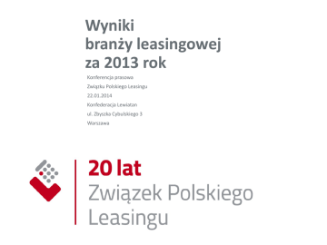 Wyniki branży leasingowej za 2013 rok Konferencja prasowa Związku Polskiego Leasingu 22.01.2014 Konfederacja Lewiatan ul. Zbyszka Cybulskiego 3 Warszawa Lista członków Związku Polskiego Leasingu Akf leasingPolska S.A. BGŻ Leasing Sp. z o.o. BNP Paribas Leasing Solutions BZ WBK Leasing S.A. Caterpillar Financial Services Poland Sp. z o.o. De Lage Landen Leasing Polska S.A. Deutsche Leasing Polska S.A. DnB Nord Leasing Sp. z o.o. Europejski Fundusz Leasingowy S.A. Getin Leasing S.A. Handlowy-Leasing Sp. z o. o. IKB Leasing Polska Sp. z o.o. ING Lease (Polska) Sp. z o.o. Masterlease Polska S.A. Mercedes-Benz Leasing Polska Sp. z o.o. Millennium Leasing Sp. z o.o. mLeasing Sp. z o. o. NOMA 2 Sp. z o.o. Nordea Finance Polska S.A. ORIX Polska S.A. PEKAO Leasing Sp. z o.o. PKO Leasing S.A. Polski Związek Wynajmu i Leasingu Pojazdów Raiffeisen Leasing Polska S.A. Scania Finance Polska Sp. z o.o. SG Equipment Leasing Polska Sp. z o.o. SGB Leasing Sp. z o.o. Siemens Finance Sp. z o.o. VB Leasing Polska Polska S.A. VFS Usługi Finansowe Polska Sp. z o.o. Volkswagen Leasing Polska Sp. z o.o. Rynek leasingu Łączne aktywa sfinansowane przez firmy leasingowe 12 239 13 839 I-IX 13 / I-IX 12 13,1% 4 618 6 882 X-XII 13 / XXII 12 49,0% 16 857 20 721 I-XII 13 / I-XII 12 22,9% pojazdy lekkie 6 955 7 706 10,8% 2 727 3 516 28,9% 9 682 11 222 15,9% pojazdy ciężarow e 4 635 5 505 18,8% 1 728 2 841 64,4% 6 363 8 346 31,2% 649 628 -3,3% 163 526 223,2% 812 1 154 42,1% 8 120 392 788 218 8 279 396 507 233 1,9% 3 012 162 132 78 3 232 160 61 80 7,3% 11 132 554 920 295 11 510 556 568 314 3,4% I-IX 2012 Pojazdy pozostałe pojazdy Maszyny IT Samoloty, statki, kolej Pozostałe ruchomości Ruchomości razem Nieruchomości Finansowanie ogółem (L+P) I-IX 2013 21 757 23 253 750 1,0% -35,7% 7,2% 6,9% 1 095 45,9% 22 507 24 348 8,2% Wartość sfinansowanych aktywów w 2013 roku powyżej rekordowego dotąd 2008 roku, kiedy to rynek leasingu wyniósł 32,9 mld zł. Przyspieszająca z kwartału na kwartał dynamika dla wartości aktywów ruchomych sfinansowanych przez firmy leasingowe: -1,3% r/r dla I kw., 5,8% dla II kw., 16,0% dla III kw. 30,2% dla IV kwartału 2013 roku. W miarę zrównoważona struktura wzrostu całego rynku leasingu, z pojazdami ciężarowymi jako głównym motorem rozwoju: od 0,1% r/r w I kwartale do 64,4% w IV kw. 2013. X-XII 2012 X-XII 2013 8 000 10 416 718 -1,0% -53,6% 3,5% 30,2% 536 -25,3% 8 718 10 952 25,6% I-XII 2012 I-XII 2013 29 758 33 669 1 468 0,4% -38,2% 6,2% 13,1% 1 630 11,1% 31 226 35 300 13,0% Wyższe zakupy pojazdów ciężarowych za sprawą wdrażanej od 1. stycznia 2014 normy Euro 6. Pomaga też bazujące na wzroście eksportu wyjście strefy euro z recesji. Wysoka dynamika dla pojazdów lekkich, pod wpływem rosnącej liczby rejestracji nowych (co jest powiązane z odnawianiem masowych umów na leasing aut z „kratką” z lat 2009-2010) oraz niepewności co do finalnego rozwiązania w zakresie VAT-u od zakupu aut. Stabilny sektor maszyn, w I połowie roku pod negatywnym wpływem załamania w sektorze budowlanym. W II półroczu dla wyniku maszyn coraz większe znaczenie miała poprawa koniunktury, co skłaniało firmy do odnowy parków maszynowych. Aktywa sfinansowane leasingiem 11 982 13 255 I-IX 13 / I-IX 12 10,6% 4 429 6 352 X-XII 13 / XXII 12 43,4% 16 411 19 607 I-XII 13 / I-XII 12 19,5% pojazdy lekkie 6 908 7 491 8,4% 2 690 3 394 26,2% 9 599 10 886 13,4% pojazdy ciężarow e 4 437 5 151 16,1% 1 581 2 441 54,4% 6 018 7 592 26,2% 637 612 -3,9% 157 517 228,8% 794 1 128 42,2% 5 491 382 781 216 5 513 376 496 229 0,4% 2 165 157 56 74 11,3% 7 435 530 911 285 7 678 533 552 304 3,3% 6,3% 1 944 149 130 69 5,4% 6 721 8 804 31,0% 1 025 42,3% 587 521 -11,2% 19 572 20 894 6,8% 7 308 9 325 27,6% I-IX 2012 Pojazdy pozostałe pojazdy Maszyny IT Samoloty, statki, kolej Pozostałe ruchomości Ruchomości razem Nieruchomości Leasing ogółem I-IX 2013 18 851 19 869 721 -1,6% -36,4% X-XII 2012 X-XII 2013 5,7% -57,2% 7,7% I-XII 2012 I-XII 2013 25 572 28 673 1 307 0,5% -39,4% 6,6% 12,1% 1 546 18,3% 26 879 30 219 12,4% Aktywa sfinansowane pożyczką 258 584 I-IX 13 / I-IX 12 126,9% 189 530 X-XII 13 / XXII 12 181,1% 446 1 114 I-XII 13 / I-XII 12 149,8% 47 214 359,3% 37 122 229,3% 84 336 301,8% pojazdy ciężarow e 198 354 78,5% 146 399 173,4% 344 754 118,8% pozostałe pojazdy 13 16 28,0% 6 9 63,1% 18 25 38,8% 2 629 11 7 2 2 765 20 11 4 5,2% 1 067 3 6 6 0,0% 116,8% 1 067 13 2 8 -30,7% 3 697 24 9 10 3 833 23 16 10 2 906 3 385 16,5% 1 279 1 612 26,0% 4 186 4 996 19,4% 29 69 135,8% 131 15 -88,7% 160 84 -47,6% 2 936 3 454 17,6% 1 410 1 626 15,3% 4 346 5 080 16,9% I-IX 2012 Pojazdy pojazdy lekkie Maszyny IT Samoloty, statki, kolej Pozostałe ruchomości Ruchomości razem Nieruchomości Pożyczka ogółem I-IX 2013 Maszyny sfinansowane pożyczką Sprzęt medyczny 10% Maszyny dla przemysłu spożywczego 1% Inne MiU 6% Sprzęt budowlany 5% Maszyny do prod. tw. sztucznych i obróbki metali 7% Maszyny poligraficzne 3% Maszyny rolnicze 68% 91,2% 49,2% X-XII 2012 X-XII 2013 -78,3% 187,1% I-XII 2012 I-XII 2013 3,7% -1,7% 78,9% -5,5% Aktywa sfinansowane pożyczką w 2013 r. to 14,4% całości produkcji firm leasingowych, przy 13,9% w 2012 roku. Rosnący udział pojazdów sfinansowanych pożyczką w strukturze pożyczki (21,9% w 2013 przy 10,3% w 2012) oraz w łącznym finansowaniu pojazdów (5,4% przy 2,6% dla 2012). Zakupy maszyn wciąż stanowią główny rodzaj inwestycji finansowanej poprzez pożyczką (75,4% udziału w 2013), jednak ich udział spadł z 85,1% w 2012. Pożyczka stanowi 33,3% całości produkcji maszyn. Niższy niż oczekiwano wpływ końca perspektywy finansowej 2007-2013 z funduszami unijnymi na maszyny rolnicze finansowane pożyczką: wzrost o 4,1% w 2013, z -1,2% dla IV kw. Wyniki spółek leasingowych w 2013 roku – nowa produkcja w leasingu i pożyczce Dodatni wynik rynku finansowania w 2013 roku za sprawą poprawy obejmującej większość firmy w branży. 3 500 3 169 3 000 2 589 2 