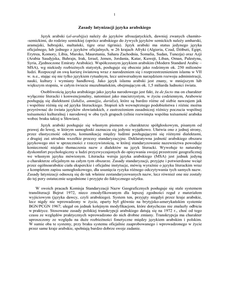 1 Zasady latynizacji języka arabskiego Język arabski (al-arabijja) należy do języków afroazjatyckich, dawniej zwanych chamito-semickimi, do rodziny semickiej (oprócz arabskiego do żywych języków semickich należy amharski, aramejski, hebrajski, maltański, tigre oraz tigrinia). Język arabski ma status jedynego języka oficjalnego, lub jednego z języków oficjalnych, w 26 krajach Afryki (Algieria, Czad, Dżibuti, Egipt, Erytrea, Komory, Libia, Maroko, Mauretania, Sahara Zachodnia, Somalia, Sudan, Tunezja) oraz Azji (Arabia Saudyjska, Bahrajn, Irak, Izrael, Jemen, Jordania, Katar, Kuwejt, Liban, Oman, Palestyna, Syria, Zjednoczone Emiraty Arabskie). Współczesnym językiem arabskim (Modern Standard Arabic – MSA), wg niekiedy rozbieżnych statystyk, posługuje się obecnie jako rodzimym ok. 250 milionów ludzi. Rozpoczął on swą karierę światową wraz z narodzeniem się i rozprzestrzenieniem islamu w VII w. n.e., stając się nie tylko językiem rytualnym, lecz uniwersalnym narzędziem rozwoju administracji, nauki, kultury i wymiany handlowej. Jako język islamu arabski jest znany, w mniejszym lub większym stopniu, w całym świecie muzułmańskim, obejmującym ok. 1,5 miliarda ludności świata. Osobliwością języka arabskiego jako języka narodowego jest fakt, że de facto ma on charakter wyłącznie literacki i konwencjonalny, natomiast jako macierzystym, w życiu codziennym, Arabowie posługują się dialektami (lahdża, ammijja, daridża), które są bardzo różne od siebie nawzajem jak i wspólnie różnią się od języka literackiego. Stopień ich wewnętrznego podobieństwa i różnic można przyrównać do świata języków słowiańskich, z zastrzeżeniem zasadniczej różnicy poczucia wspólnej tożsamości kulturalnej i narodowej w obu tych grupach (silnie rozwinięta wspólna tożsamość arabska wobec braku takiej u Słowian). Język arabski posługuje się własnym pismem o charakterze spółgłoskowym, pisanym od prawej do lewej, w którym samogłoski zaznacza się jedynie wyjątkowo. Ułatwia ono z jednej strony, przez elastyczność odczytu, komunikację między ludźmi posługującymi się różnymi dialektami, z drugiej zaś utrudnia wszelkie procesy standaryzacyjne. Deklaratywna jedność arabskiego obszaru językowego stoi w sprzeczności z rzeczywistością, w której standaryzowanie nazewnictwa powoduje konieczność niejako tłumaczenia nazw z dialektów na język literacki. Wywołuje to naturalny dyskomfort psychologiczny u ludzi przyzwyczajonych do opisywania swojej przestrzeni geograficznej we własnym języku mówionym. Literacka wersja języka arabskiego (MSA) jest jednak jedyną o charakterze oficjalnym na całym tym obszarze. Zasady standaryzacji, przyjęte i potwierdzane wciąż przez ogólnoarabskie ciała eksperckie i oficjalne instytucje, mówią wyraźnie o języku literackim wraz z kompletem zapisu samogłoskowego, dla usunięcia ryzyka różnego odczytywania tych samych nazw. Zasady latynizacji odnoszą się do tak właśnie zestandaryzowanych nazw, lecz również one nie zostały do tej pory ostatecznie uzgodnione i przyjęte do faktycznego użytku. W swoich pracach Komisja Standaryzacji Nazw Geograficznych posługuje się stale systemem transliteracji Bejrut 1972, nieco zmodyfikowanym dla lepszej zgodności reguł z materiałem wyjściowym (języka dawcy, czyli arabskiego). System ten, przyjęty niegdyś przez kraje arabskie, lecz nigdy nie wprowadzony w życie, oparty był głównie na brytyjsko-amerykańskim systemie BGN/PCGN 1967; ulegał on jednak kolejnym modyfikacjom, które dotychczas nie znalazły odbicia w praktyce. Stosowane zasady polskiej transkrypcji arabskiego datują się na 1972 r., choć od tego czasu ze względów praktycznych wprowadzono do nich drobne zmiany. Transkrypcja ma charakter uproszczony ze względu na duże rozbieżności fonetyczne między językiem arabskim i polskim. W sumie oba te systemy, przy braku systemu oficjalnie zaaprobowanego i wprowadzonego w życie przez same kraje arabskie, spełniają bardzo dobrze swoje zadanie. 2 Spółgłoski formy liter: transliteracja wewnętrzna początkowa samodzielna końcowa ء,ﺉ,ﺆ,ﺄ ﺎ ﺐ ﺖ ﺚ ﺞ ﺢ ﺦ ﺪ ﺬ ﺮ ﺰ ﺲ ﺶ ﺺ ﺾ ﻂ ﻆ ﻊ ﻎ ﻒ ﻖ ﻚ ﻞ ﻢ ﻦ ﻮ ﻪ ﺔ ﻲ 1 ء,ﺉ,ﺆ,ﺄ ﺎ ﺒ ﺘ ﺜ ﺠ ﺤ ﺨ ﺪ ﺬ ﺮ ﺰ ﺴ ﺸ ﺼ ﻀ ﻄ ﻈ ﻌ ﻐ ﻔ ﻘ ﻜ ﻠ ﻤ ﻨ ﻮ ﻬ 1 ﺇ,ﺃ ا ﺑ ﺗ ﺛ ﺟ ﺣ ﺧ ﺩ ﺫ ﺭ ﺯ ﺳ ﺷ ﺻ ﺿ ﻃ ﻅ ﻋ ﻏ ﻓ ﻗ ﻛ ﻟ ﻣ ﻧ ﻭ ﻫ - - ﯿ ﯾ 2 ء ا ﺏ ﺕ ﺙ ﺝ ﺡ ﺥ ﺩ ﺫ ﺭ ﺯ ﺱ ﺵ ﺹ ﺽ ﻁ ﻇ ﻉ ﻍ ﻑ ﻕ ﻙ ﻝ ﻡ ﻥ ﻭ ﮦ ﺓ ﻱ transkrypcja ’,-3 ’,-4 - -5 b b t t th s j dż ḥ6 h kh ch d d dh z r r z z s s sh sz ṣ6 s ḍ6 d ṭ6 t ẓ6 z ‘ ’,-7 gh gh f f q k k k l l m m n n w w h h h,t8 -,t8 y j Ligatura9 końcowa ﻻ, ﻼ forma: transliteracja wewnętrzna początkowa samodzielna ﻻ,ﻼ ﻻ ﻻ lā transkrypcja la 3 Samogłoski końcowa ◌َ ﺂ, َ◌ﺎ - formy liter: transliteracja wewnętrzna początkowa samodzielna ◌َ ﺂ, َ◌ﺎ ◌ٰ rا ﺁ ◌َ ﺁ ◌ٰ ٰى ◌ِ ِ◌ﻱ - ◌ٰﻰ ◌ِ ِ◌ﻲ - - ◌ِ ِ◌ﯿ ◌ُ ُ◌ﻮ ◌ُ ُ◌ﻮ ◌ِﺇ ﺇِ◌ﯾ ُأ أُﻭ 10 ◌ُ ُ◌ﻭ transkrypcja a a ā a à a á a i i ī i u u ū u Dyftongi końcowa ◌َْ◌ ﻲ ◌َْ◌ﻮ ◌ُْ◌ ﻲ formy liter: transliteracja wewnętrzna początkowa samodzielna ◌َْ◌ ﻴ ◌َْ◌ﻮ ◌ُْ◌ ﻴ ◌ْ ﻳrا ◌ْ ﻭr ا ◌ْأُ ﻳ ◌َْ◌ ﻱ ◌َْ◌ﻭ ◌ُْ◌ ﻱ transkrypcja ay aj aw au uy uj Znaki specjalne ◌ْ ◌ّ sukun, dżazma znak oznaczający brak samogłoski po spółgłosce, nad którą został umieszczony szadda, taszdid znak oznaczający podwojenie spółgłoski, nad którą został umieszczony ﭐ wasla ◌ً , ◌ٍ , ◌ٌ tanwin (lub nunacja) znak redukcji krótkiej samogłoski słabej a, i lub u na początku wyrazu, zastępujący w p