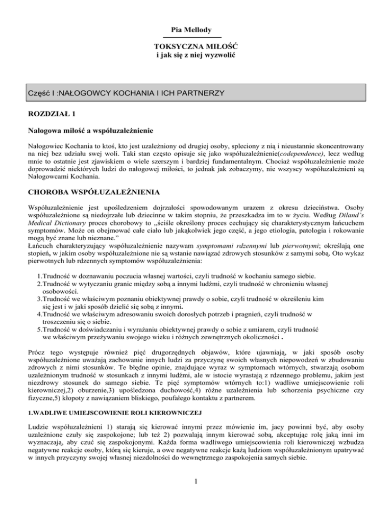 Pia Mellody TOKSYCZNA MIŁOŚĆ i jak się z niej wyzwolić Część I :NAŁOGOWCY KOCHANIA I ICH PARTNERZY ROZDZIAŁ 1 Nałogowa miłość a współuzależnienie Nałogowiec Kochania to ktoś, kto jest uzależniony od drugiej osoby, spleciony z nią i nieustannie skoncentrowany na niej bez udziału swej woli. Taki stan często opisuje się jako współuzależnienie(codependence), lecz według mnie to ostatnie jest zjawiskiem o wiele szerszym i bardziej fundamentalnym. Chociaż współuzależnienie może doprowadzić niektórych ludzi do nałogowej miłości, to jednak jak zobaczymy, nie wszyscy współuzależnieni są Nałogowcami Kochania. CHOROBA WSPÓŁUZALEŻNIENIA Współuzależnienie jest upośledzeniem dojrzałości spowodowanym urazem z okresu dzieciństwa. Osoby współuzależnione są niedojrzałe lub dziecinne w takim stopniu, że przeszkadza im to w życiu. Według Diland’s Medical Dictionary proces chorobowy to ,,ściśle określony proces cechujący się charakterystycznym łańcuchem symptomów. Może on obejmować całe ciało lub jakąkolwiek jego część, a jego etiologia, patologia i rokowanie mogą być znane lub nieznane.” Łańcuch charakteryzujący współuzależnienie nazywam symptomami rdzennymi lub pierwotnymi; określają one stopień, w jakim osoby współuzależnione nie są wstanie nawiązać zdrowych stosunków z samymi sobą. Oto wykaz pierwotnych lub rdzennych symptomów współuzależnienia: 1.Trudność w doznawaniu poczucia własnej wartości, czyli trudność w kochaniu samego siebie. 2.Trudność w wytyczaniu granic między sobą a innymi ludźmi, czyli trudność w chronieniu własnej osobowości. 3.Trudność we właściwym poznaniu obiektywnej prawdy o sobie, czyli trudność w określeniu kim się jest i w jaki sposób dzielić się sobą z innymi. 4.Trudność we właściwym adresowaniu swoich dorosłych potrzeb i pragnień, czyli trudność w troszczeniu się o siebie. 5.Trudność w doświadczaniu i wyrażaniu obiektywnej prawdy o sobie z umiarem, czyli trudność we właściwym przeżywaniu swojego wieku i różnych zewnętrznych okoliczności . Prócz tego występuje również pięć drugorzędnych objawów, które ujawniają, w jaki sposób osoby współuzależnione uważają zachowanie innych ludzi za przyczynę swoich własnych niepowodzeń w zbudowaniu zdrowych z nimi stosunków. Te błędne opinie, znajdujące wyraz w symptomach wtórnych, stwarzają osobom uzależnionym trudność w stosunkach z innymi ludźmi, ale w istocie wyrastają z rdzennego problemu, jakim jest niezdrowy stosunek do samego siebie. Te pięć symptomów wtórnych to:1) wadliwe umiejscowienie roli kierowniczej,2) oburzenie,3) upośledzona duchowość,4) różne uzależnienia lub schorzenia psychiczne czy fizyczne,5) kłopoty z nawiązaniem bliskiego, poufałego kontaktu z partnerem. 1.WADLIWE UMIEJSCOWIENIE ROLI KIEROWNICZEJ Ludzie współuzależnieni 1) starają się kierować innymi przez mówienie im, jacy powinni być, aby osoby uzależnione czuły się zaspokojone; lub też 2) pozwalają innym kierować sobą, akceptując rolę jaką inni im wyznaczają, aby czuć się zaspokojonymi. Każda forma wadliwego umiejscowienia roli kierowniczej wzbudza negatywne reakcje osoby, którą się kieruje, a owe negatywne reakcje każą ludziom współuzależnionym upatrywać w innych przyczyny swojej własnej niezdolności do wewnętrznego zaspokojenia samych siebie. 1 2.OBURZENIE Ludzie współuzależnieni używają oburzenia jako bezskutecznej metody ochrony swojej osobowości i odzyskania szacunku do samych siebie. Kiedy ludzie są tyranizowani, doświadczają dość intensywnie dwu odczuć: obniżenia szacunku do samych siebie, swojej wartości lub wyjątkowości, oraz przemożnej potrzeby znalezienia jakiegoś sposobu na powstrzymanie agresji tyrana. Gniew daje ludziom poczucie władzy i energii. W zdrowych dawkach gniew daje siłę do zrobienia tego, co jest niezbędne, aby chronić samego siebie. Kiedy jednak ponawiamy wybuchy gniewu i łączymy go z obsesyjna chęcią ukarania napastnika lub wzięcia na nim odwetu, wkraczamy w sferę oburzenia i złości. Niezależnie od tego czy faktycznie dokonujemy aktu kary lub zemsty, oburzeniu towarzyszy zawsze pragnienie zemsty lub ukarania. Złość osłabia osobę współuzależnioną, ponieważ towarzyszy jej proces ustawicznego ,,przeżuwania” w myślach aktów tyranii, co rodzi takie bolesne odczucia, jak wstyd, ukrywany lub słabo wyrażony gniew, czy depresyjną frustrację. Oburzenie odgrywa kluczową rolę w sposobie, w jakim życie człowieka współuzależnionego jest krępowane przez obwinianie innych o swoją własną niezdolność do zbudowania sobie zdrowych barier ochronnych. 3.UPOŚLEDZONA DUCHOWOŚĆ Ludzie współuzależnieni albo czynią kogoś innego swoim Najwyższym Autorytetem poprzez nienawiść, lęk lub nabożną cześć, albo starają się być Najwyższym Autorytetem dla innych. Niezależnie od tego, czy osoba współuzależniona jest lub nie jest świadoma tego, co się z nią dzieje, ten wtórny objaw może być dość bolesny i szkodliwy dla jej zdrowia i funkcjonalnego rozwoju . 4.UZALEŻNIENIA I SCHORZENIA UMYSŁOWE LUB FIZYCZNE Zdolność stawiania czoła rzeczywistości jest związana bezpośrednio ze zdolnością nawiązania zdrowych stosunków z samym sobą, co oznacza miłość własną, ochranianie siebie, identyfikowanie siebie, troskę o siebie i dostosowywanie się do zmiennych warunków. Przeżywanie takich zdrowych, ześrodkowanych relacji do siebie samego pozwala nam na pomyślną konfrontację z prawdą o nas samych, innych ludziach, o Najwyższym Autorytecie w naszym życiu, o naszej aktualnej sytuacji. Rozwijanie tych zdolności i umiejętności postrzegania jest rdzeniem procesu leczenia się ze współuzależnienia. Kiedy jednak nie potrafimy nawiązać funkcjonalnych, wewnętrznych stosunków z samym sobą i osiągnąć poczucia samowystarczalności, ból doznawany 