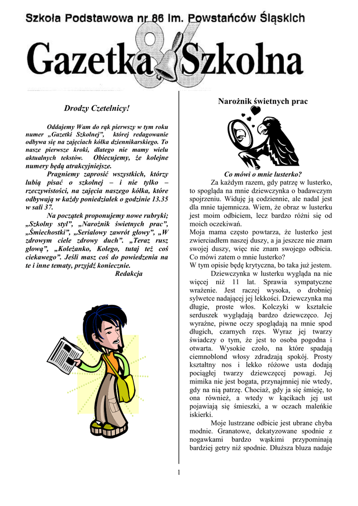 Narożnik świetnych prac Drodzy Czetelnicy! Oddajemy Wam do rąk pierwszy w tym roku numer „Gazetki Szkolnej”, której redagowanie odbywa się na zajęciach kółka dziennikarskiego. To nasze pierwsze kroki, dlatego nie mamy wielu aktualnych tekstów. Obiecujemy, że kolejne numery będą atrakcyjniejsze. Pragniemy zaprosić wszystkich, którzy lubią pisać o szkolnej – i nie tylko – rzeczywistości, na zajęcia naszego kółka, które odbywają w każdy poniedziałek o godzinie 13.35 w sali 37. Na początek proponujemy nowe rubryki; „Szkolny styl”, „Narożnik świetnych prac”, „Śmiechostki”, „Serialowy zawrót głowy”, „W zdrowym ciele zdrowy duch”. „Teraz rusz głową”, „Koleżanko, Kolego, tutaj też coś ciekawego”. Jeśli masz coś do powiedzenia na te i inne tematy, przyjdź koniecznie. Redakcja Co mówi o mnie lusterko? Za każdym razem, gdy patrzę w lusterko, to spogląda na mnie dziewczynka o badawczym spojrzeniu. Widuję ją codziennie, ale nadal jest dla mnie tajemnicza. Wiem, że obraz w lusterku jest moim odbiciem, lecz bardzo różni się od moich oczekiwań. Moja mama często powtarza, że lusterko jest zwierciadłem naszej duszy, a ja jeszcze nie znam swojej duszy, więc nie znam swojego odbicia. Co mówi zatem o mnie lusterko? W tym opisie będę krytyczna, bo taka już jestem. Dziewczynka w lusterku wygląda na nie więcej niż 11 lat. Sprawia sympatyczne wrażenie. Jest raczej wysoka, o drobniej sylwetce nadającej jej lekkości. Dziewczynka ma długie, proste włos. Kolczyki w kształcie serduszek wyglądają bardzo dziewczęco. Jej wyraźne, piwne oczy spoglądają na mnie spod długich, czarnych rzęs. Wyraz jej twarzy świadczy o tym, że jest to osoba pogodna i otwarta. Wysokie czoło, na które spadają ciemnoblond włosy zdradzają spokój. Prosty kształtny nos i lekko różowe usta dodają pociągłej twarzy dziewczęcej powagi. Jej mimika nie jest bogata, przynajmniej nie wtedy, gdy na nią patrzę. Chociaż, gdy ja się śmieję, to ona również, a wtedy w kącikach jej ust pojawiają się śmieszki, a w oczach maleńkie iskierki. Moje lustrzane odbicie jest ubrane chyba modnie. Granatowe, dekatyzowane spodnie z nogawkami bardzo wąskimi przypominają bardziej getry niż spodnie. Dłuższa bluza nadaje 1 odbiciu lekkości i sprawia, że postać wygląda na wyższą. Obraz mojej postaci w lusterku prezentuje się całkiem nieźle. Nawet go trochę polubiłam. Nadal się jednak zastanawiam, kiedy go zaakceptuję na tyle, abyśmy stały się jedną postacią. odbicie. Ukazywało się tylko wtedy, gdy to ja w nie patrzyłam. Pewnego dnia właśnie spoglądałam w lusterko, a ono nagle przemówiło. Najpierw szybko odeszłam, ale za chwilę niepewnym krokiem, pomału podchodziłam do magicznego szkła, a ono znowu przemówiło i zaczęło opowiadać. - Patrzę właśnie na młodą dziewczynę, która wygląda na uczennicę około 11 lat. Jest dziewczyną średniego wzrostu, o szczupłej sylwetce. Jej twarz jest owalna, nie ma grzywki, więc dokładnie widać czoło. Piękne szarozielone oczy, mały zgrabny nosek i wąskie usta idealnie pasują do długich blond włosów, najczęściej spiętych w kucyka. Małe przylegające uszy, wspaniale prezentują się w kolczykach, które często nosi. Lubi ubierać się wygodnie, dlatego najczęściej chodzi w leginsach, dżinsach, bluzkach z krótkim rękawkiem i trampkach. Czasami ubiera się elegancko w sukienkę i balerinki. Jej ubrania są kolorowe, ponieważ lubi się wyróżniać. Uważam, że jest ładną, zadbaną dziewczyną z dużym poczuciem humoru. Ma w sobie pełno entuzjazmu i uwielbia być w gronie najbliższych i swoich przyjaciół. Julia Kopeć, klasa Vb Patrycja Barć, klasa Vb Kiedy patrzę w lustro, widzę miłą, roześmianą dziewczynkę, która ma około jedenastu lat. Urody dodają jej okulary, które wyróżniają się wśród rówieśników. W dużym lustrze odbija się postać niezbyt wysokiej dziewczynki o nietypowych mocno zielonych oczach, które wyglądają jak u kota. Nawet są takie figlarne. Jasne, delikatne brwi mają identyczny kolor, co jej długie jasnobrązowe włosy. Jej mały nosek bardzo pasuje do delikatnej, drobnej twarzy, o perłowej cerze. Jednak najsubtelniejsze są czerwone usta, jakby namalowane przez artystę, malarza. Bardzo pasują do jej jasnej karnacji. Patrząc w lustro widać, że dziewczynka lubi luźny, sportowy styl. Jest ubrana w ciemne dżinsy lekko przecierane na kolanach. Do kompletu założyła bluzę w szerokie czarno- białe pasy. Jednak całość stroju rozświetla jasnoróżowe serduszka , które zostało jakby przylepione na bluzie tuż obok suwaka w tym samym kolorze. Całość wygląda bardzo modnie i młodzieżowo. Patrząc na tę dziewczynkę, śmiało mogę powiedzieć, że ma swój styl, że jest pogodna i wesoła. Takie dziewczyny widziałam w filmie „Camp Rock” i „Jessie”. Należą one do grona miłych, sympatycznych nastolatek, które mają szalone pomysły, lubią zabawę, a najbardziej cenią sobie grono przyjaciół wokół siebie! Julia Biernacik, klasa Vb Jak można wziąć los w swoje ręce? Utrata – nieutarta Pewnego dnia, gdy wracałam ze szkoły, zobaczyłam przy chodniku małego, burego kotka. Wyglądał na głodnego, postanowiłam więc go przygarnąć. Dałam mu na imię Burek i bardzo się do siebie przywiązaliśmy. Niestety nie na długo. Kilka dni później przyszła do mnie mama i powiedziała, że rozwiesiła w okolicy plakaty o znalezieniu kotka. Właśnie dzwoniła do niej jego prawdopodobna właścicielka! Na te słowa łzy napłynęły mi do oczu. Tak bardzo kochałam Kiedy byłam mała, przyjechał do nas wujek, dał nam w prezencie lusterko. Na początku zastanawiałam się, co to jest i kto w nim się znajduje. Okazało się, że to moje odbicie, ale nie takie zwykłe, to było magiczne 2 Burka! Żadna szkolna koleżanka nie umiałaby mi go zastąpić. ,,Nie oddam go!'',