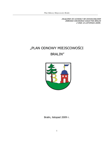 Plan Odnowy Miejscowości Bralin ZAŁĄCZNIK DO UCHWAŁY NR XXXVIII/206/2009 ZEBRANIA WIEJSKIEGO SOŁECTWA BRALIN Z DNIA 10 LISTOPADA 2009R. „PLAN ODNOWY MIEJSCOWOŚCI BRALIN” Bralin, listopad 2009 r. 1 Plan Odnowy Miejscowości Bralin SPIS TREŚCI I WSTĘP 3 II CHARAKTERYSTYKA MIEJSCOWOŚCI BRALIN 4 III INWENTARYZACJA ZASOBÓW SŁUŻĄCYCH ODNOWIE MIEJSCOWOŚCI 8 BRALIN IV ANALIZA SWOT- OCENA MOCNYCH I SŁABYCH STRON MIEJSCOWOŚCI 20 BRALIN V WIZJA BRALINA VI OPIS PLANOWANYCH 22 ZADAŃ W MIEJSCOWOŚCI BRALIN W 25 PERSPEKTYWIE CO NAJMNIEJ 7 LAT OD DNIA PRZYJĘCIA DOKUMENTU, W KOLEJNOŚCI WYNIKAJĄCEJ Z PRZYJĘTYCH PRIORYTETÓW ROZWOJU MIEJSCOWOŚCI, Z PODANIEM SZACUNKOWYCH KOSZTORYSÓW VII OPIS PLANOWANYCH ZADAŃ ZE WSKAZANIEM ICH WPŁYWU NA ROZWÓJ MIEJSCOWOŚCI Z UWZGLĘDNIENIEM ZGODNOŚCI 27 Z CHARAKTEREM I KRAJOBRAZEM KULTUROWYM BRALINA W LATACH 2007 – 2016 PROJEKT REALIZACYJNY. VIII HARMONOGRAM REALIZACJI 31 2 Plan Odnowy Miejscowości Bralin I. WSTĘP Proces odnowy wsi łączy się z przygotowaniem planu odnowy miejscowości. Podejmowanie racjonalnych decyzji dotyczących rozwoju miejscowości wymaga planowania strategicznego łączącego problematykę społeczną, ekologiczną gospodarczą i przestrzenną. Opracowana przez Radę Sołecką przy współpracy społeczności lokalnej i jej akceptacji, a następnie przyjęta do realizacji przez Radę Gminy, strategia rozwoju jest podstawowym dokumentem kierunkującym działalność sołectwa w perspektywie do roku 2013. Strategia jest fundamentem odnowy i oznacza spełnienie zasady programowania obowiązującej w polityce strukturalnej Unii Europejskiej. Członkowstwo Polski w Unii Europejskiej to olbrzymia szansa dla polskiej wsi i rolnictwa. Szybkie przemiany ekonomiczno-społeczne zachodzące w kraju wymagają odnowy wsi. Proces tej odnowy trwający nawet kilkanaście lat wymaga więc opracowania planu odnowy miejscowości. Zakresem niniejszego planu jest m.in.: - analiza zasobów miejscowości, - analiza korzystnych i niekorzystnych cech wewnętrznych miejscowości, oraz potencjalnych szans i zagrożeń występujących w otoczeniu, które mogą mieć wpływ na przyszłość miejscowości i mieszkańców, - wizja rozwoju miejscowości, - priorytety rozwojowe, cele i projekty. - opis planowanych zadań w perspektywie 7 lat tj. w okresie 2007-2016 wraz z harmonogramem realizacji oraz kosztorysami szacunkowymi poszczególnych przedsięwzięć. Niniejsze opracowanie powstało na podstawie warsztatów odnowy wsi, w których uczestniczyli przedstawiciele społeczności lokalnej sołectwa (czerwiec 2007) oraz zebrania wiejskiego poświęconemu rozwojowi miejscowości Bralin. 3 Plan Odnowy Miejscowości Bralin II. CHARAKTERYSTYKA MIEJSCOWOŚCI BRALIN Krótka charakterystyka miejscowości Bralin leży w południowej części województwa wielkopolskiego, w powiecie kępińskim. Jest siedziba Gminy Bralin, która, od północy graniczy z gminą Kobyla Góra, od wschodu z gminą Kępno i Baranów, od południa z gminą Rychtal, od południowego zachodu z gminą Perzów. Przez Bralin przebiega droga nr 8, jednocześnie droga międzynarodowa E-67 Warszawa-Piotrków Trybunalski - Kępno – Oleśnica – Wrocław – Kłodzko - Kudowa (przejście graniczne do Czech), przebiega w kierunku północ-południe przez środek gminy Bralin. Ogólna informacja o MIEJSCOWOŚCI WIEŚ - BRALIN GMINA - BRALIN POWIAT - KĘPIŃSKI WOJEWÓDZTWO - WIELKOPOLSKIE LICZBA MIESZKAŃCÓW - 2719 (31.12.2007 r.) POWIERZCHNIA BRALINA - 11,09 km2 SOŁTYS – Józef Chałupka RADA SOŁECKA –Jerzy Bzymek, Zenon Gołąbek, Józef Heising, Marek Pietr, Stanisław Siemański, Łukasz Piotrowiak Zadanie sołectwa Bralin Podstawowym celem utworzenia i działania sołectwa jest zapewnienie jego mieszkańcom udziału w realizacji zadań Gminy przez: 1/ opiniowanie rozstrzygnięć organów Gminy w sprawach dotyczących : a/ studium uwarunkowań oraz zmiany planu zagospodarowania przestrzennego Gminy dotyczących Sołectwa, b/ uchwalanych przez Radę Sołectwa, 4 programów gospodarczych dotyczących Plan Odnowy Miejscowości Bralin 2/ inicjowanie działalności kulturalno – oświatowej, sportowo – rekreacyjnej oraz podtrzymywanie tradycji lokalnych, 3/ zarządzanie przekazanym Sołectwu mieniem komunalnym Warunki geograficzne Sołectwo Bralin administracyjnie należy do gminy Bralin, powiatu kępińskiego, województwa wielkopolskiego. Położone jest prawie w centralnej części gminy. Ogólna powierzchnia to 1108,90 ha. Lokalizacja Gminy Bralin na terenie kraju i województwa wielkopolskiego 5 Plan Odnowy Miejscowości Bralin Lokalizacja Gminy Bralin na tle województwa wielkopolskiego 6 Plan Odnowy Miejscowości Bralin Lokalizacja sołectwa Bralin na terenie Gminy Bralin 7 Plan Odnowy Miejscowości Bralin III. INWENTARYZACJA ZASOBÓW SŁUŻĄCA ODNOWIE MIEJSCOWOŚCI BRALIN Środowisko przyrodnicze Obszar miejscowości Bralin położony jest na południowej rubieży Niziny Wielkopolskiej, w makroregionie Niziny Południowo-Wielkopolskiej, obejmuje południową i centralną część wzniesionej na 170-200 m n.p.m. Wysoczyzny Bolesławieckiej oraz północno-zachodni skrawek Wzgórz Ostrzeszowskich. Pomniki przyrody Rejestr pomników przyrody miejscowości Bralin zawiera 2 pozycje i obejmuje: • 7 dębów szypułkowych /Quercus robur L./ – (nr rejestru 140), „Dęby Bralińskie” których wiek ocenia się na 600 – 800 lat, o obwodzie pierśnicy 410 - 628 cm, zlokalizowane przy leśniczówce na zachodnim skraju miejscowości Bralin; • dąb piramidalny /Quercus rubra./ – (nr rejestru 620) o obwodzie pierśnicy 380 cm, rosnący przy pamiątkowym obelisku w m. Bralin. Bralin słynie z "Dębów Bralińskich", których wiek szacuje siłę na 600-800 lat. Niedaleko Pólka jest też zbiornik wodny Brodzisko, połączony drogą polną z Pólkiem i Nosalami. Rys historyczny Źródła historyczne podają, że na stoku Wzgórz Ostrzeszowskich w "miasteczku przy śląskie