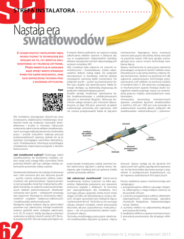 Strefa Instalatora Nastała era światłowodów Z czasem wszyscy instalatorzy będą musieli poznać tę technologię bez względu na to, czy montują sieci, monitoring czy telewizję użytkową. Przed inwestycją w szkolenia bądź sprzęt warto sprawdzić rynek pod kątem możliwości, jakie daje współczesna technika prac z włóknami optycznymi. Dipol 8 stopni). Warto nadmienić, że często to rodzaj zakończenia włókien stanowi o doborze złączy w urządzeniach. Odpowiednie interfejsy dobiera się poprzez montaż odpowiadających wtykom modułów SFP. Aby instalacja była odporna na warunki atmosferyczne i środowiskowe, trzeba odpowiednio dobrać rodzaj kabla. Do połączeń zewnętrznych w kanalizacji wtórnej idealne rozwiązanie stanowią kable uniwersalne. Do połączeń punkt – punkt są przeznaczone kable typu duplex lub dystrybucyjne. Kable łatwego dostępu są doskonałą propozycją do połączeń międzykondygnacyjnych. Zwykle istnieje możliwość zamówienia kabla światłowodowego z prefabrykowanymi złączami o dowolnej długości. Wówczas tłumienie całego zestawu jest mierzone laboratoryjnie, co daje 100-proc. pewność, że jakość wykonanego przewodu jest najwyższa. Jeśli nie można przeprowadzić kabla ze złączami mechaniczne. Największy koszt inwestycji stanowi precyzyjna obcinarka, której cena jest na poziomie nawet 1/40 ceny sprzętu wymaganego przy użyciu innych technologii zarabiania złączy. Spawy mechaniczne to precyzyjne elementy pozwalające na łączenie dwóch włókien światłowodowych o tej samej średnicy rdzenia. Niską tłumienność, średnio na poziomie 0,15 dB, zapewnia zaawansowana technologia pozycjonowania czół włókien za pomocą rowków w kształcie litery V. Żel optyczny występujący w mechanicznym spawie niweluje skutki wystąpienia nieprecyzyjnego cięcia czy ewentualnej przerwy między wprowadzonymi światłowodami. Uniwersalna konstrukcja mechanicznych spawów umożliwia łączenie światłowodów o średnicy 250 μm i 900 μm oraz pozwala na wykonywanie wysokiej jakości połączeń dla światłowodów wielomodowych i jednomo- przez kanały instalacyjne, należy zamówić kabel zakończony złączami z jednej strony. Następnie, gdy instalacja jest już gotowa, trzeba zarobić pozostałe włókna. dowych. Spawy nadają się do łączenia linii optycznych tam, gdzie są połączenia spawane, np. do łączenia kabla dystrybucyjnego z pigtailami w przełącznicach budynkowych czy do naprawy uszkodzonych linii optycznych. Dla instalatora pracującego dotychczas przy instalowaniu okablowania miedzianego światłowód może się wydawać niezwykle skomplikowany i trudny w montażu. Faktycznie wykonanie zakończenia włókien światłowodowych wymaga większej sterylności środowiska pracy i przede wszystkim większej precyzji przeprowadzanych operacji, jednak nie są to operacje wymagające warunków laboratoryjnych. Przedstawiamy informacje przybliżające instalatorowi rozpoczęcie przygody z sieciami fotonicznymi. Jaki światłowód wybrać? Dobierając kabel światłowodowy do konkretnej instalacji, należy wziąć pod uwagę kilka czynników, które pozwolą określić, jaki typ i jakiego rodzaju zakończenie przewodu należy wybrać. Światłowód dobieramy do rodzaju budowanej sieci. Jeśli tworzona jest sieć aktywna (punkt – punkt), można wykorzystać włókna wielomodowe lub jednomodowe. Ograniczeniem w tym przypadku może być maksymalna odległość transmisji, co wpłynie wykorzystanie lepszych włókien jednomodowych. Możliwość tworzenia sieci punkt – wielopunkt stwarzają sieci pasywne. Wymaga to stosowania odpowiednich urządzeń nadawczo-odbiorczych i światłowodów jednomodowych. Następnie należy wskazać złącza, jakimi kabel powinien być zakończony. Istnieje możliwość wyboru spośród wielu rodzajów zakończeń, m.in. SC, FC oraz LC. Każdy typ złącza może być wykonany w jednej z dwóch wersji: UPC (ferrula prosta) lub APC (ferrula ścięta pod kątem ok. Jak zakończyć światłowód? Zakończenie światłowodu można wykonać na kilka sposobów. Najbardziej popularne jest spawanie termiczne pigtaila z włóknem. Ta technika jest najwygodniejsza dla instalatora, lecz wymaga zakupu spawarki, której koszt może sięgać od kilku do kilkudziesięciu tysięcy złotych. Drugim sposobem jest wklejanie złączy i polerowanie ferruli. Technika ta nie wymaga zakupu drogich narzędzi, nawet precyzyjnej obcinarki, ale jest czasochłonna i mało precyzyjna – nie ma powtarzalności jakości wykonywanych złączy. Techniką umożliwiającą precyzyjne zakańczanie światłowodów złączami są spawy i złącza Proces zarabiania spawu mechanicznego jest następujący: 1. przygotowujemy włókno: używając strippera, zdejmujemy z niego kolejne warstwy aż do powłoki 250 μm, 2. czyścimy przygotowane włókno alkoholem izopropylowym, wykorzystując specjalne chusteczki bezpyłowe, niepozostawiające smug i śladów, 3. ucinamy włókno na odpowiednią długość precyzyjną obcinarką, 4. zarabiamy włókno w spawie mechanicznym, 5. procedurę powtarzamy dla drugiego włókna. systemy alarmowe nr 2, marzec – kwiecień 2013 Dla wprawnego instalatora całkowity czas wykonania spawu to kilkadziesiąt sekund. Dobrze wykonany spaw zapewnia tłumienie na poziomie spawu termicznego. Spaw jest zbudowany z obudowy, kryjącej element służący do pozycjonowania włókna. Są w nim wykonane otwory o średnicy nieco większej niż wpro- Spaw mechaniczny KeyQuick wadzane włókno. Otwory te są wypełnione żelem optycznym kompensującym niedoskonałości ucięcia włókien oraz niedokładne ich położenie. Nieco łatwiejszy montaż spawów i wizualną kontrolę nad tłumieniem złącza zapewniają spawy KeyQuick, wykorzystujące przezroczysty korpus. Podczas montażu spawu mechanicznego należy podłączyć wizualny lokalizator uszkodzeń (np. za pomocą pigtaila), dzięki czemu instalator