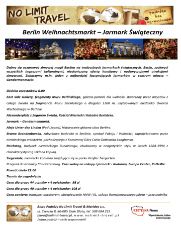 Berlin Weihnachtsmarkt – Jarmark Świąteczny Dajmy się oczarować zimowej magii Berlina na tradycyjnych jarmarkach świątecznych. Berlin, zachwyci wszystkich imprezami kulturalnymi, nieskończoną ofertą handlową i nadzwyczajnymi atrakcjami zimowymi. Zobaczymy m.in. jeden z najbardziej fascynujących jarmarków w centrum miasta – Gendarmenmarkt. Zbiórka uczestników 6.00 East Side Gallery, fragmenty Muru Berlińskiego, galeria-pomnik dla wolności stworzony przez artystów z całego świata na fragmencie Muru Berlińskiego o długości 1300 m, usytuowanym niedaleko Dworca Wschodniego w Berlinie. Alexanderplatz z Zegarem Świata, Kościół Mariacki i Katedra Berlińska. Jarmark – Gendarmenmarkt. Aleja Unter den Linden (Pod Lipami), historycznie główna ulica Berlina. Brama Brandenburska, zabytkowa budowla w Berlinie, symbol Pokoju i Wolności, zaprojektowana przez niemieckiego architekta, pochodzącego z Kamiennej Góry Carla Gottharda Langhansa. Reichstag, budynek niemieckiego Bundestagu, zbudowany w neogotyckim stylu w latach 1884-1994 z charakterystyczną szklana kopułą. Siegesäule, niemiecka kolumna znajdująca się w parku Großer Tiergarten. Przejazd do dzielnicy Charlottenburg. Czas wolny na zakupy i jarmarki - Kudamm, Europa Center, KaDeWe. Powrót około 22.00 Termin do uzgodnienia Cena dla grupy 44 uczniów + 4 opiekunów: 98 zł Cena dla grupy 40 uczniów + 4 opiekunów: 108 zł Cena zawiera: transport autokarem, ubezpieczenie NNW i KL, usługa licencjonowanego pilota – przewodnika Biuro Podróży No Limit Travel & Marideo s.c. ul. Czerska 8, 86-005 Białe Błota, tel. 509 684 222 [email protected], w w w . n o l i m i t - t r a v e l . p l Jedna podróż – setki wspomnień!