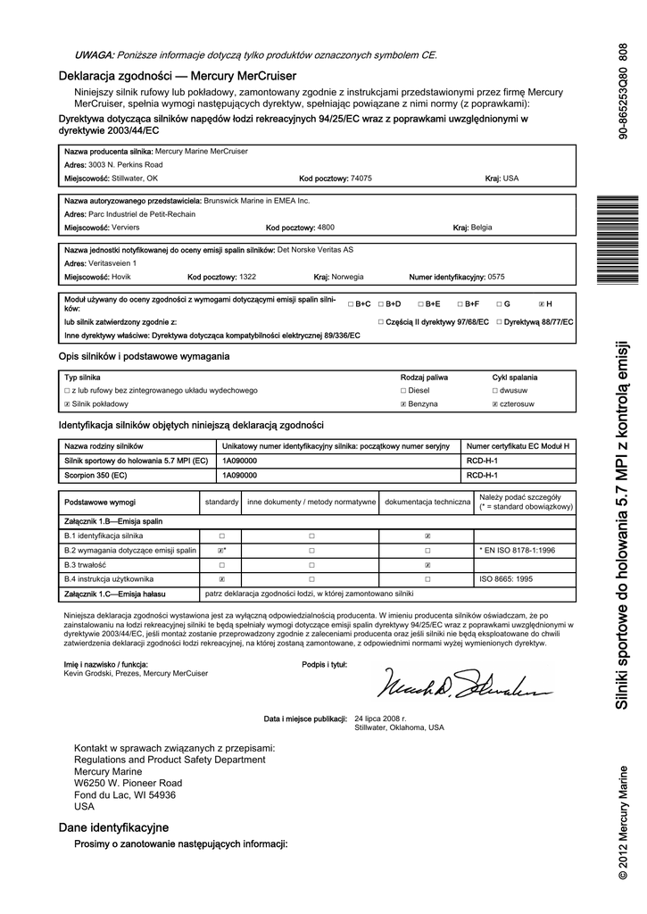 Deklaracja zgodności — Mercury MerCruiser Niniejszy silnik rufowy lub pokładowy, zamontowany zgodnie z instrukcjami przedstawionymi przez firmę Mercury MerCruiser, spełnia wymogi następujących dyrektyw, spełniając powiązane z nimi normy (z poprawkami): Dyrektywa dotycząca silników napędów łodzi rekreacyjnych 94/25/EC wraz z poprawkami uwzględnionymi w dyrektywie 2003/44/EC 90-865253Q80 808 UWAGA: Poniższe informacje dotyczą tylko produktów oznaczonych symbolem CE. Nazwa producenta silnika: Mercury Marine MerCruiser Adres: 3003 N. Perkins Road Miejscowość: Stillwater, OK Kod pocztowy: 74075 Kraj: USA *865253Q80* Nazwa autoryzowanego przedstawiciela: Brunswick Marine in EMEA Inc. Adres: Parc Industriel de Petit-Rechain Miejscowość: Verviers Kod pocztowy: 4800 Kraj: Belgia Nazwa jednostki notyfikowanej do oceny emisji spalin silników: Det Norske Veritas AS Adres: Veritasveien 1 Miejscowość: Hovik Kod pocztowy: 1322 Kraj: Norwegia Moduł używany do oceny zgodności z wymogami dotyczącymi emisji spalin silni‐ ków: Numer identyfikacyjny: 0575 ☐ B+C ☐ B+D lub silnik zatwierdzony zgodnie z: ☐ B+E ☐ B+F ☐G ☒H ☐ Częścią II dyrektywy 97/68/EC ☐ Dyrektywą 88/77/EC Opis silników i podstawowe wymagania Typ silnika Rodzaj paliwa Cykl spalania ☐ z lub rufowy bez zintegrowanego układu wydechowego ☐ Diesel ☐ dwusuw ☒ Silnik pokładowy ☒ Benzyna ☒ czterosuw Identyfikacja silników objętych niniejszą deklaracją zgodności Nazwa rodziny silników Unikatowy numer identyfikacyjny silnika: początkowy numer seryjny Numer certyfikatu EC Moduł H Silnik sportowy do holowania 5.7 MPI (EC) 1A090000 RCD-H-1 Scorpion 350 (EC) 1A090000 RCD-H-1 Podstawowe wymogi standardy inne dokumenty / metody normatywne dokumentacja techniczna B.1 identyfikacja silnika ☐ ☐ ☒ B.2 wymagania dotyczące emisji spalin ☒* ☐ ☐ B.3 trwałość ☐ ☐ ☒ ☒ ☐ ☐ Należy podać szczegóły (* = standard obowiązkowy) Załącznik 1.B—Emisja spalin B.4 instrukcja użytkownika Załącznik 1.C—Emisja hałasu * EN ISO 8178-1:1996 ISO 8665: 1995 patrz deklaracja zgodności łodzi, w której zamontowano silniki Niniejsza deklaracja zgodności wystawiona jest za wyłączną odpowiedzialnością producenta. W imieniu producenta silników oświadczam, że po zainstalowaniu na łodzi rekreacyjnej silniki te będą spełniały wymogi dotyczące emisji spalin dyrektywy 94/25/EC wraz z poprawkami uwzględnionymi w dyrektywie 2003/44/EC, jeśli montaż zostanie przeprowadzony zgodnie z zaleceniami producenta oraz jeśli silniki nie będą eksploatowane do chwili zatwierdzenia deklaracji zgodności łodzi rekreacyjnej, na której zostaną zamontowane, z odpowiednimi normami wyżej wymienionych dyrektyw. Imię i nazwisko / funkcja: Kevin Grodski, Prezes, Mercury MerCuiser Podpis i tytuł: Silniki sportowe do holowania 5.7 MPI z kontrolą emisji Inne dyrektywy właściwe: Dyrektywa dotycząca kompatybilności elektrycznej 89/336/EC Kontakt w sprawach związanych z przepisami: Regulations and Product Safety Department Mercury Marine W6250 W. Pioneer Road Fond du Lac, WI 54936 USA Dane identyfikacyjne Prosimy o zanotowanie następujących informacji: © 2012 Mercury Marine Data i miejsce publikacji: 24 lipca 2008 r. Stillwater, Oklahoma, USA Model silnika i moc w KM Numer seryjny silnika Numer seryjny zespołu pawęży (napęd rufowy) Przełożenie Numer seryjny zespołu napędu rufowego Model przekładni (napęd pokładowy) Przełożenie Numer seryjny przekładni Numer śruby napędowej Skok Średnica Numer identyfikacyjny kadłuba (HIN) Data zakupu Producent łodzi Model łodzi Długość Numery seryjne są kluczami producenta, które zawierają informacje o szczegółach konstrukcyjnych jednostki napędowej Mercury MerCruiser®. W przypadku kontaktowania się z autoryzowanym sprzedawcą Mercury MerCruiser w sprawie serwisu, zawsze należy podać model i numer seryjny silnika. Opisy i dane techniczne zamieszczone w niniejszej instrukcji były aktualne na dzień zatwierdzenia jej do druku. Firma Mercury Marine, która kieruje się polityką stałego udoskonalania produktów, zastrzega sobie prawo do wycofywania modeli produktów w dowolnym momencie, do zmiany danych technicznych lub konstrukcji bez uprzedniego powiadomienia, zaś zmiany takie nie wiążą się z podejmowaniem przez nią dodatkowych zobowiązań. Mercury Marine, Fond du Lac, Wisconsin, USA Wydrukowano w USA © 2008, Mercury Marine Mercury, Mercury Marine, MerCruiser, Mercury MerCruiser, Mercury Racing, Mercury Precision Parts, Mercury Propellers, Mariner, Quicksilver, #1 On The Water, Alpha, Bravo, Bravo Two, Pro Max, OptiMax, Sport-Jet, K-Planes, MerCathode, RideGuide, SmartCraft, Zero Effort, VesselView, Zeus, Axius, Total Command, logo M with Waves, logo Mercury with Waves oraz logo SmartCraft są znakami handlowymi lub zarejestrowanymi znakami handlowymi firmy Brunswick Corporation. Logo Mercury Product Protection jest zarejestrowanym znakiem firmy Brunswick Corporation. Witamy Wybrali Państwo jeden z najlepszych dostępnych morskich zespołów napędowych. Zawiera on szereg rozwiązań projektowych, które zapewniają łatwość obsługi i trwałość. Odpowiednia troska i konserwacja pozwoli cieszyć się produktem przez wiele sezonów żeglarskich. W celu zapewnienia maksymalnych osiągów i bezproblemowego użytkowania prosimy o dokładne zapoznanie się z niniejszą instrukcją. Instrukcja obsługi, konserwacji i gwarancji zawiera szczegółowe instrukcje odnośnie eksploatacji i konserwacji produktu. Zalecamy, aby niniejsza instrukcja była dostępna czas i służyła jako pomoc w czasie przebywania na wodzie. Dziękujemy za zakup jednego z produktów firmy Mercury MerCruiser. Mamy nadzieję, że pływanie będzie dla Państwa przyjemnością! Mercury MerCruiser Informacja o gwarancji Firma Mercury Marine udziela na zakupiony produkt gwarancji ograniczonej, której warunki przedstawiono w osobny