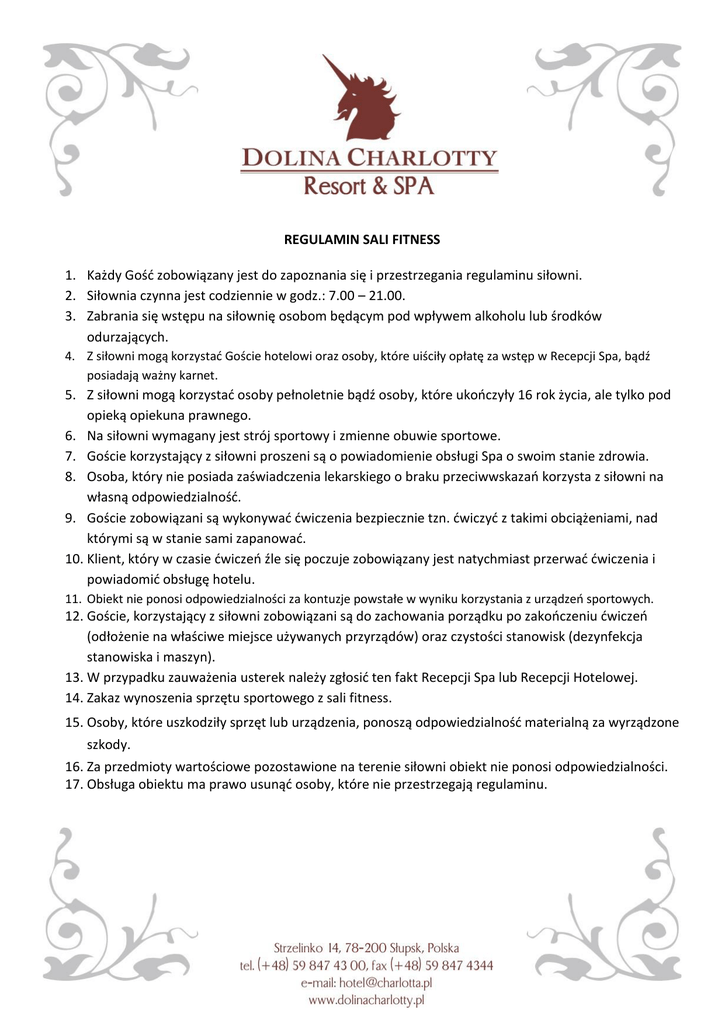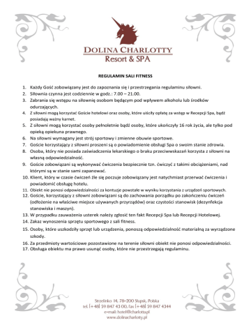 REGULAMIN SALI FITNESS 1. Każdy Gość zobowiązany jest do zapoznania się i przestrzegania regulaminu siłowni. 2. Siłownia czynna jest codziennie w godz.: 7.00 – 21.00. 3. Zabrania się wstępu na siłownię osobom będącym pod wpływem alkoholu lub środków odurzających. 4. Z siłowni mogą korzystać Goście hotelowi oraz osoby, które uiściły opłatę za wstęp w Recepcji Spa, bądź posiadają ważny karnet. 5. Z siłowni mogą korzystać osoby pełnoletnie bądź osoby, które ukończyły 16 rok życia, ale tylko pod opieką opiekuna prawnego. 6. Na siłowni wymagany jest strój sportowy i zmienne obuwie sportowe. 7. Goście korzystający z siłowni proszeni są o powiadomienie obsługi Spa o swoim stanie zdrowia. 8. Osoba, który nie posiada zaświadczenia lekarskiego o braku przeciwwskazań korzysta z siłowni na własną odpowiedzialność. 9. Goście zobowiązani są wykonywać ćwiczenia bezpiecznie tzn. ćwiczyć z takimi obciążeniami, nad którymi są w stanie sami zapanować. 10. Klient, który w czasie ćwiczeń źle się poczuje zobowiązany jest natychmiast przerwać ćwiczenia i powiadomić obsługę hotelu. 11. Obiekt nie ponosi odpowiedzialności za kontuzje powstałe w wyniku korzystania z urządzeń sportowych. 12. Goście, korzystający z siłowni zobowiązani są do zachowania porządku po zakończeniu ćwiczeń (odłożenie na właściwe miejsce używanych przyrządów) oraz czystości stanowisk (dezynfekcja stanowiska i maszyn). 13. W przypadku zauważenia usterek należy zgłosić ten fakt Recepcji Spa lub Recepcji Hotelowej. 14. Zakaz wynoszenia sprzętu sportowego z sali fitness. 15. Osoby, które uszkodziły sprzęt lub urządzenia, ponoszą odpowiedzialność materialną za wyrządzone szkody. 16. Za przedmioty wartościowe pozostawione na terenie siłowni obiekt nie ponosi odpowiedzialności. 17. Obsługa obiektu ma prawo usunąć osoby, które nie przestrzegają regulaminu.