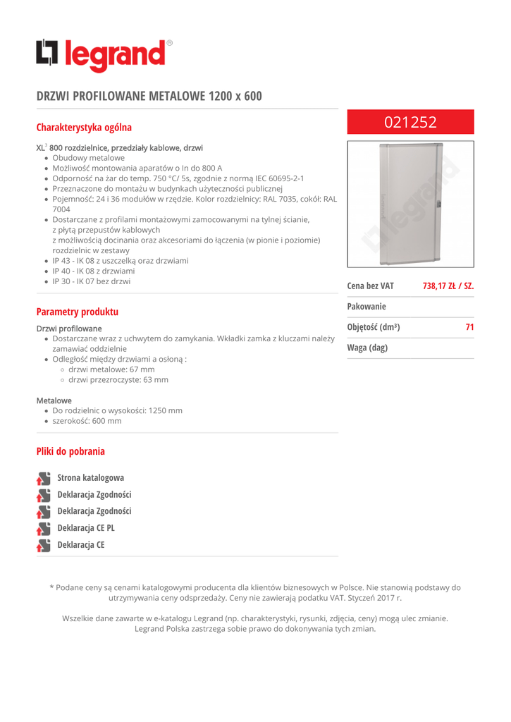 DRZWI PROFILOWANE METALOWE 1200 x 600 Charakterystyka ogólna XL3 800 rozdzielnice, przedziały kablowe, drzwi Obudowy metalowe Możliwość montowania aparatów o In do 800 A Odporność na żar do temp. 750 °C/ 5s, zgodnie z normą IEC 60695-2-1 Przeznaczone do montażu w budynkach użyteczności publicznej Pojemność: 24 i 36 modułów w rzędzie. Kolor rozdzielnicy: RAL 7035, cokół: RAL 7004 Dostarczane z profilami montażowymi zamocowanymi na tylnej ścianie, z płytą przepustów kablowych z możliwością docinania oraz akcesoriami do łączenia (w pionie i poziomie) rozdzielnic w zestawy IP 43 - IK 08 z uszczelką oraz drzwiami IP 40 - IK 08 z drzwiami IP 30 - IK 07 bez drzwi Parametry produktu Drzwi profilowane Dostarczane wraz z uchwytem do zamykania. Wkładki zamka z kluczami należy zamawiać oddzielnie Odległość między drzwiami a osłoną : drzwi metalowe: 67 mm drzwi przezroczyste: 63 mm 021252 Cena bez VAT 738,17 ZŁ / SZ. Pakowanie Objętość (dm³) Waga (dag) Metalowe Do rodzielnic o wysokości: 1250 mm szerokość: 600 mm Pliki do pobrania Strona katalogowa Deklaracja Zgodności Deklaracja Zgodności Deklaracja CE PL Deklaracja CE * Podane ceny są cenami katalogowymi producenta dla klientów biznesowych w Polsce. Nie stanowią podstawy do utrzymywania ceny odsprzedaży. Ceny nie zawierają podatku VAT. Styczeń 2017 r. Wszelkie dane zawarte w e-katalogu Legrand (np. charakterystyki, rysunki, zdjęcia, ceny) mogą ulec zmianie. Legrand Polska zastrzega sobie prawo do dokonywania tych zmian. 71