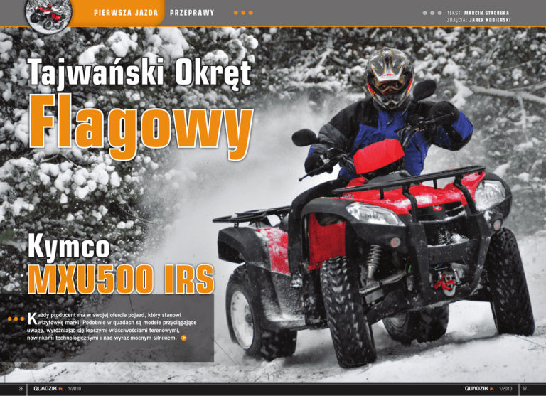 PIERWSZA JAZDA PRZEPRAWY T E K S T: M A R C I N S T A C H U R A ZDJĘCIA: JAREK KOBIERSKI Tajwański Okręt Flagowy Kymco MXU500 IRS K ażdy producent ma w swojej ofercie pojazd, który stanowi wizytówkę marki. Podobnie w quadach są modele przyciągające uwagę, wyróżniając się lepszymi właściwościami terenowymi, nowinkami technologicznymi i nad wyraz mocnym silnikiem. 36 QUADZIK.pl 1/2010 QUADZIK.pl 1/2010 37 PIERWSZA JAZDA PRZEPRAWY Troszeczkę inaczej jest w Kymco. Tu na miarę flagowego modelu zasługują pojazdy z silnikiem 500 ccm, z mocą niewiele ponad 35 KM i pełnym dostosowaniem pojazdu do ruchu publicznego. Kymco w swojej ofercie stawia mniej na rajdy czy wyścigi, a więcej na szerokie możliwości wykorzystania pojazdu w życiu prywatnym. Być może, dlatego, że wielkim gronem odbiorców tych pojazdów są wypożyczalnie, donosiciele pizzy czy zwykli śmiertelnicy, którzy potrzebują rejestracji do użytku własnego. 38 MXU500 w Polsce Z tym modelem mamy już do czynienia, od co najmniej 4 lat. Kiedy weszła do sprzedaży pięćsetka była ona przepaścią w stosunku do MXU300. Większy, mocniejszy, bardziej dostojny i miał napęd na 4 koła. Pierwsze MXU500 różnią się zasadniczo dwiema rzeczami od obecnych z IRS. To właśnie niezależne zawieszenie z tyłu spowodowało, że MXU stał się wreszcie przyjaznym quadem w długich podróżach. U poprzednika ośka zawieszona na dwóch amortyzatorach dawała pozorną stabilność w zakręcie, zmniejszała za to na pewno komfort jazdy po nierównościach. Model z IRS przyzwoicie trzyma w nawrotach, a przede wszystkim pozwala wygodnie podróżować. nim po kilku godzinach jazdy jest prawie niemożliwe. Wynika to z tego, że starszy model posiadał przy załączonym przodzie częściową, procentową blokadę mostu, co niewątpliwie wpływało na ciężar pracy kierownicy. Obecny testowany przez nas MXU500 IRS posiada oddzielny przycisk do blokowania mechanizmu różnicowego w przednim napędzie, który blokuje oś na stałe. Komfort jazdy i „z tyłu”, i „z przodu” został niewątpliwie poprawiony. Reszta różnic, to marketingowe detale. Przedni most Ci, którzy użytkują MXU500 wiedzą, że jazda starszym modelem z załączonym przednim mostem to prawie tortura. Quad jest ciężki, w terenie daje sobie radę, jak na takiego quada przystało, ale skręcanie Wygląd Kymco MXU500 IRS nie różni się wyglądem od poprzednika. Ciągle jest to masywny czterokołowiec przyciągający nas swoim urokiem niwelującym toporność. Duże, raczej twarde plastiki, nie są po- QUADZIK.pl 1/2010 datne na pęknięcia z byle jakiego powodu. Wielkie przednie reflektory spełniają wszystkie wymogi homologacyjne, do tego są naprawdę ładne. Tylne, zintegrowane z kierunkowskazami lampy, także nie ustępują swym wdziękiem i są widoczne z daleka. Szerokie podłogi, kanapa oraz wysoko usadowiona kierownica pozwala na wygodną jazdę, także z pasażerem. Błotniki wręcz wzorowo chronią jeźdźca przed chlapaniem. Całość wizerunku moim zdaniem psuje tylko jeden detal. Zbyt małe koła w stosunku do gabarytów pojazdu i miejsca pod błotnikami. Stosując większy profil opony, uzyskamy z MXU500 „designerskiego” potwora. Nasza testówka nie była wyposażona w dźwignię ssania. Jako nowszy model posiadała ssanie automatyczne. Wahacze T E K S T: M A R C I N S T A C H U R A ZDJĘCIA: JAREK KOBIERSKI Pomimo niezależnego zawieszenia prześwit MXU 500 IRS o wiele się nie zwiększył. Quad jest za to bardziej komfortowy. Jak przystało na typowy pojazd turystyczno-przeprawowy Kymco jest standardowo wyposażony w blokadę kierownicy. Z przodu mamy solidnie osłonięte wahacze i półosie oraz jednotłoczkowe zaciski hamulcowe osadzone wewnątrz felgi. Spora puszka airbox’a oraz akumulator i elektronika nie pozwoliły na zachowanie schowka pod dużą kanapą pojazdu. Duże podesty dzięki metalowej stopce i plastikowej perforacji prawidłowo utrzymują buta ridera w trakcie jazdy. Pakiet homologacyjny w pojazdach Kymco to istny majstersztyk. Tak jest również w przypadku MXU 500 IRS. z tyłu, podobnie jak w MXU400 sprawiają wrażenie mocnej konstrukcji. Całość IRS wygląda naprawdę imponująco. Martwił mnie jednak zbyt mały prześwit w tylnej części pojazdu, nawet nieobciążonego w trakcie postoju. Licznik standardowo w Kymco w plastikowej oddzielnej obudowie w kolorze nadwozia. Po lewej stronie mamy gniazdo prądowe dla GPS’a czy dodatkowej lampy. Centralnie usytuowany na kokpicie kluczyk po przekręceniu w pierwszym położeniu włącza zapłon, a w kolejnym uruchamia światła pozycyjne. Quada odpalamy palcem wskazującym lewej ręki. Licznik pokazuje nam cyfrowo prędkość, przebieg dzienny i całkowity oraz godzinę. Mamy dwa przyciski SET i MODE służące do ustawiania zegarka i parametrów licznika. Dodatkowo kontrolki wszystkich biegów oraz temperatury silnika, kierunkowskazów i świateł drogowych. Pojazd jest wyposażony w bieg parkingowy i pełen pakiet homologacyjny. Prawa ręka obsługuje gaz i przedni napęd z blokadą. Do tej pory włącznik przedniego napędu zawsze przypominał konstrukcję z innych marek. Teraz mamy całkowicie nowy, oryginalnie zaprojektowany element. Kciuk wciska przycisk załączający przedni napęd, o czym informuje nas dźwięk elektrycznego silnika przy moście oraz kontrolka na liczniku. Po przesunięciu obrotowego przełącznika słyszymy kolejny dźwięk i widzimy na wyświetlaczu komunikat zablokowanego mostu. Design W MXU500 IRS widać wpływ wielu czynników na jego wygląd. Kilka elementów zaczerpniętych z samochodów, kilka z quadów, pozwoliło na wypracowanie przyciągającej oko bryły, która także wpływa na decyzję odnośnie zakupu pojazdu. Quad przy tym jest także funkcjonalny. Detale W MXU500 IRS mamy zastosowany „amerykański” system podpinania zaczepu. Aby zamocować kulę haka musimy najpierw podpiąć ramię dostosowujące mocowa