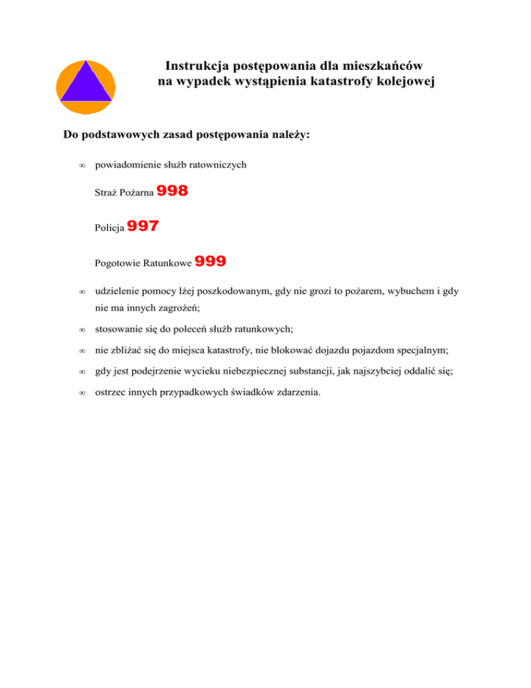 Instrukcja postępowania dla mieszkańców na wypadek wystąpienia katastrofy kolejowej Do podstawowych zasad postępowania naleŜy: • powiadomienie słuŜb ratowniczych StraŜ PoŜarna 998 Policja 997 Pogotowie Ratunkowe 999 • udzielenie pomocy lŜej poszkodowanym, gdy nie grozi to poŜarem, wybuchem i gdy nie ma innych zagroŜeń; • stosowanie się do poleceń słuŜb ratunkowych; • nie zbliŜać się do miejsca katastrofy, nie blokować dojazdu pojazdom specjalnym; • gdy jest podejrzenie wycieku niebezpiecznej substancji, jak najszybciej oddalić się; • ostrzec innych przypadkowych świadków zdarzenia.