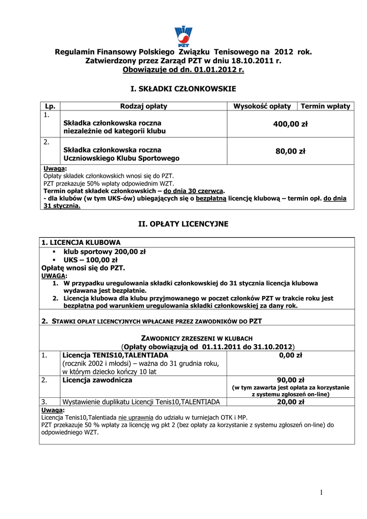 Regulamin Finansowy Polskiego Związku Tenisowego na 2012