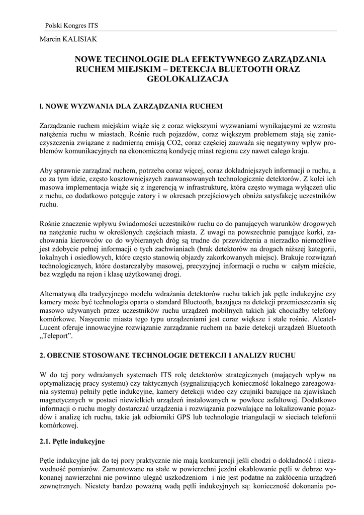 Polski Kongres ITS Marcin KALISIAK NOWE TECHNOLOGIE DLA EFEKTYWNEGO ZARZĄDZANIA RUCHEM MIEJSKIM – DETEKCJA BLUETOOTH ORAZ GEOLOKALIZACJA l. NOWE WYZWANIA DLA ZARZĄDZANIA RUCHEM Zarządzanie ruchem miejskim wiąże się z coraz większymi wyzwaniami wynikającymi ze wzrostu natężenia ruchu w miastach. Rośnie ruch pojazdów, coraz większym problemem stają się zanieczyszczenia związane z nadmierną emisją CO2, coraz częściej zauważa się negatywny wpływ problemów komunikacyjnych na ekonomiczną kondycję miast regionu czy nawet całego kraju. Aby sprawnie zarządzać ruchem, potrzeba coraz więcej, coraz dokładniejszych informacji o ruchu, a co za tym idzie, często kosztowniejszych zaawansowanych technologicznie detektorów. Z kolei ich masowa implementacja wiąże się z ingerencją w infrastrukturę, która często wymaga wyłączeń ulic z ruchu, co dodatkowo potęguje zatory i w okresach przejściowych obniża satysfakcję uczestników ruchu. Rośnie znaczenie wpływu świadomości uczestników ruchu co do panujących warunków drogowych na natężenie ruchu w określonych częściach miasta. Z uwagi na powszechnie panujące korki, zachowania kierowców co do wybieranych dróg są trudne do przewidzenia a nierzadko niemożliwe jest zdobycie pełnej informacji o tych zachwianiach (brak detektorów na drogach niższej kategorii, lokalnych i osiedlowych, które często stanowią objazdy zakorkowanych miejsc). Brakuje rozwiązań technologicznych, które dostarczałyby masowej, precyzyjnej informacji o ruchu w całym mieście, bez względu na rejon i klasę użytkowanej drogi. Alternatywą dla tradycyjnego modelu wdrażania detektorów ruchu takich jak pętle indukcyjne czy kamery może być technologia oparta o standard Bluetooth, bazująca na detekcji przemieszczania się masowo używanych przez uczestników ruchu urządzeń mobilnych takich jak chociażby telefony komórkowe. Nasycenie miasta tego typu urządzeniami jest coraz większe i stale rośnie. AlcatelLucent oferuje innowacyjne rozwiązanie zarządzanie ruchem na bazie detekcji urządzeń Bluetooth „Teleport”. 2. OBECNIE STOSOWANE TECHNOLOGIE DETEKCJI I ANALIZY RUCHU W do tej pory wdrażanych systemach ITS rolę detektorów strategicznych (mających wpływ na optymalizację pracy systemu) czy taktycznych (sygnalizujących konieczność lokalnego zareagowania systemu) pełniły pętle indukcyjne, kamery detekcji wideo czy czujniki bazujące na zjawiskach magnetycznych w postaci niewielkich urządzeń instalowanych w powłoce asfaltowej. Dodatkowo informacji o ruchu mogły dostarczać urządzenia i rozwiązania pozwalające na lokalizowanie pojazdów i analizę ich ruchu, takie jak odbiorniki GPS lub technologie triangulacji w sieciach telefonii komórkowej. 2.1. Pętle indukcyjne Pętle indukcyjne jak do tej pory praktycznie nie mają konkurencji jeśli chodzi o dokładność i niezawodność pomiarów. Zamontowane na stałe w powierzchni jezdni okablowanie pętli w dobrze wykonanej nawierzchni nie powinno ulegać uszkodzeniom i nie jest podatne na zakłócenia urządzeń zewnętrznych. Niestety bardzo poważną wadą pętli indukcyjnych są: konieczność dokonania po- 2 M.Kalisiak ważnej ingerencji w nawierzchnię jezdni, co wiąże się z naruszeniem jej struktury, konieczność blokowania pasów ruchu i uzyskiwania zgód na wykonywanie robót instalacyjnych i przede wszystkim wysoki koszt instalacji. 2.2 Wideodetekcja Kamery detekcji wideo nie wymagają dużych ingerencji w infrastrukturę celem ich wdrożenia, niemniej jednak efektywność i niezawodność ich pracy jest znacznie mniejsza niż w przypadku pętli indukcyjnych. Na jakość pracy kamer w dużym stopniu wpływają warunki atmosferyczne i nie da się ukryć że jakość ich pracy będzie zupełnie różna w suchy słoneczny dzień i podczas gwałtownej śnieżycy. A właśnie podczas skrajnych warunków atmosferycznych najczęściej tworzą się korki i to wtedy potrzebna jest jak najprecyzyjniejsza informacja o ruchu. Istotna jest również kwestia estetyki skrzyżowań, w szczególności bramownic i innych konstrukcji wsporczych, na którym montowana jest sygnalizacja świetlna oraz inne urządzenia, jak między innymi kamery. W naszych miastach coraz częściej obserwujemy bramownice, na których wisi coraz więcej urządzeń, co jest dyskusyjne jeśli chodzi o walory estetyczne. Postęp technologii i nowe rozwiązania które chciałoby się stosować wymagają kolejnych kamer: wideodetekcja, ANPR, fotoradary, wykrywanie przejazdów na czerwonym świetle itd. 2.3 Techniki lokalizacyjne Technologie lokalizacyjne takie jak GPS czy triangulacja GSM są łatwe we wdrożeniu, ale niestety dokładność informacji, którą przynoszą do systemu, może nie być zadowalająca. Tego typu technologie raczej rzadko stosowane są w kontekście gromadzenia i przetwarzania informacji o ruchu na potrzeby zarządzania ruchem. Znane są przykłady stosowania techniki lokalizacyjnej GPS przy nadawaniu priorytetu dla komunikacji publicznej czy zarządzania flotą. Także w tych przypadkach, jak uczą krajowe doświadczenia, w gęstej zabudowie miejskiej lepiej używać innych metod celem wyliczenia pozycji jak chociażby czujniki analizujące ruch kół pojazdów. Niewątpliwą zaletą technologii lokalizacyjnych jest praktyczny brak wymagań co do infrastruktury stałej w okolicach skrzyżowań na terenie miasta. Zaleta ta jednak nie jest w stanie skompensować problemów opisanych powyżej. 3. TELEPORT – O CO CHODZI? W dzisiejszych miastach praktycznie każdy uczestnik ruchu posiada urządzenie wyposażone w modem Bluetooth. Są to telefony komórkowe, słuchawki, nawigacje, laptopy itp. Można uznać, że jest to chodzące darmowe źródło informacji o położeniu uczestnika ruchu i sposobie jego przemieszczania. Koncepcja Teleport opiera się na rozmieszczeniu w wielu punktach miasta niewielkich detektorów urządzeń Bluetooth śledzących ruch urz